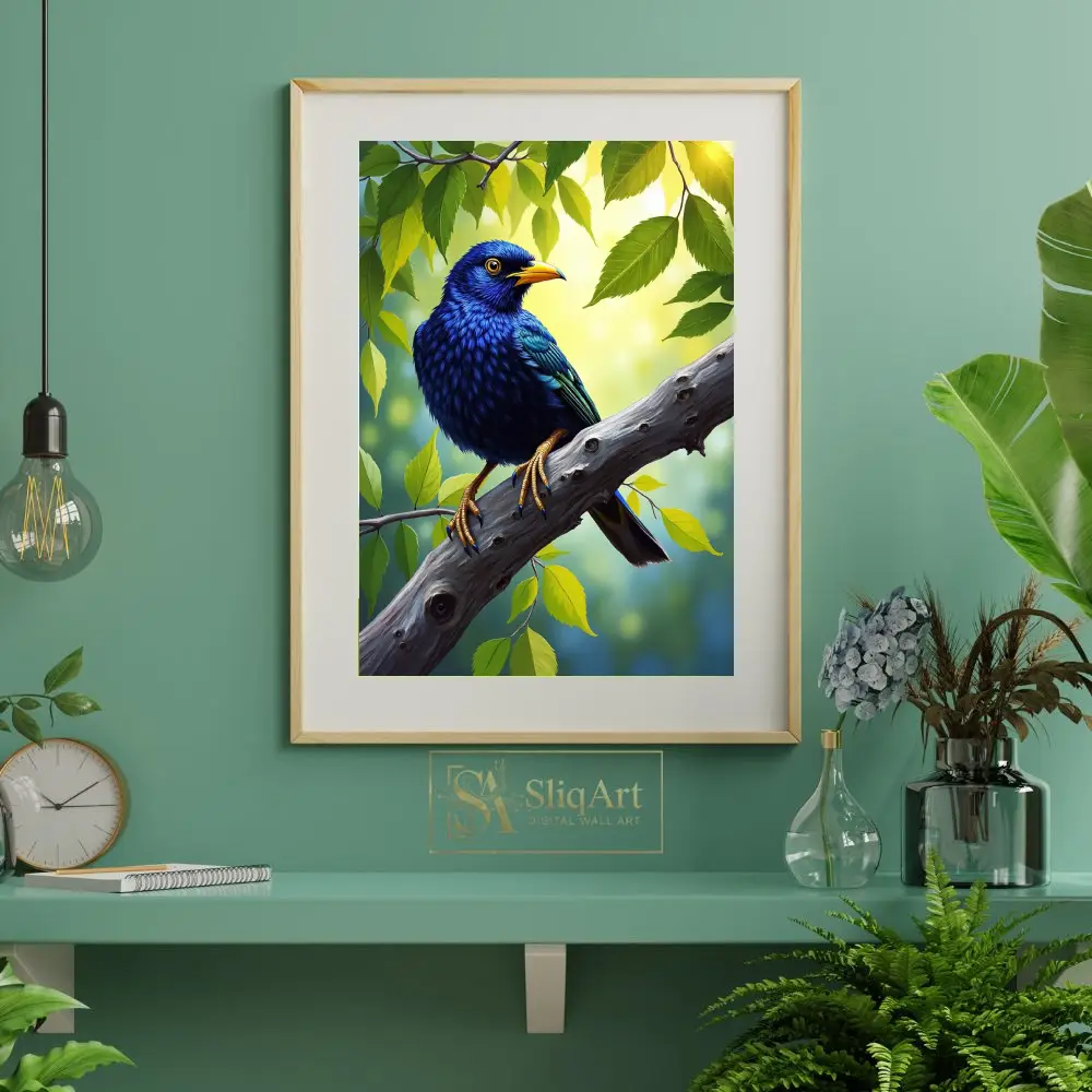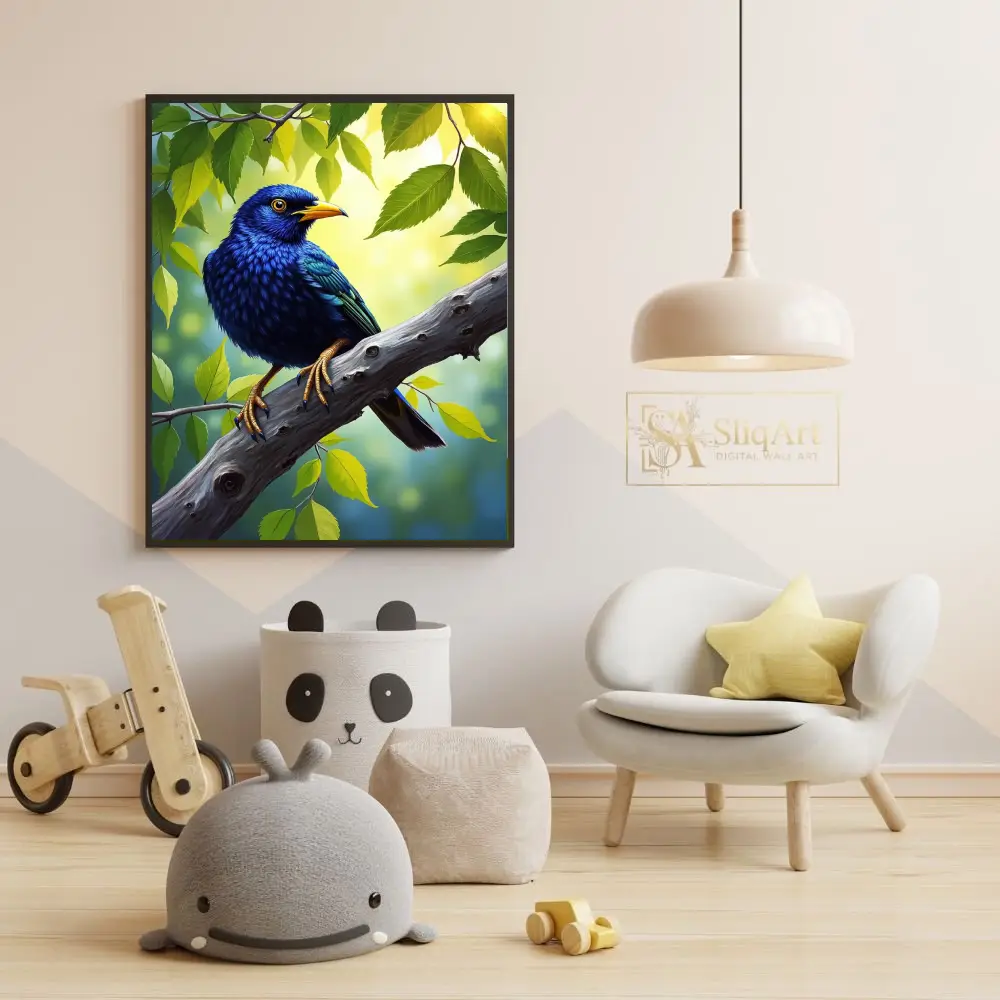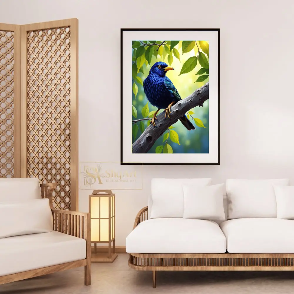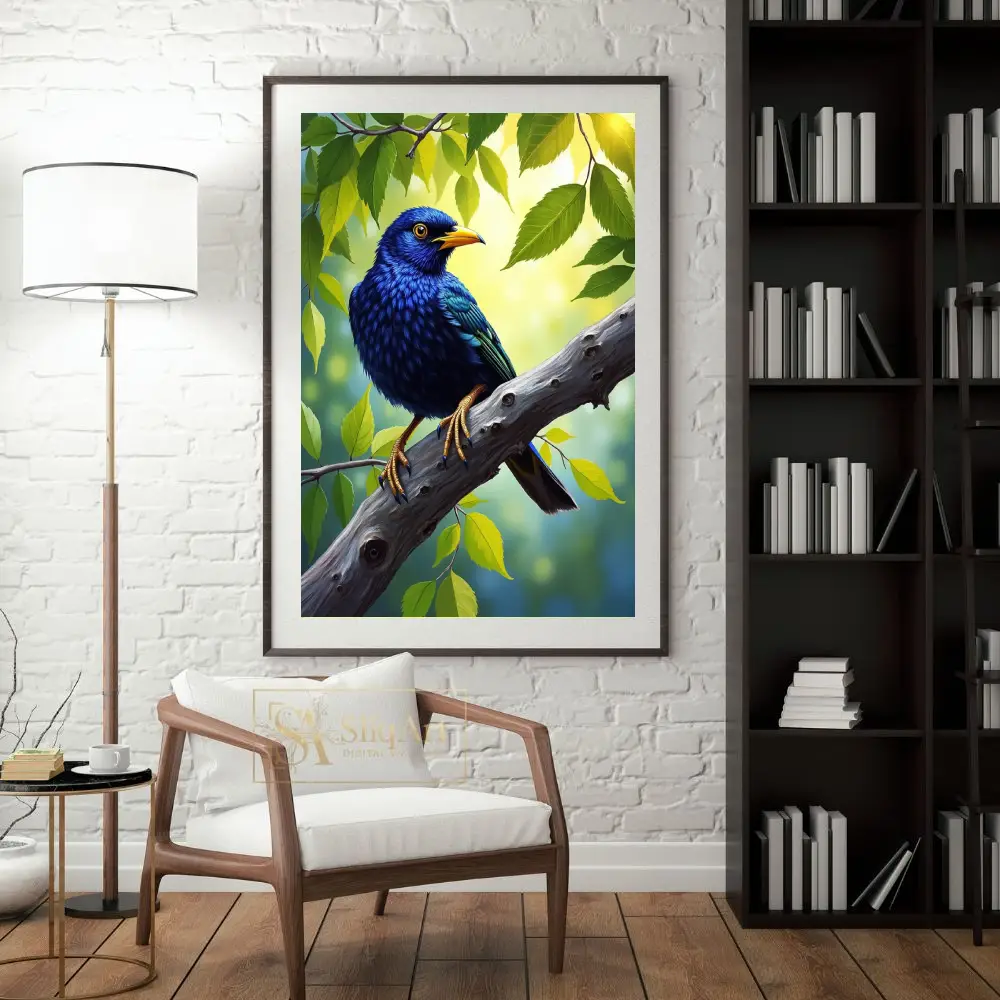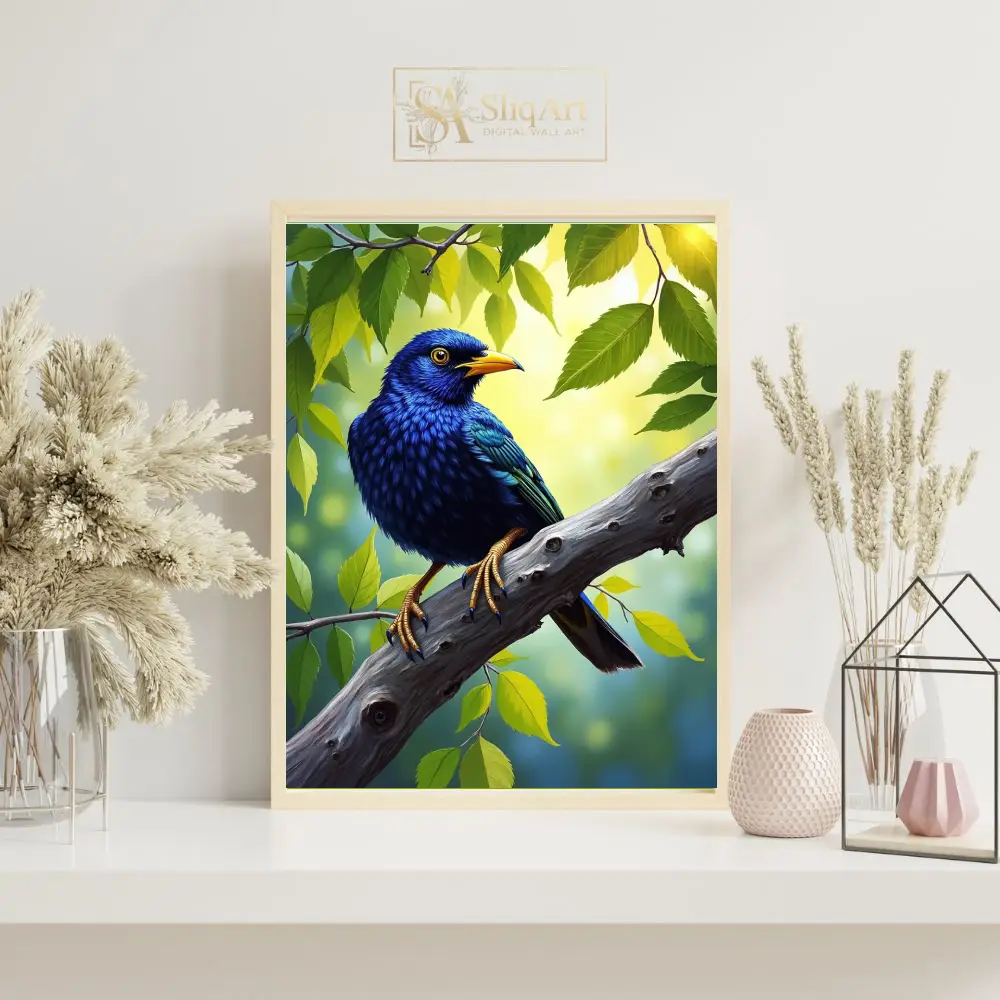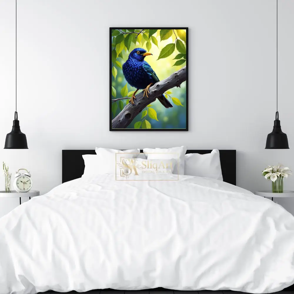 Bring the serene beauty of nature indoors with this stunning digital painting of a cobalt blue bird.