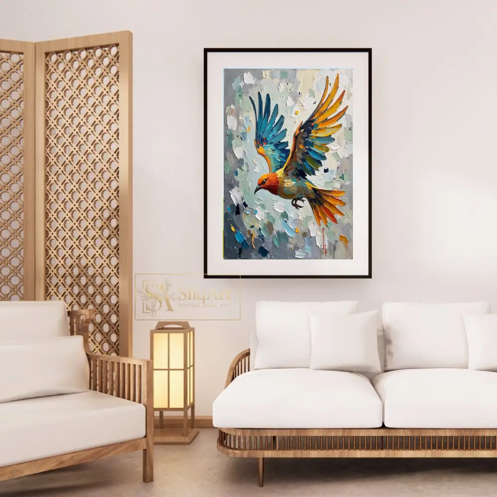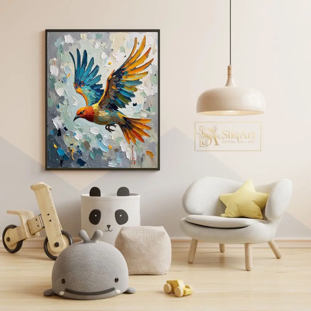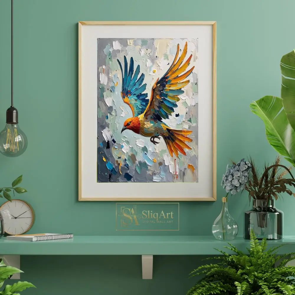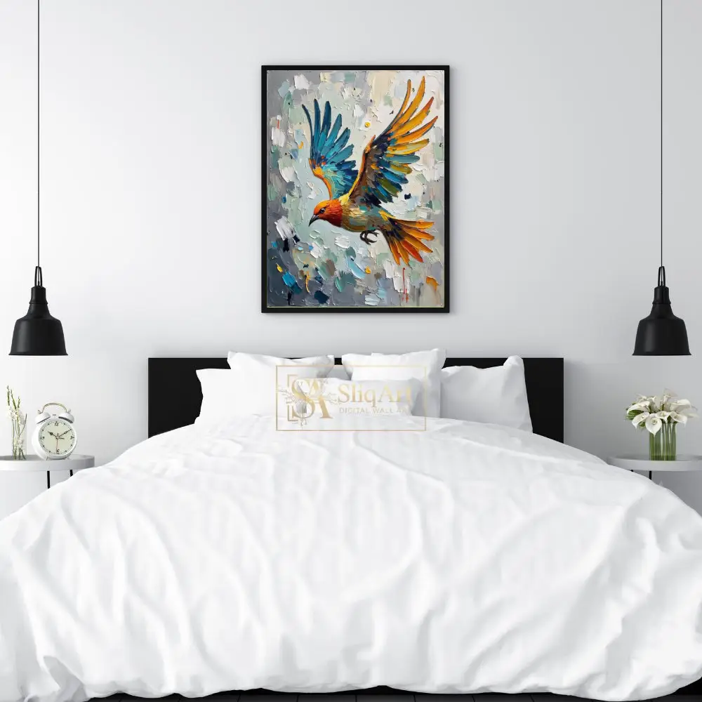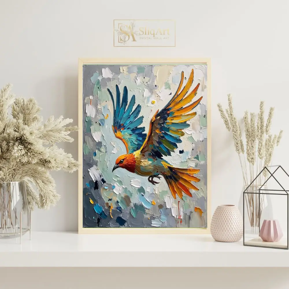 Experience the dynamic energy of nature with this stunning impasto oil painting featuring a vibrant bird in mid-flight. Created with thick, expressive palette knife strokes, the artwork showcases a brilliant interplay of oceanic blues, fiery oranges, and sunny yellows against a textured neutral background.