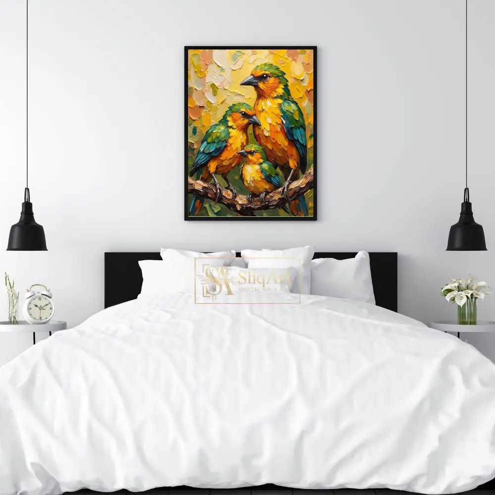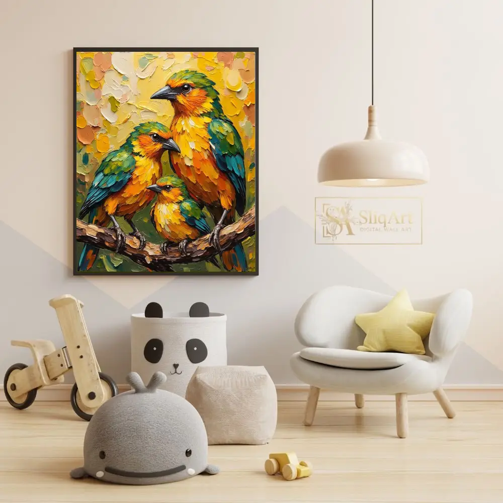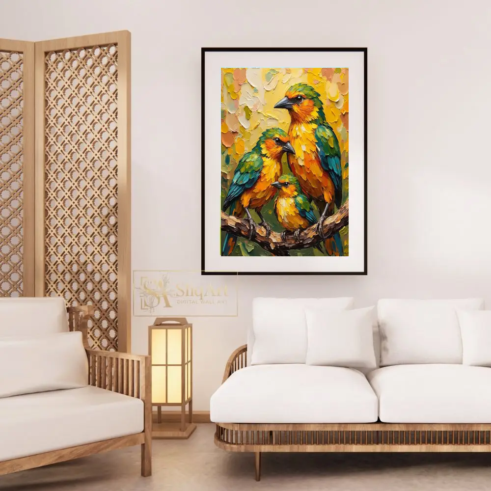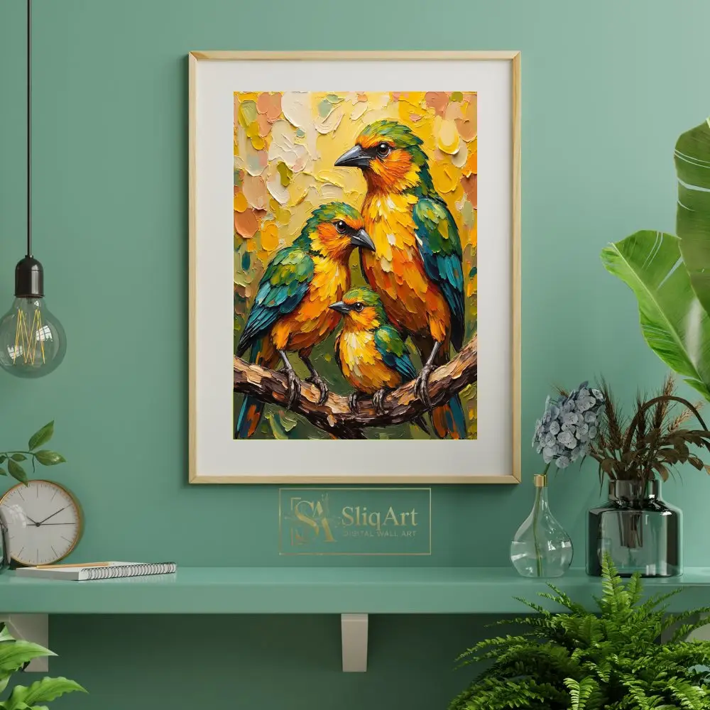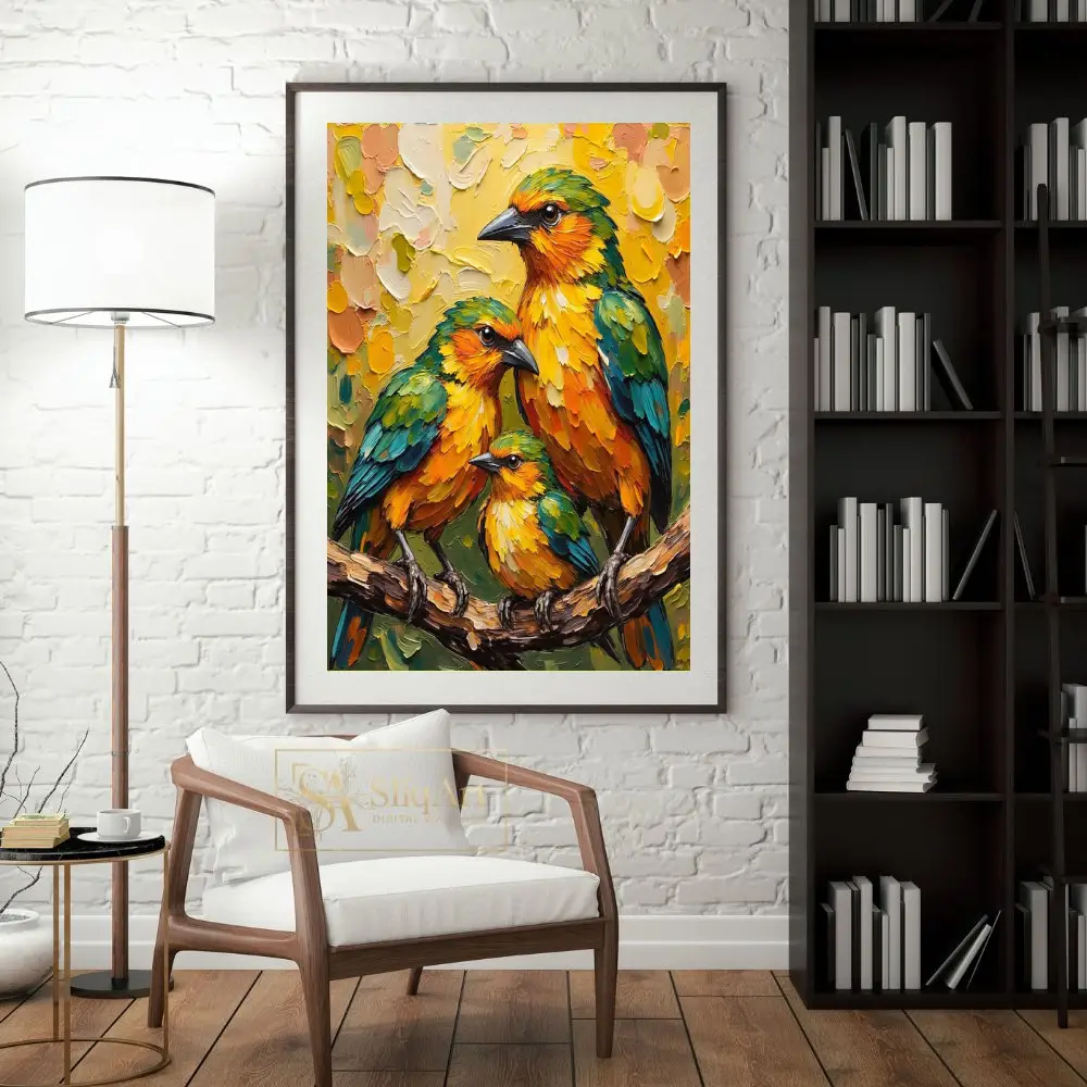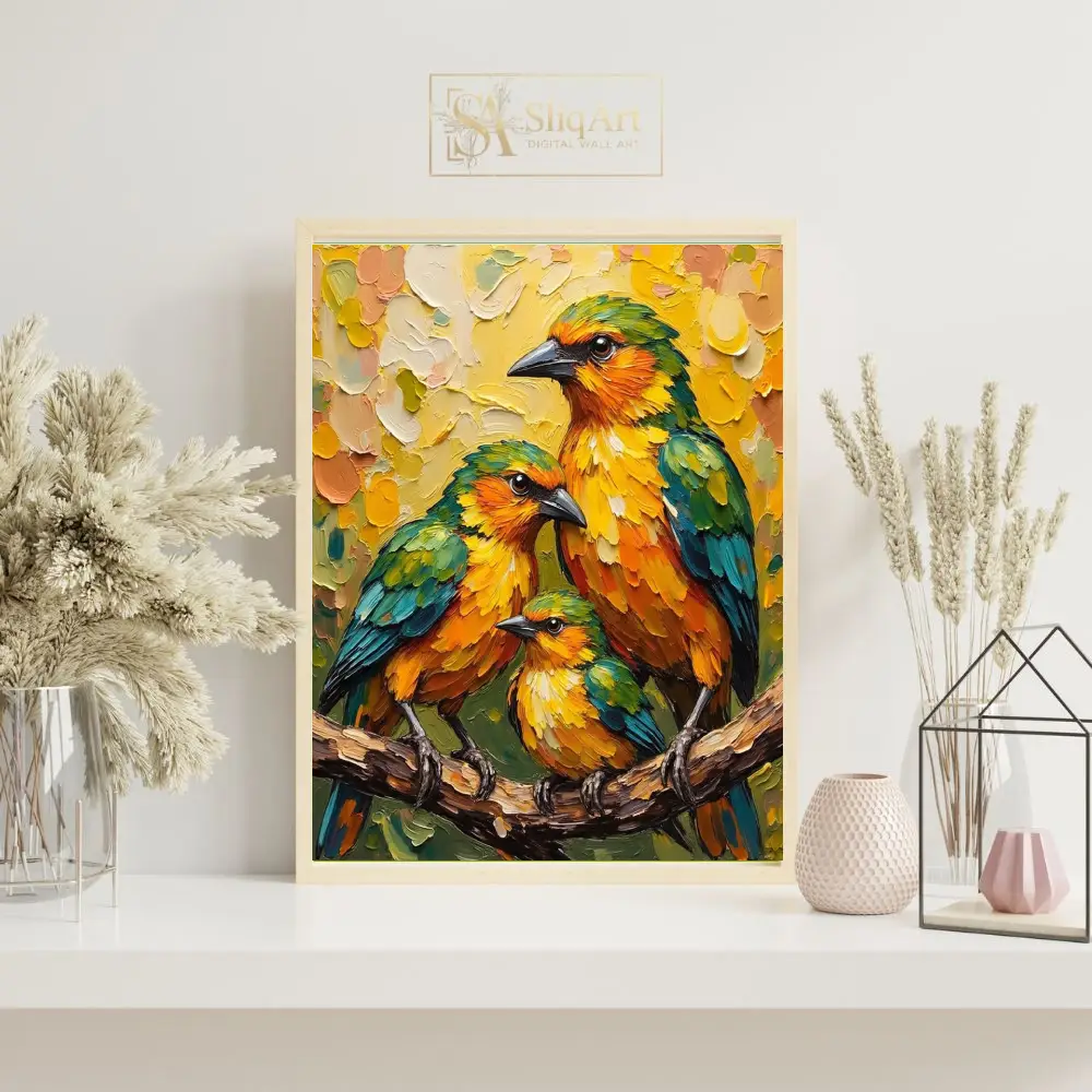 Bring the energy of nature into your home with this exquisite impasto oil painting. Featuring a trio of colorful birds perched together on a rustic branch, this artwork is a celebration of life and companionship.