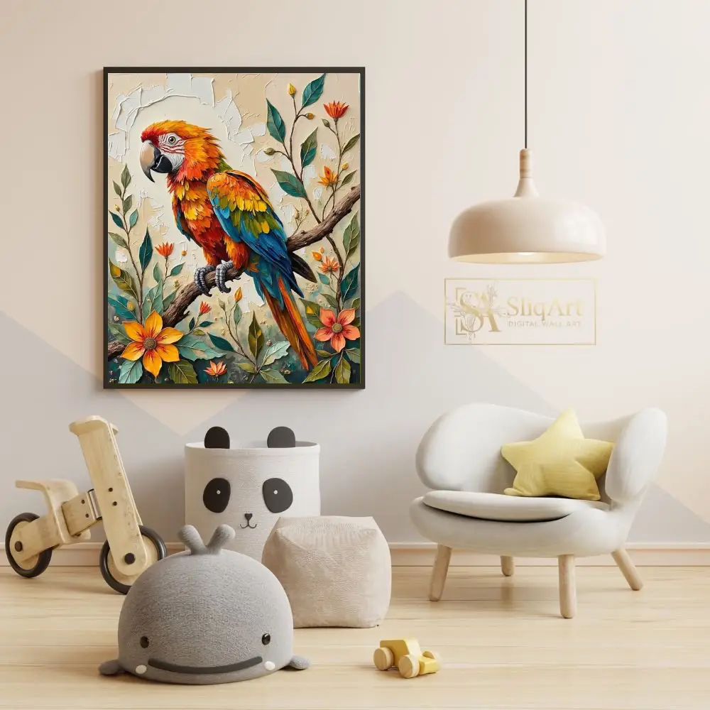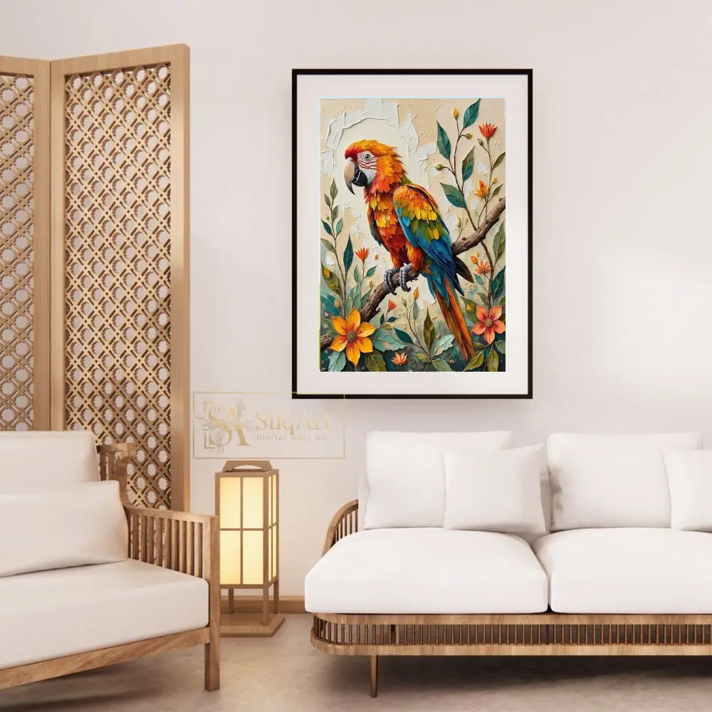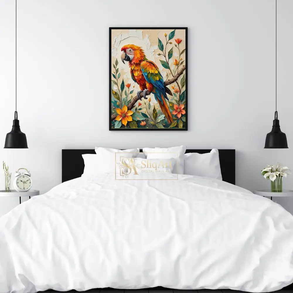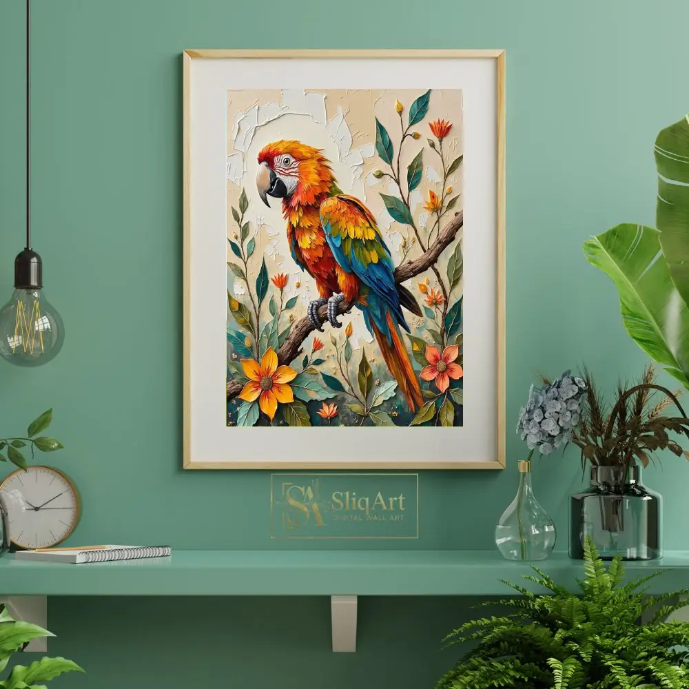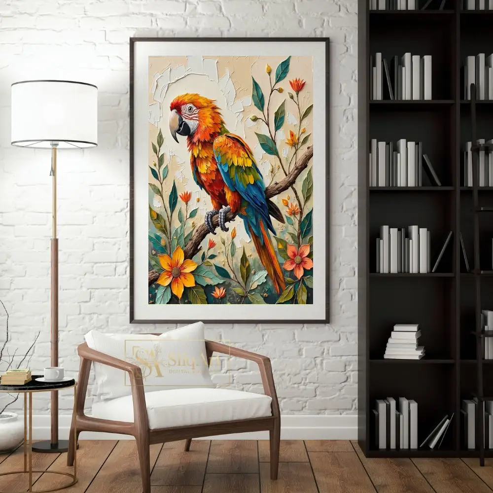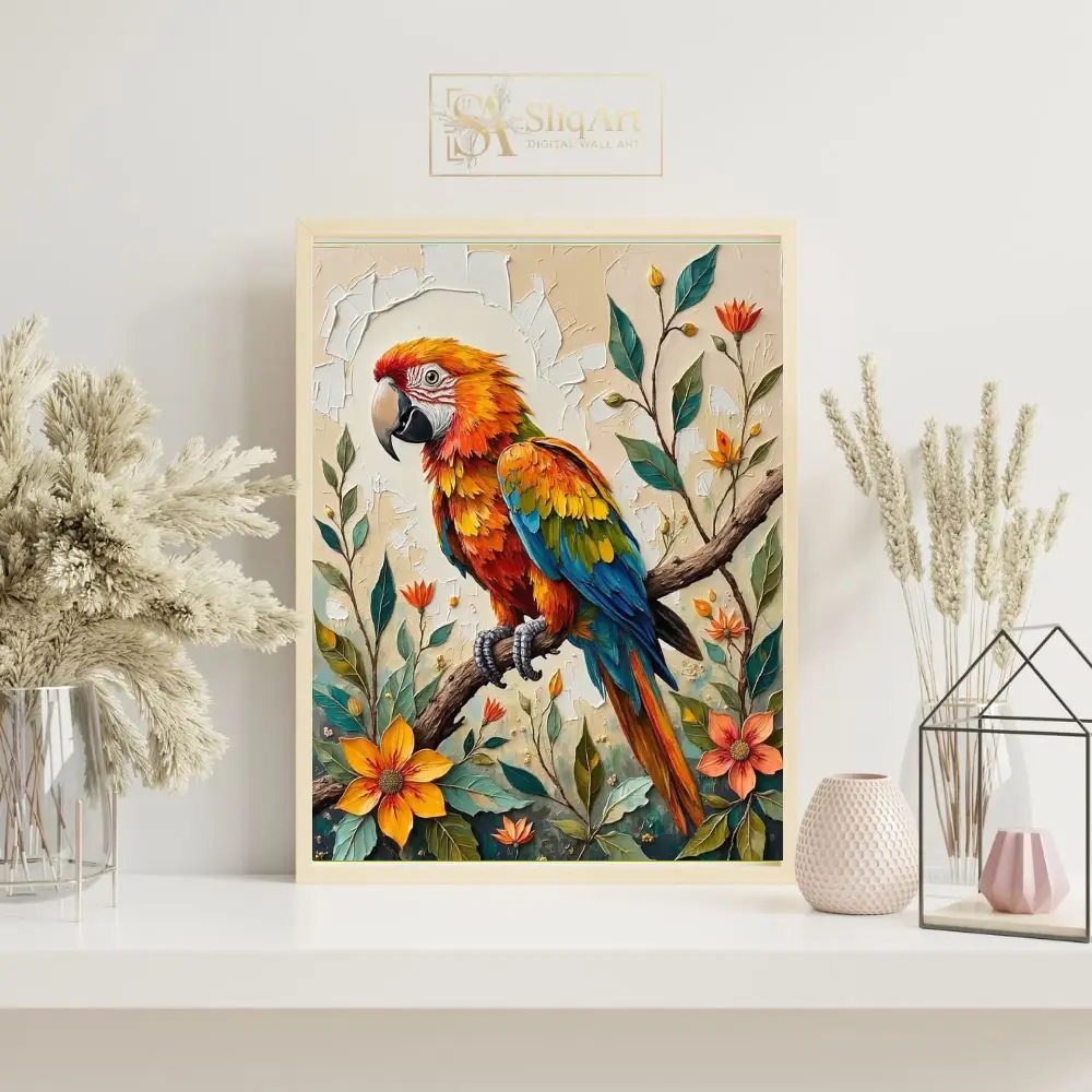 Add a burst of tropical energy to your space with this stunning impasto-style painting of a colorful macaw. The artwork features a brilliantly feathered parrot perched elegantly on a branch, surrounded by lush tropical flowers and foliage.