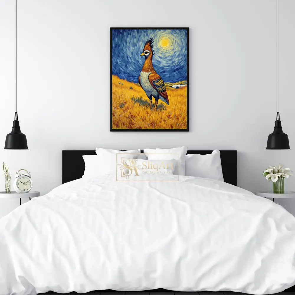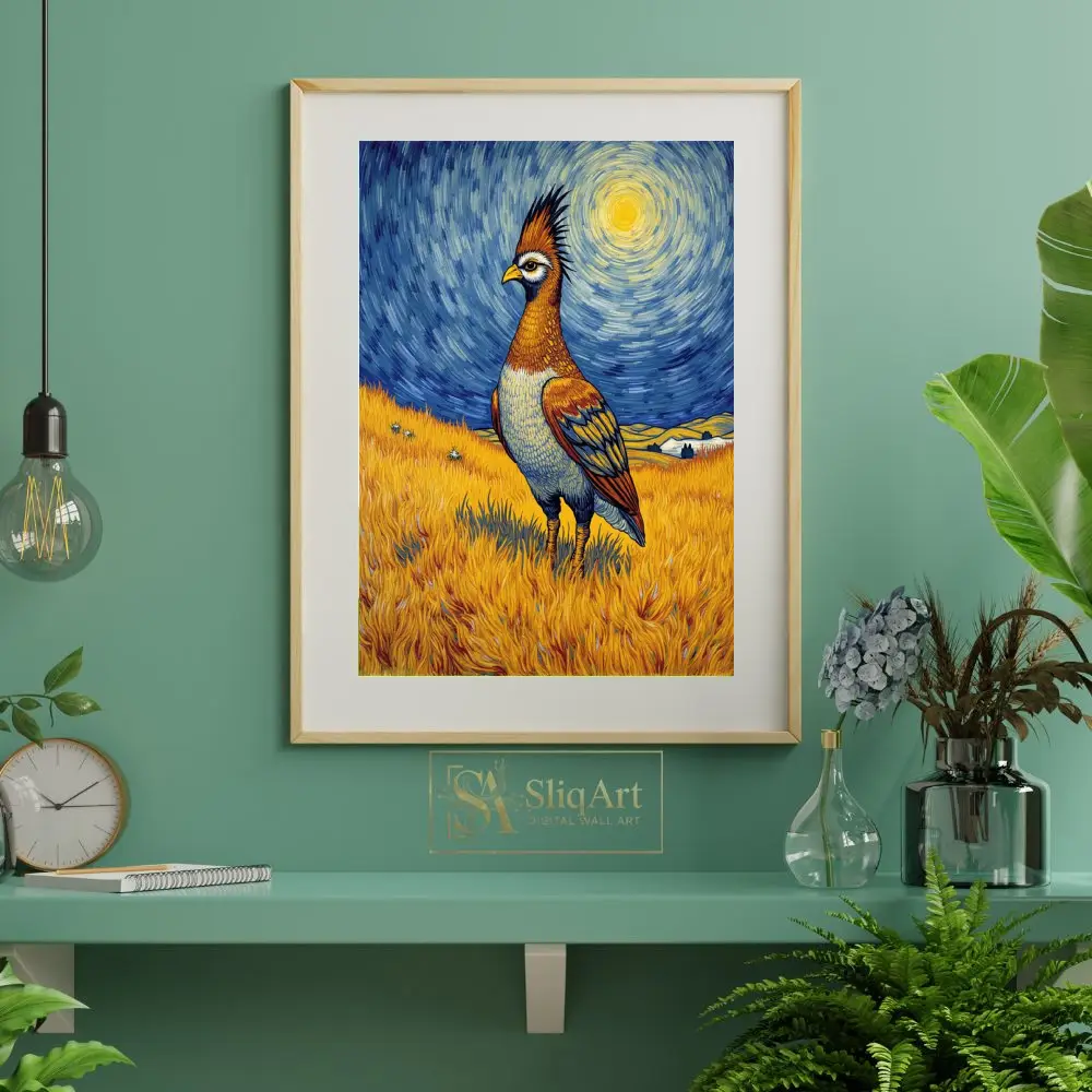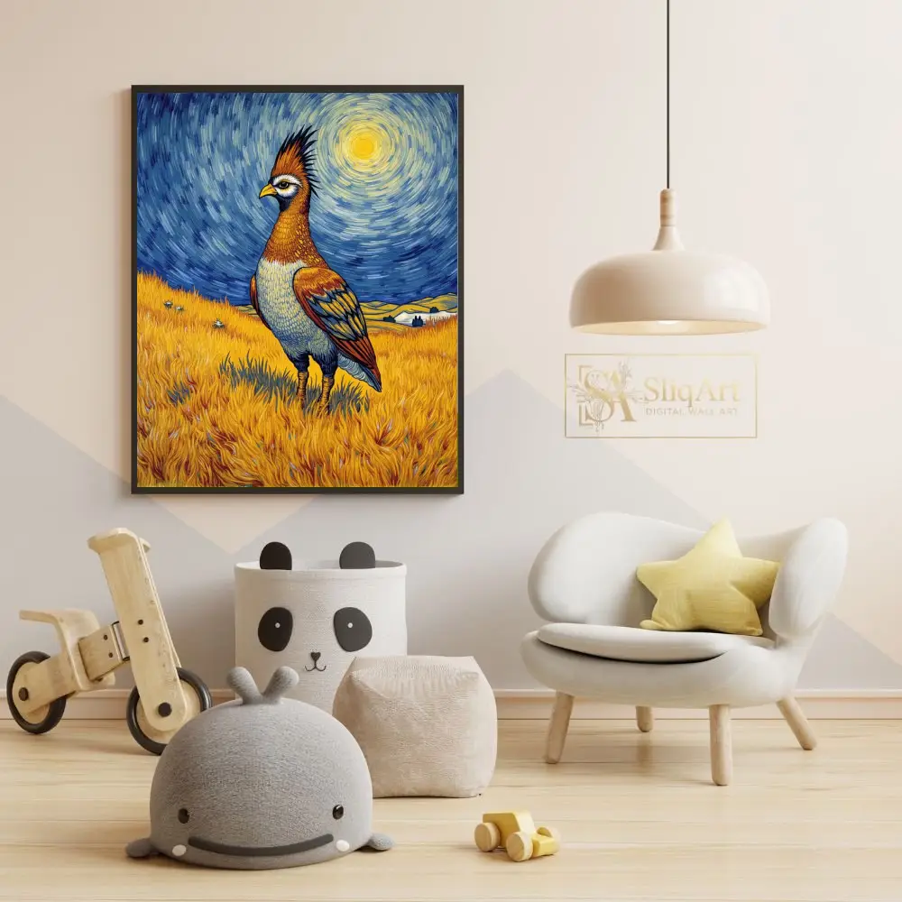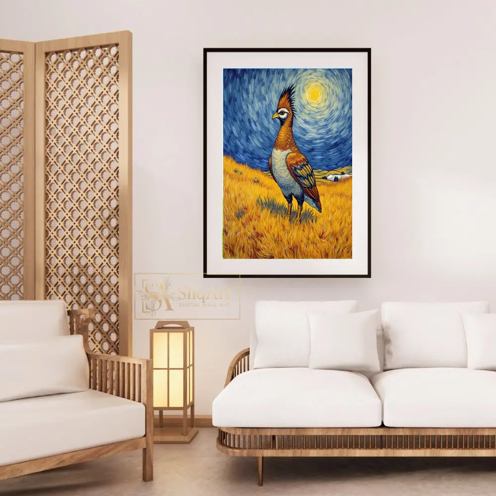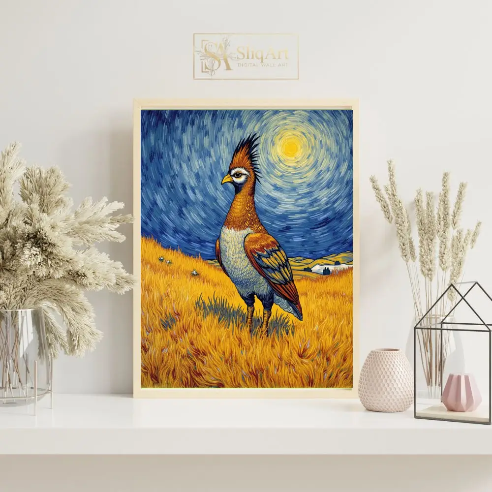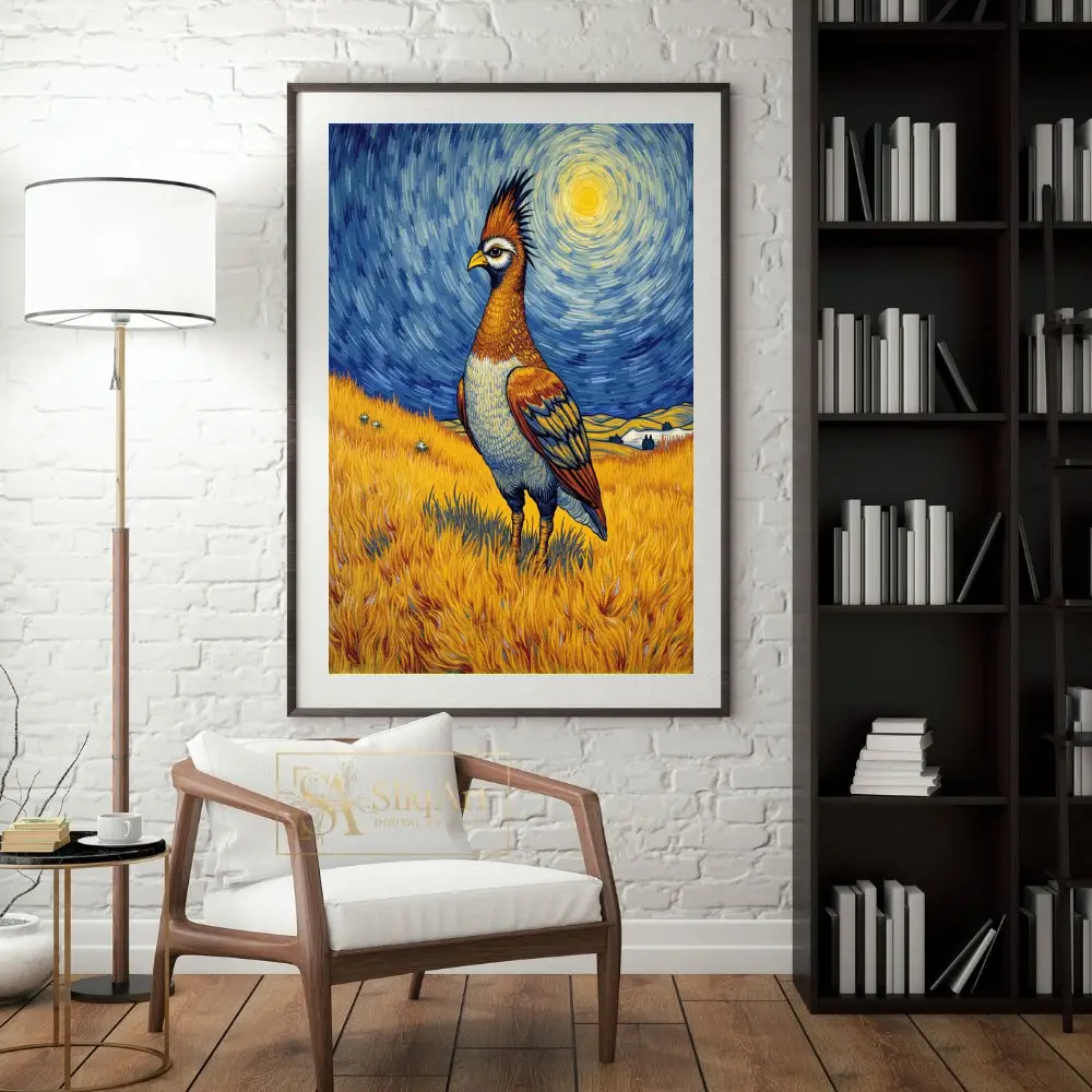 Elevate your interior decor with this mesmerizing post-impressionist inspired masterpiece. This artwork features a majestic crested bird standing tall in a vibrant, golden field, set against a dramatic swirling sky reminiscent of Van Gogh’s ‘The Starry Night’.