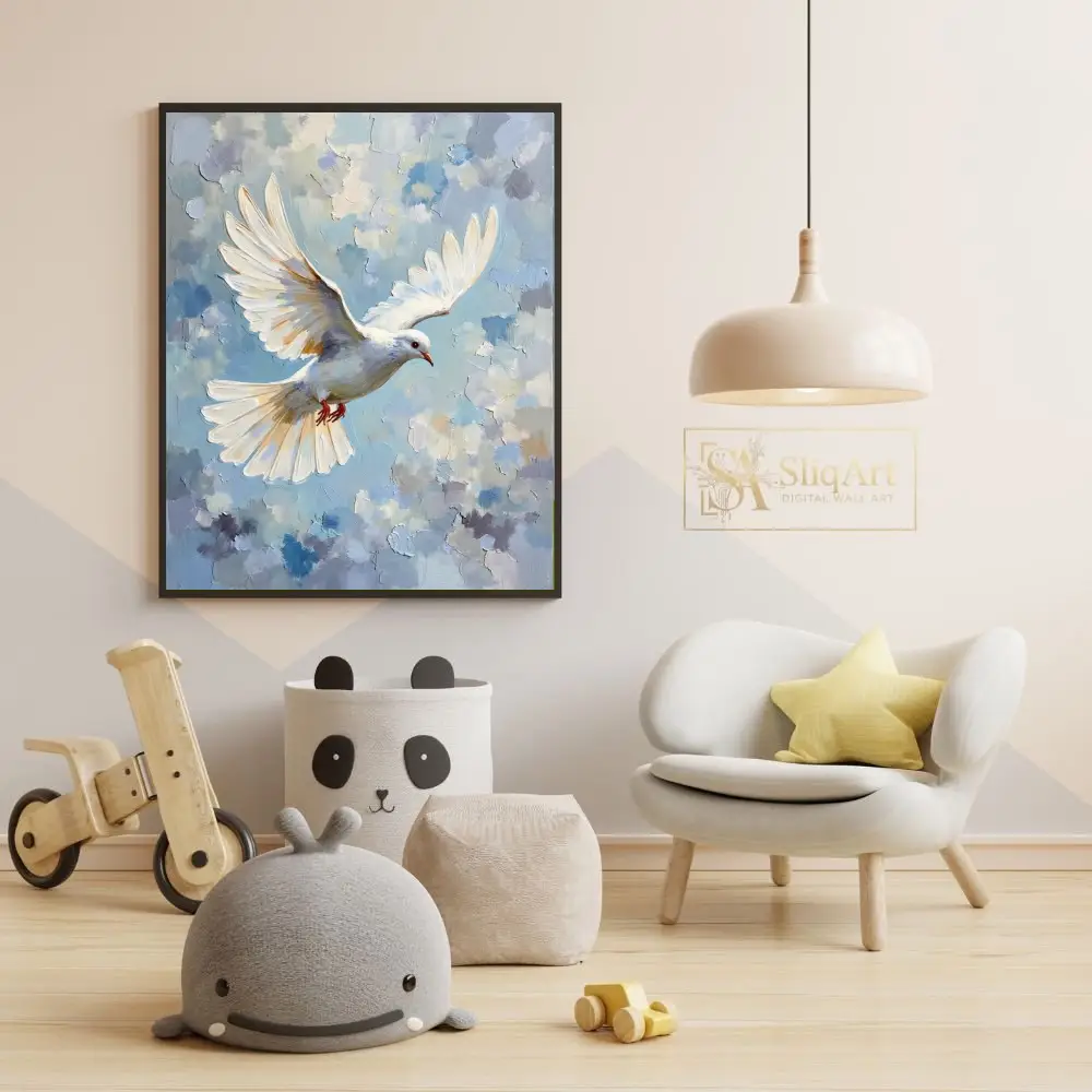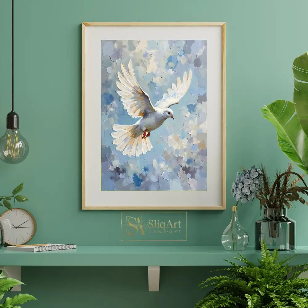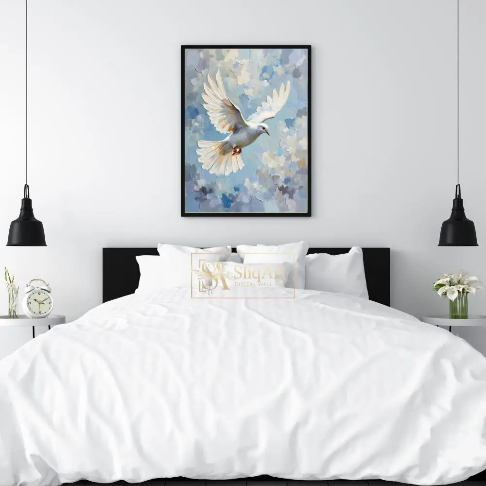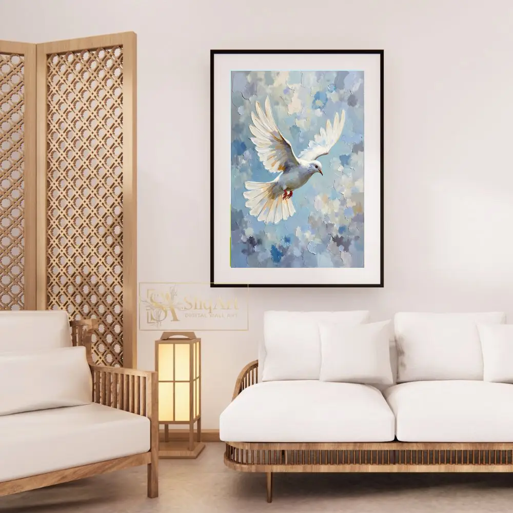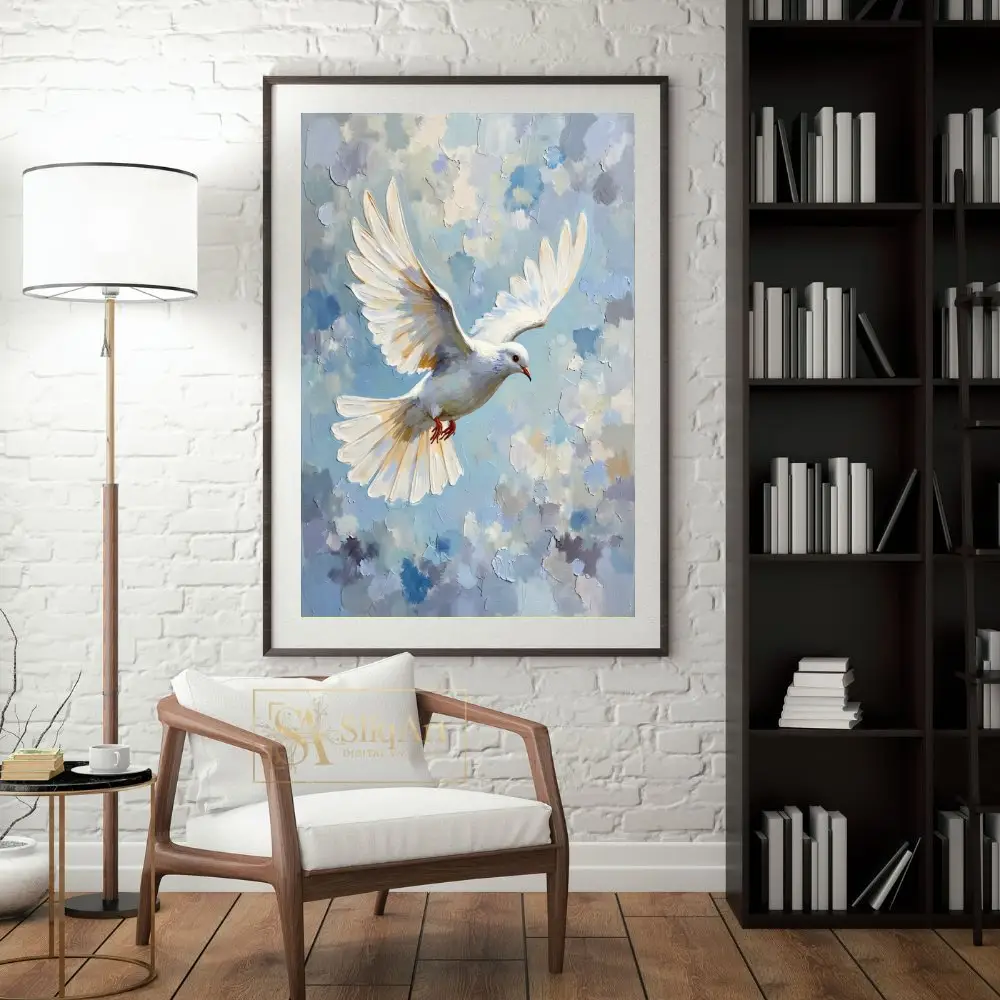 The bird’s wings are beautifully rendered with golden highlights, making this piece a radiant addition to any room. This artwork serves as a daily reminder of hope and tranquility, perfect for those looking to add a touch of serenity to their interior design.