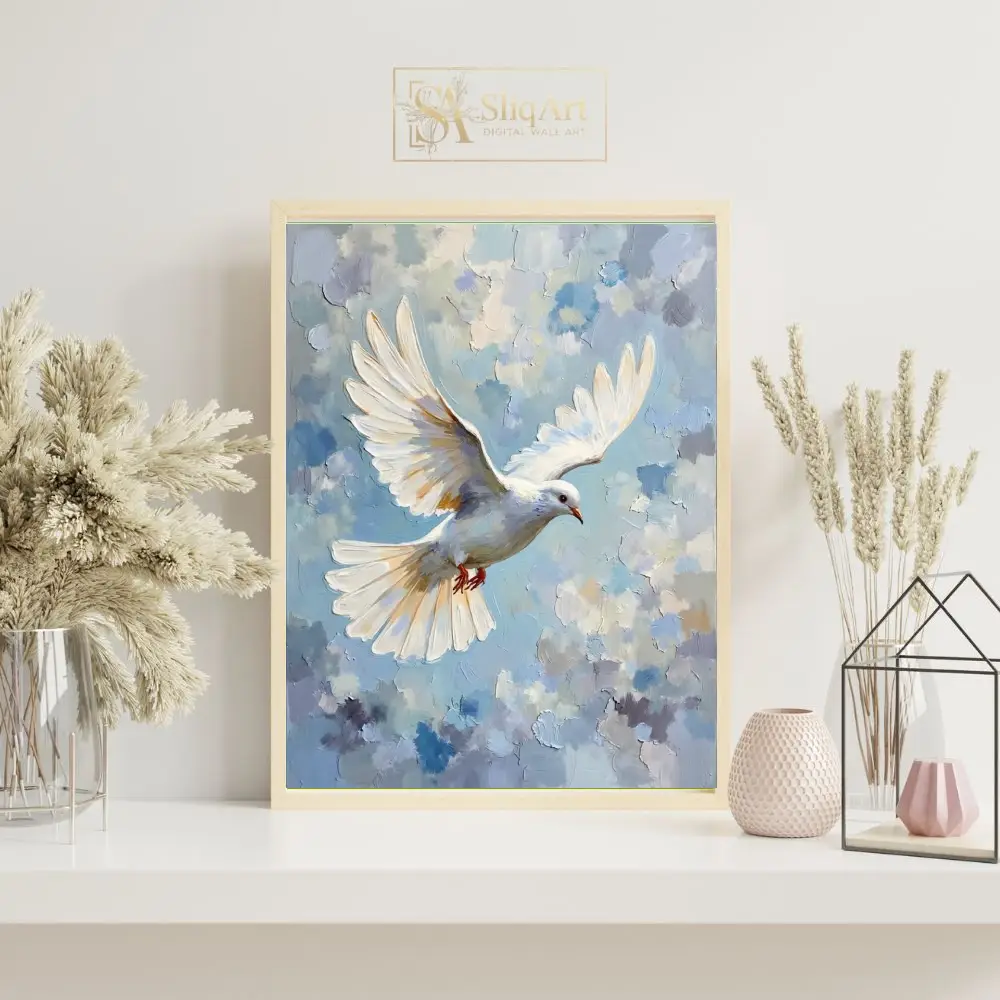 Embodying peace and spiritual grace, this impasto oil painting features a majestic white dove soaring through a cloud-filled sky. The artist uses thick, tactile brushstrokes to create a sense of movement and depth, blending soft blues, lavenders, and whites into a dreamy backdrop.