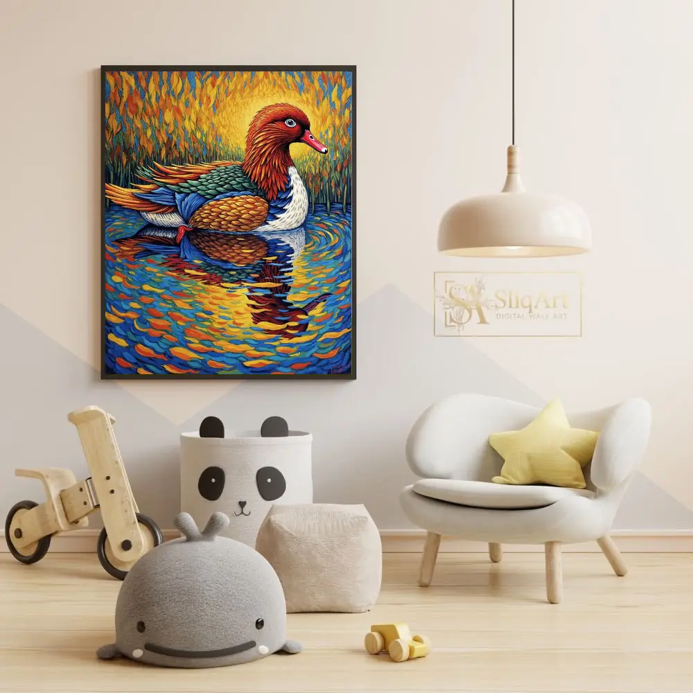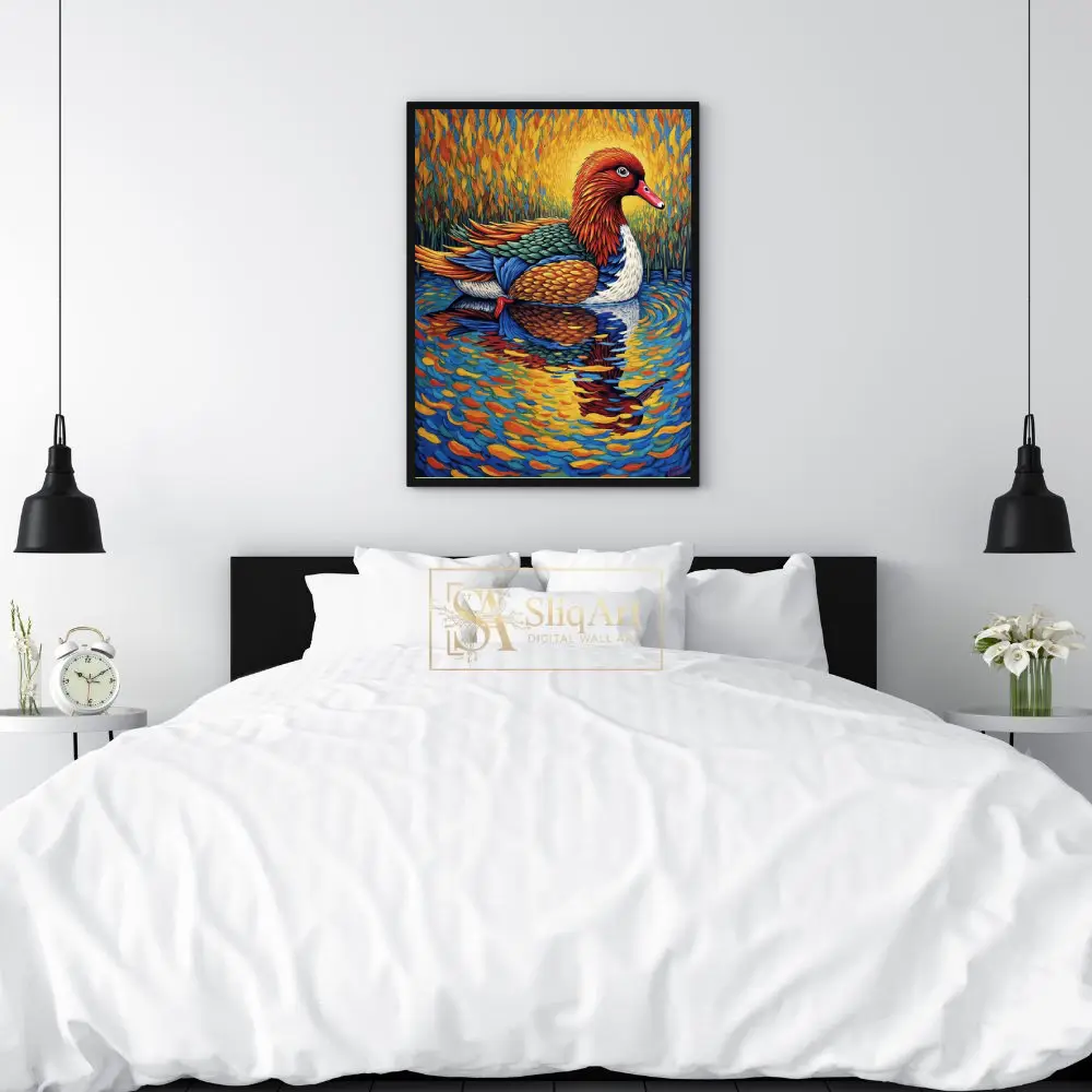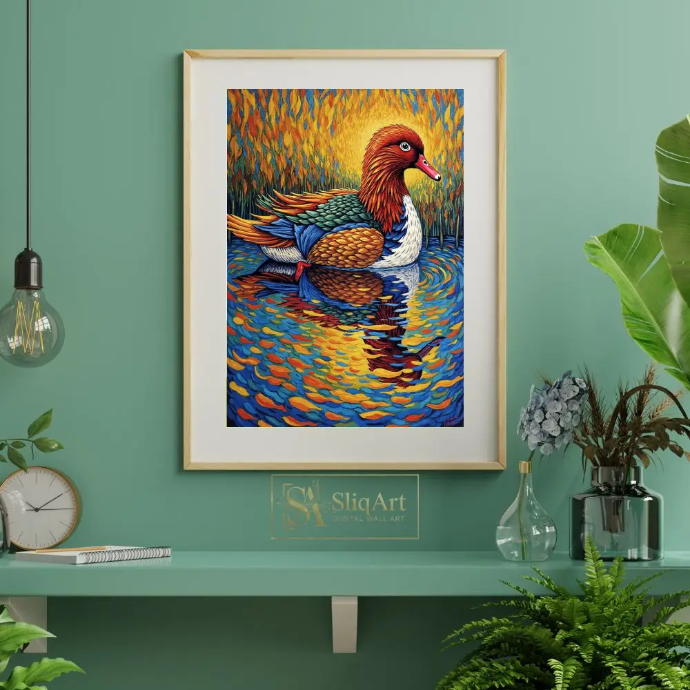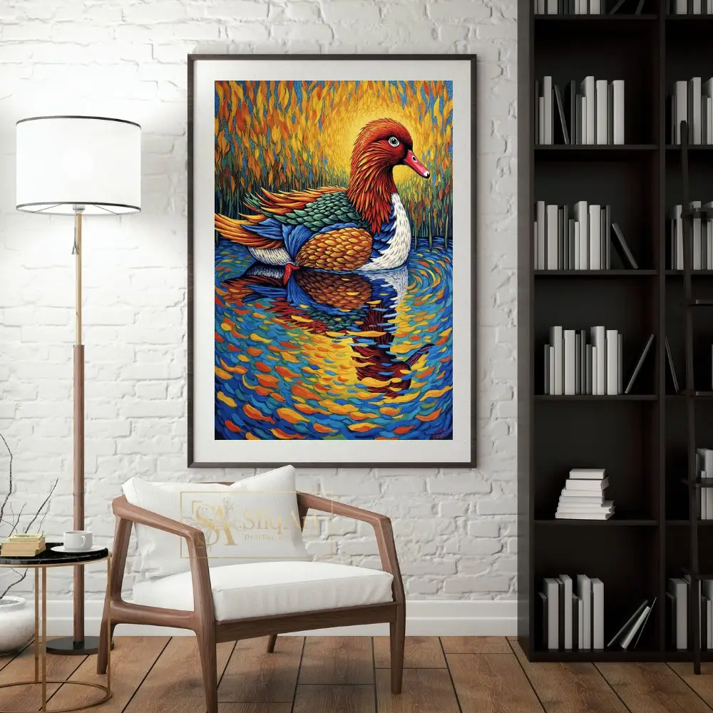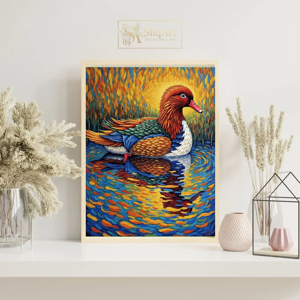 Experience the fusion of nature and bold artistry with this stunning post-impressionist duck painting. Capturing a majestic waterfowl gliding across a shimmering pond, this piece utilizes thick, rhythmic brushstrokes reminiscent of Van Gogh.