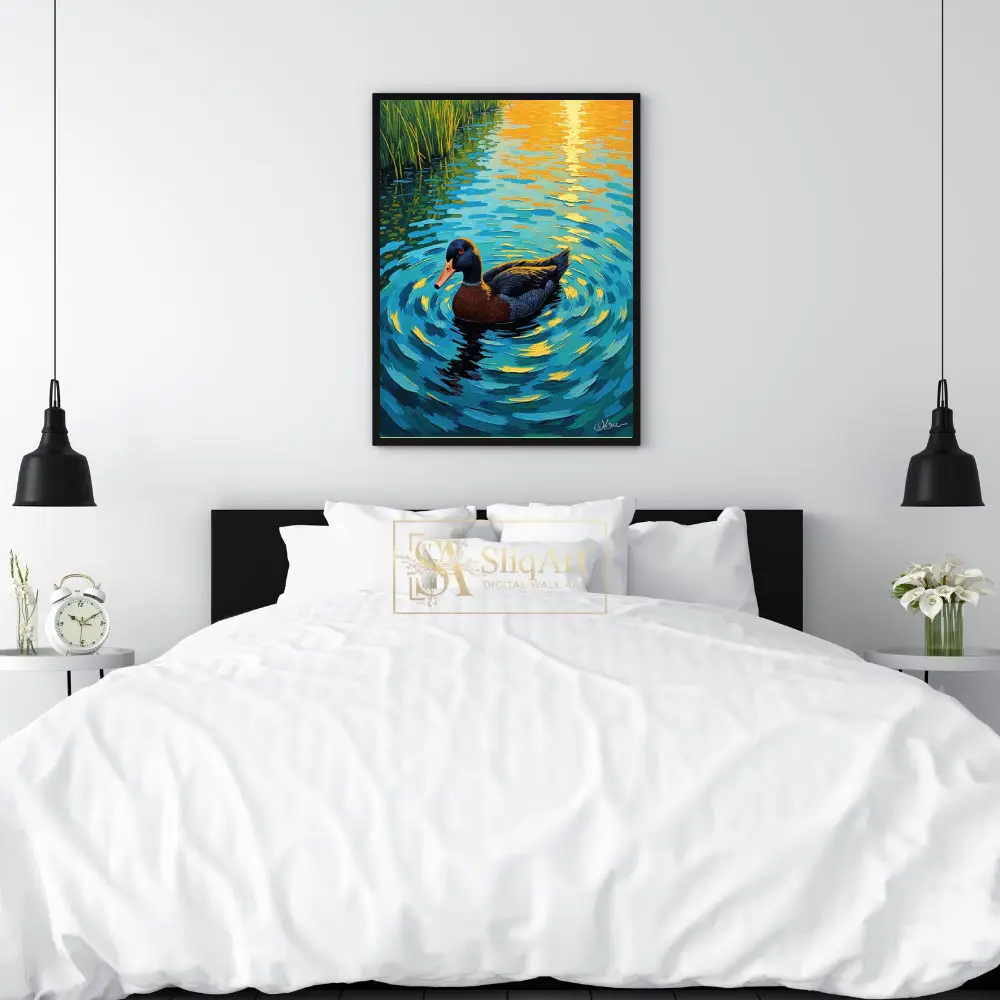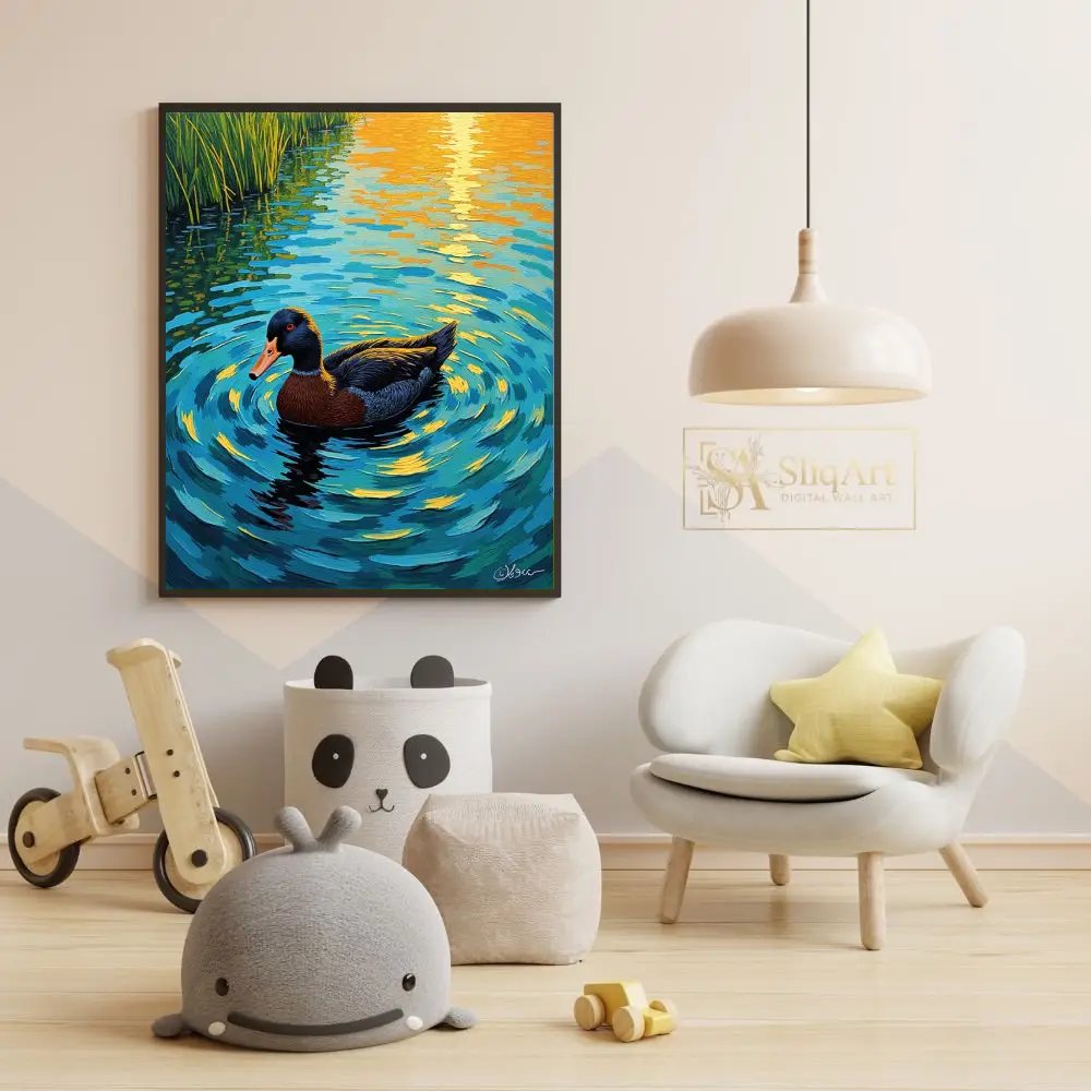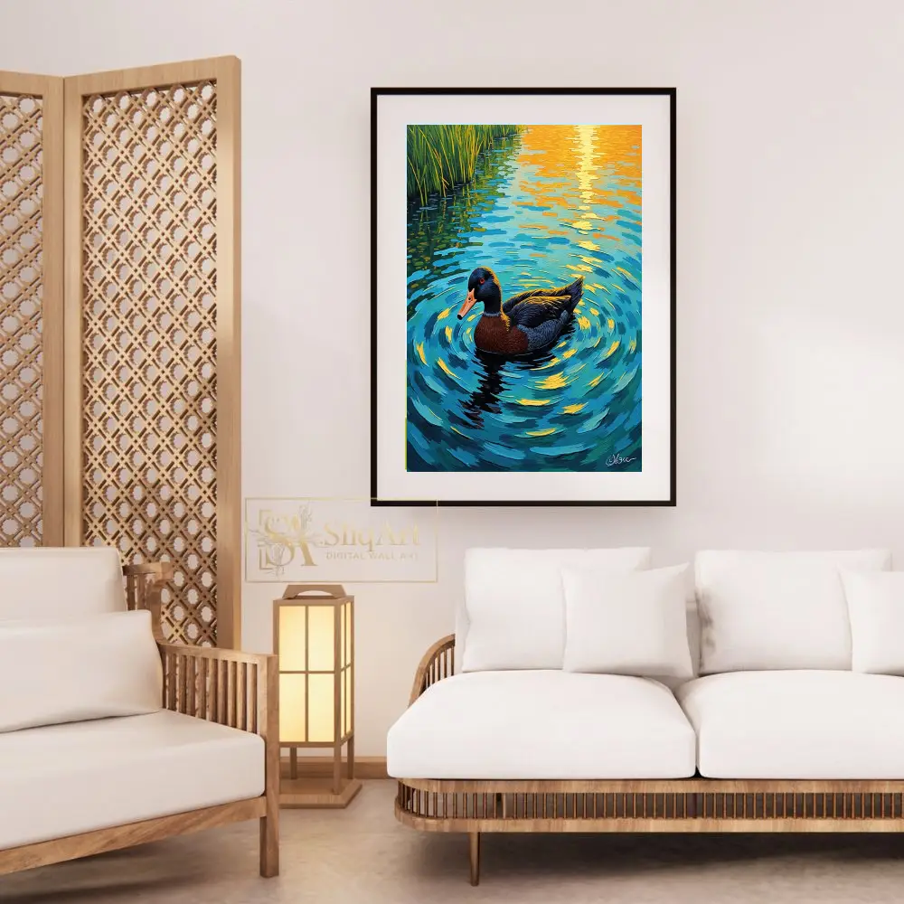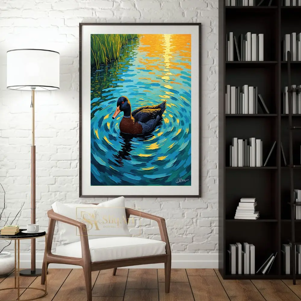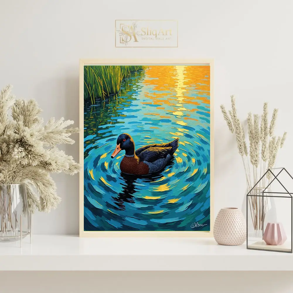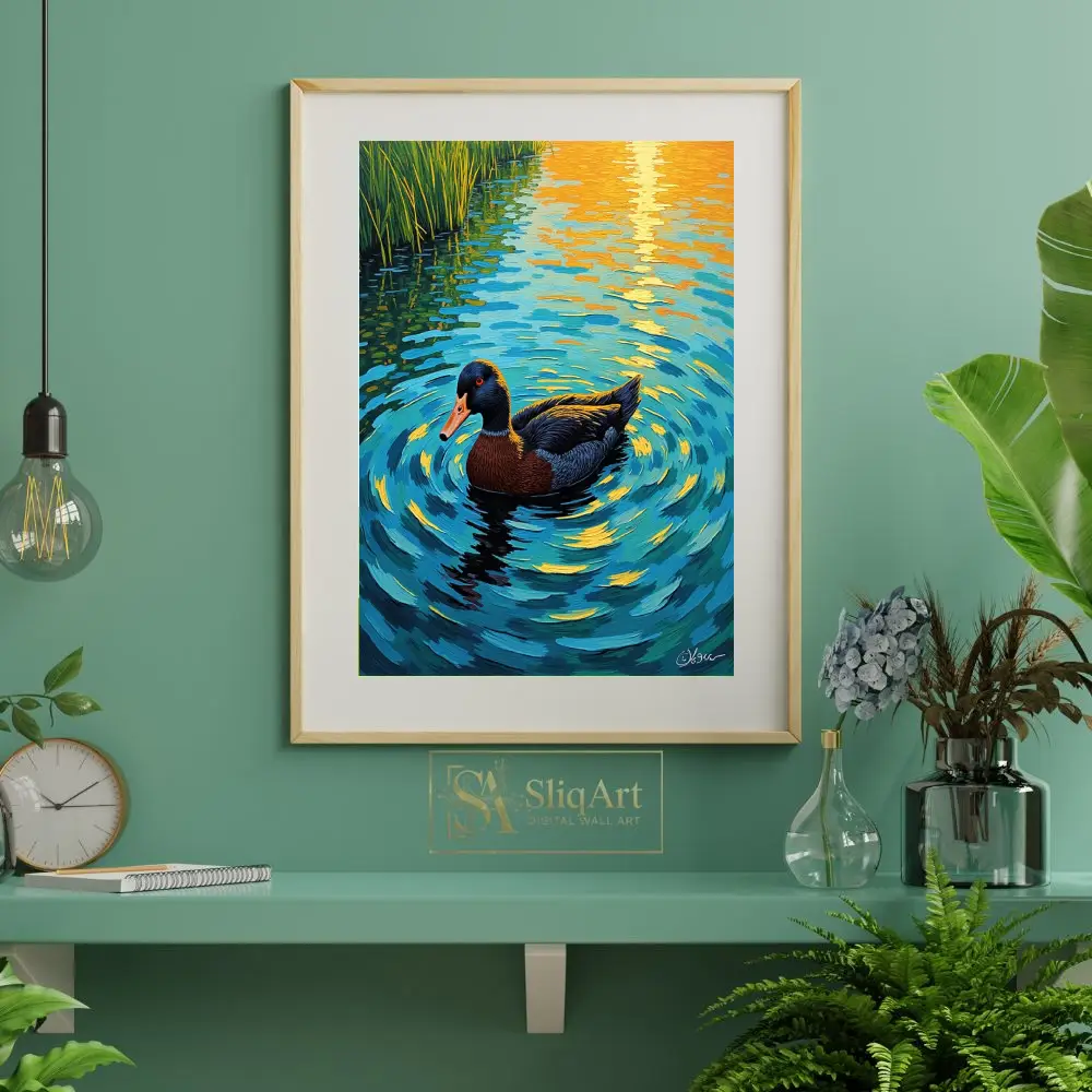 Transform your walls with this breathtaking impressionist portrayal of a duck gliding through a tranquil pond at sunset. The artwork utilizes heavy, textured brushstrokes to create a dynamic sense of movement in the water, capturing the brilliant golden reflections of the sun.