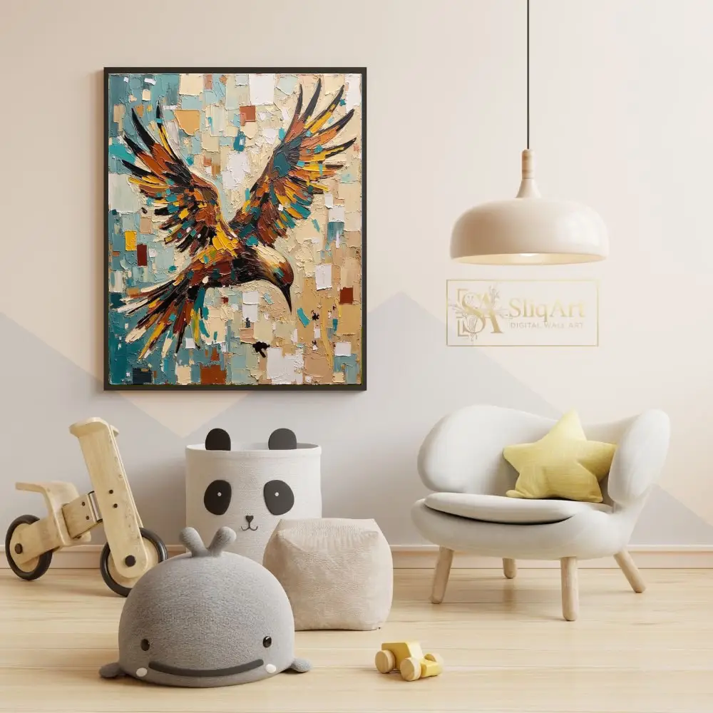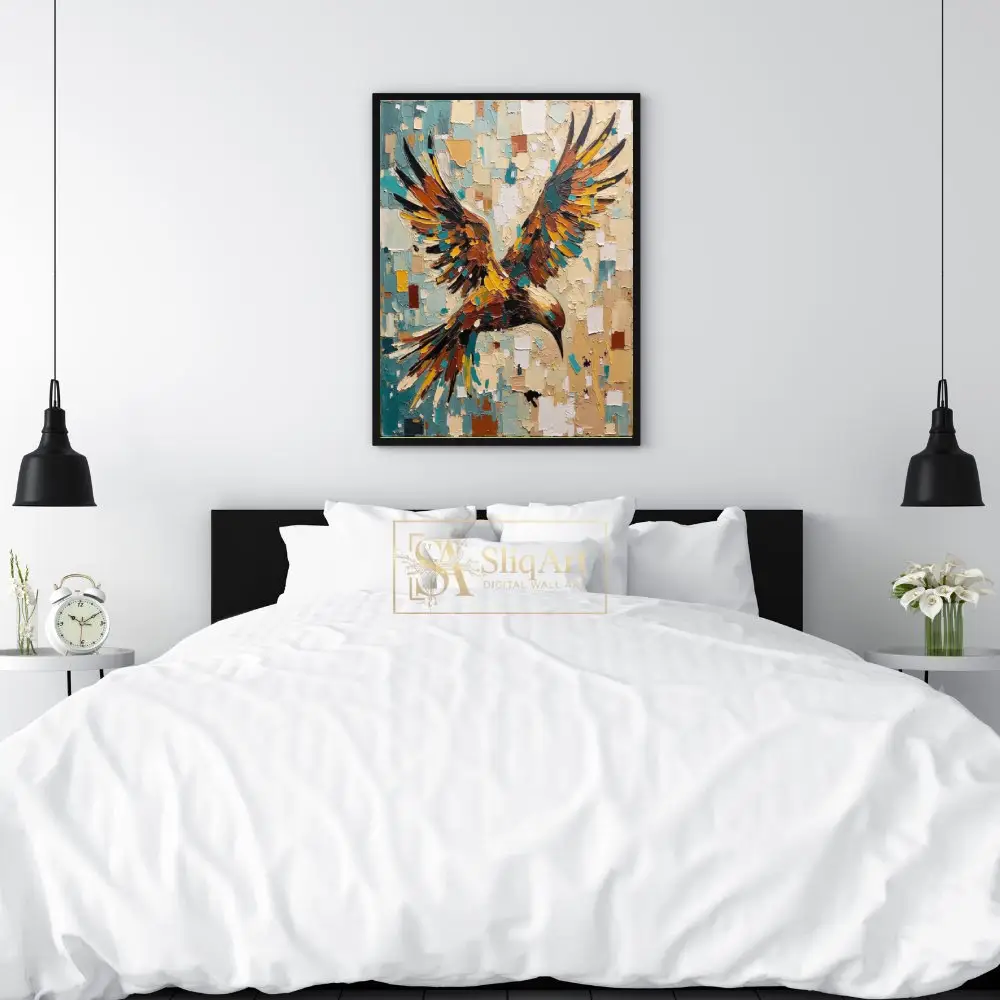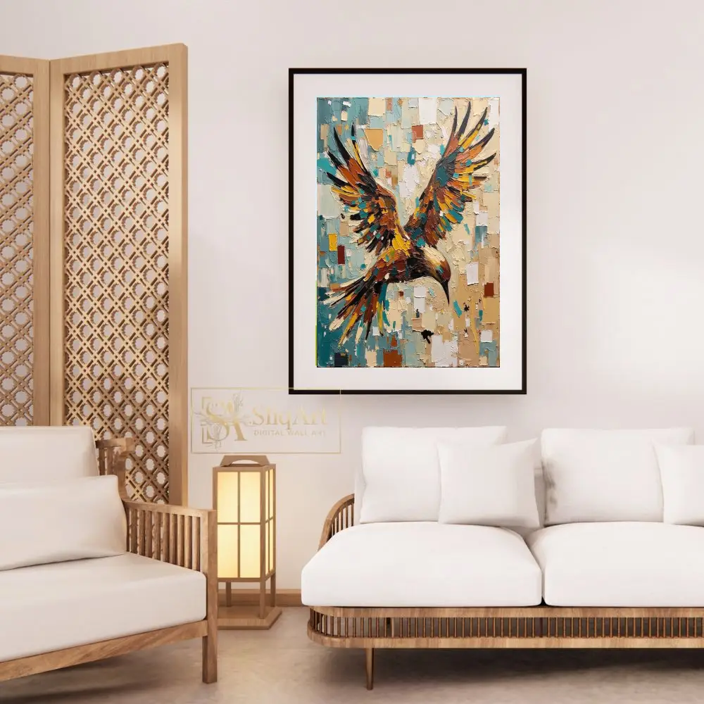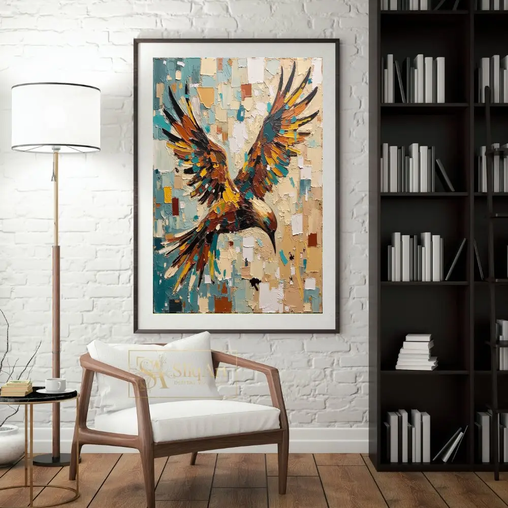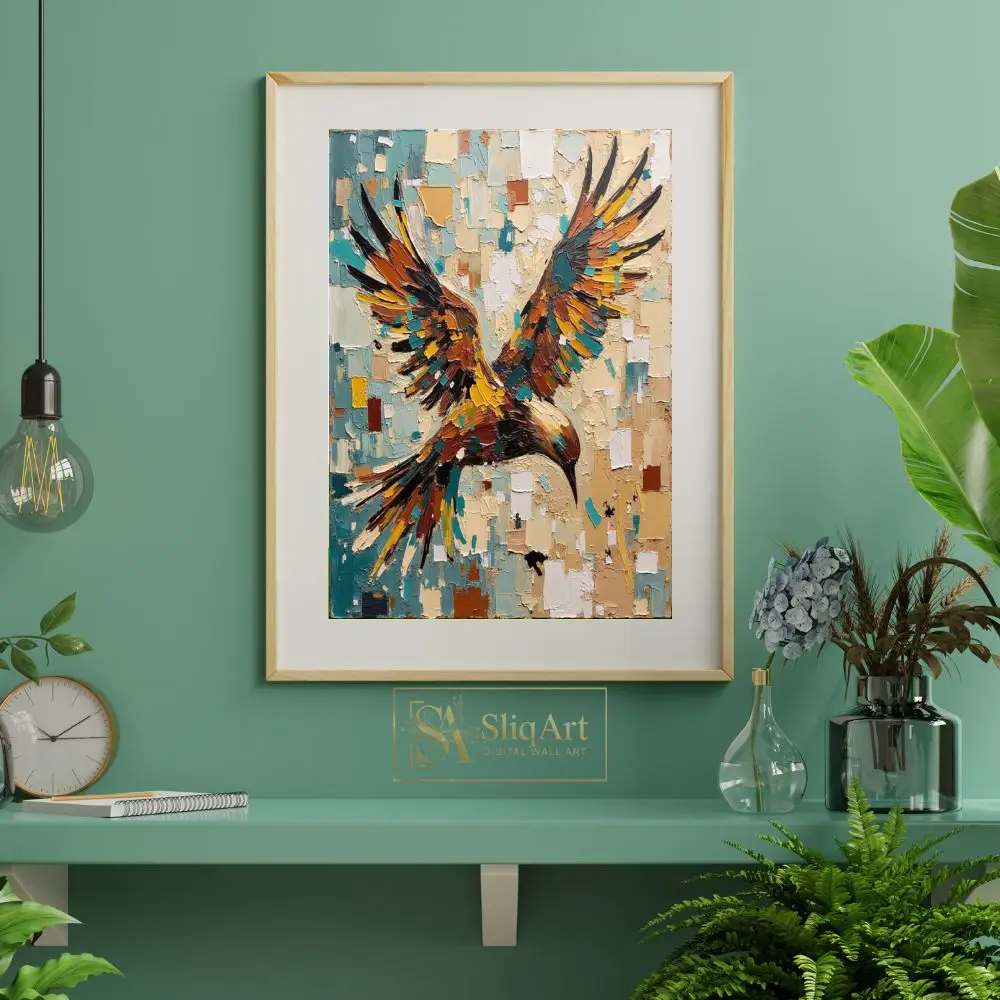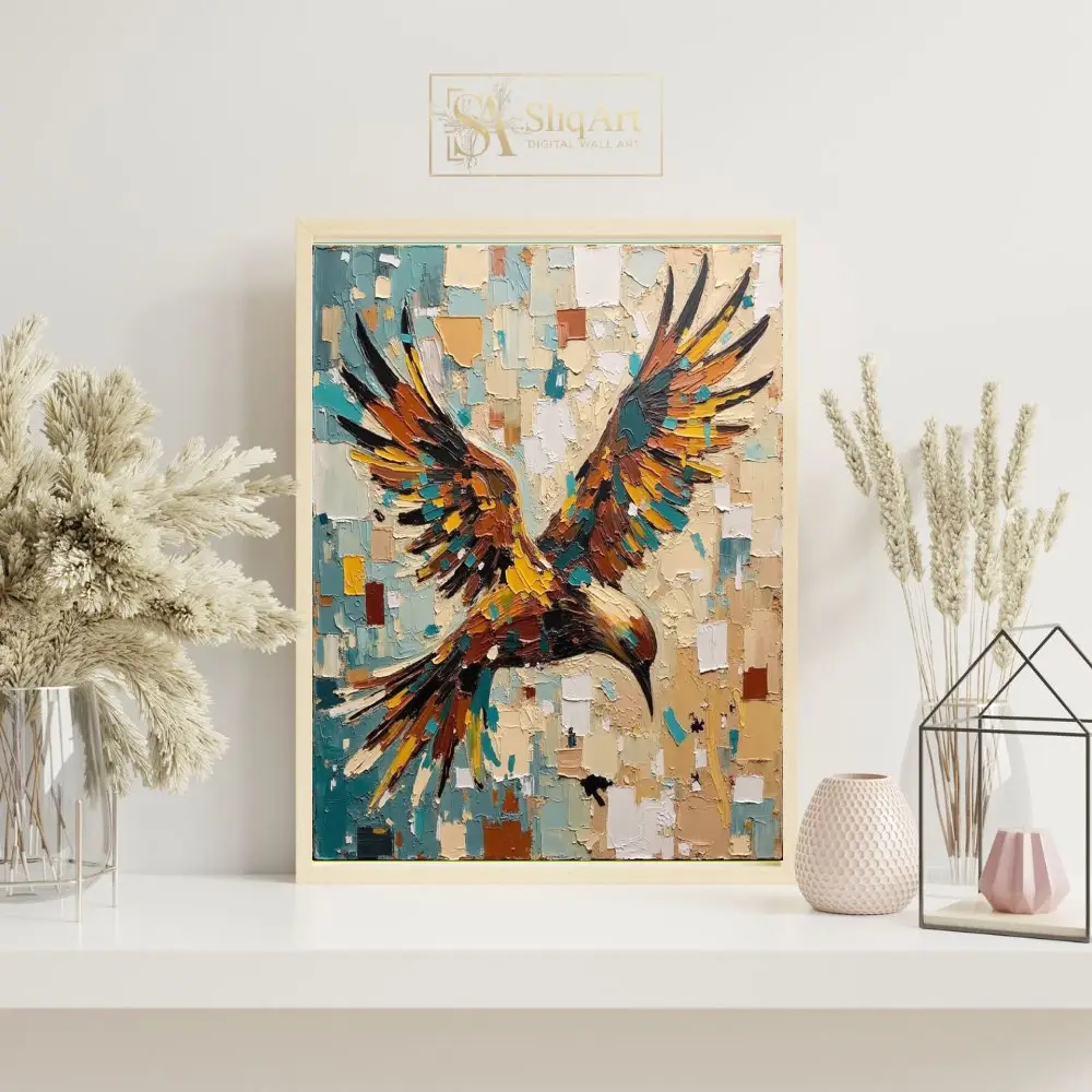 The composition showcases a bird in a powerful mid-dive, rendered in a sophisticated palette of teal, burnt orange, and golden ochre against a mosaic-like background of cream and beige. This piece perfectly balances the wild freedom of nature with modern abstract aesthetics, making it a captivating centerpiece for any contemporary home.