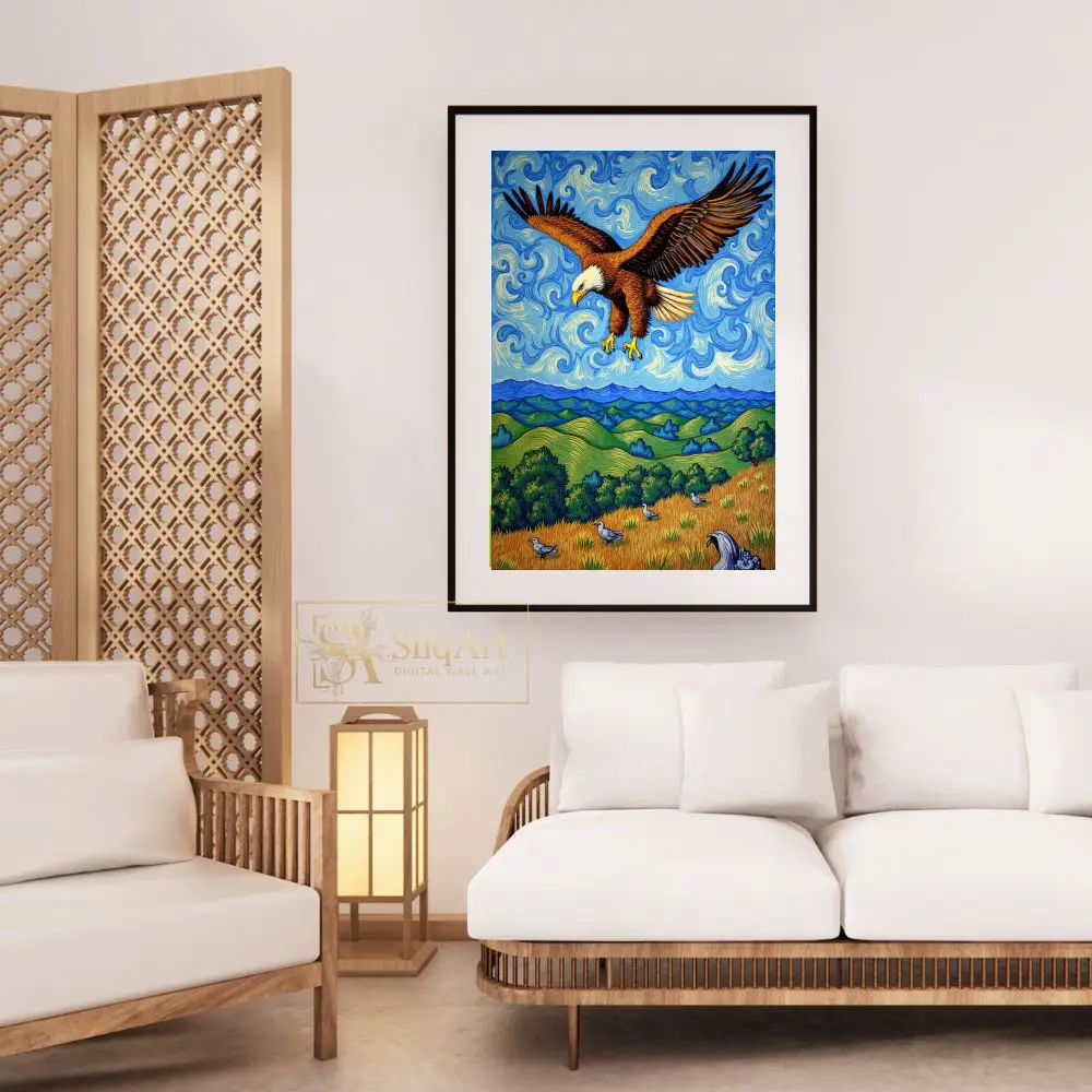 Experience the majesty of the American wilderness through a Post-Impressionist lens. This striking artwork features a bald eagle in mid-flight, its powerful wings outstretched against a turbulent, swirling sky that pays homage to Van Gogh’s iconic style.