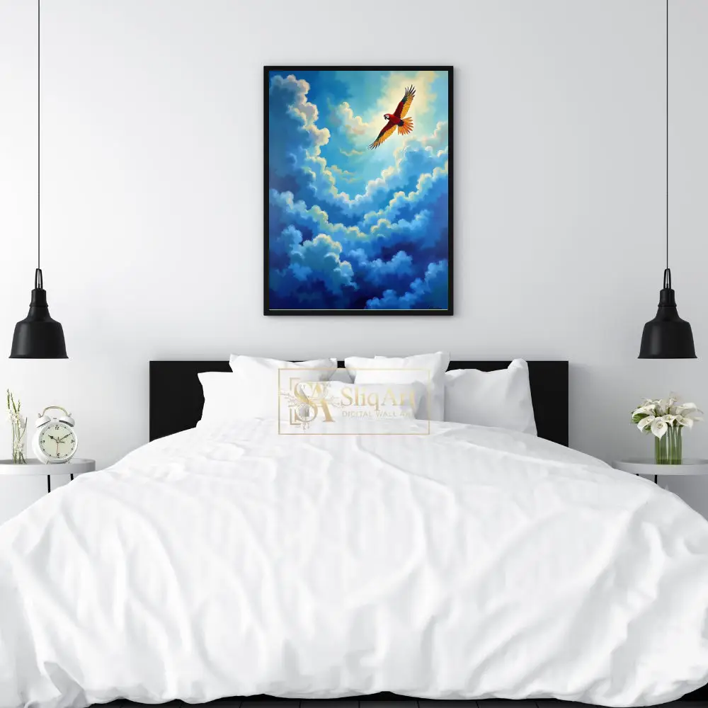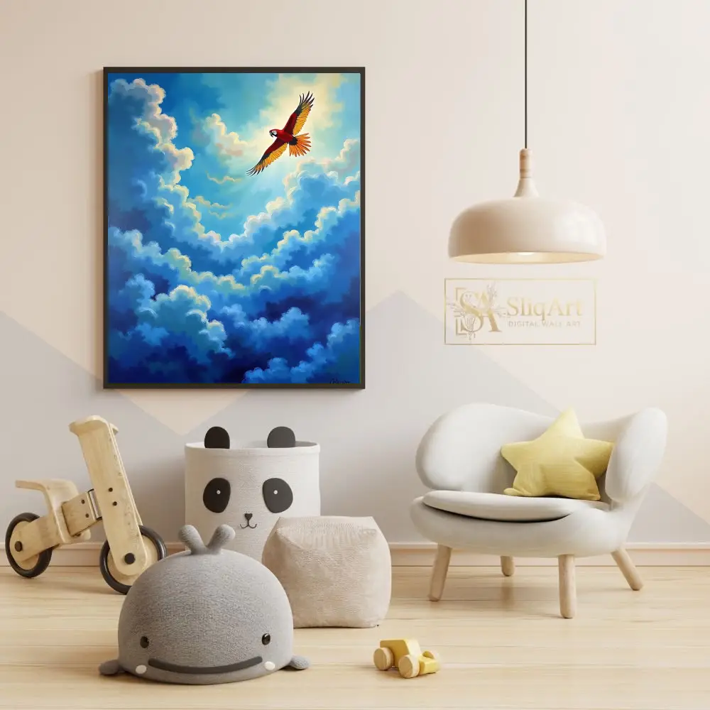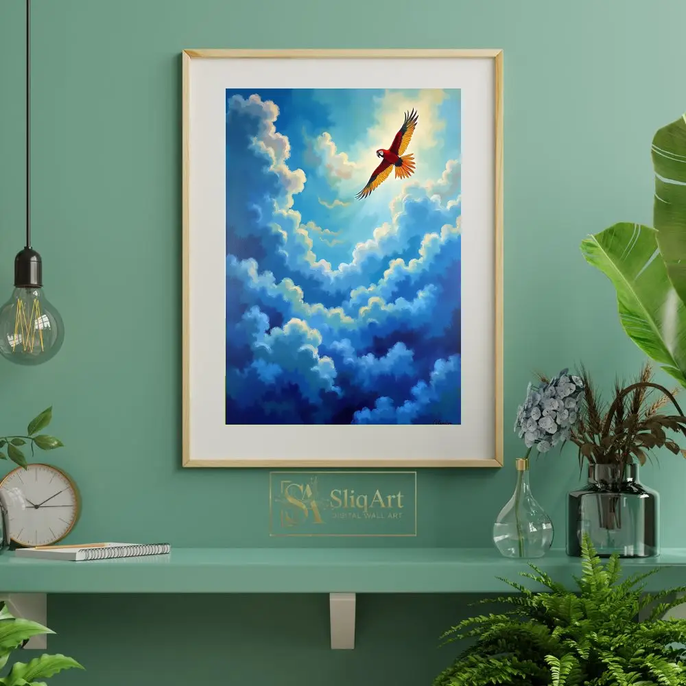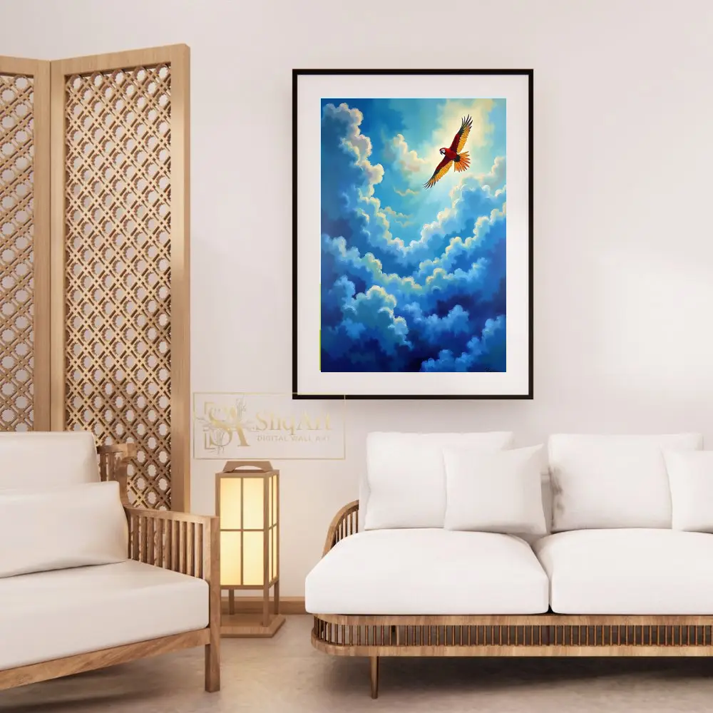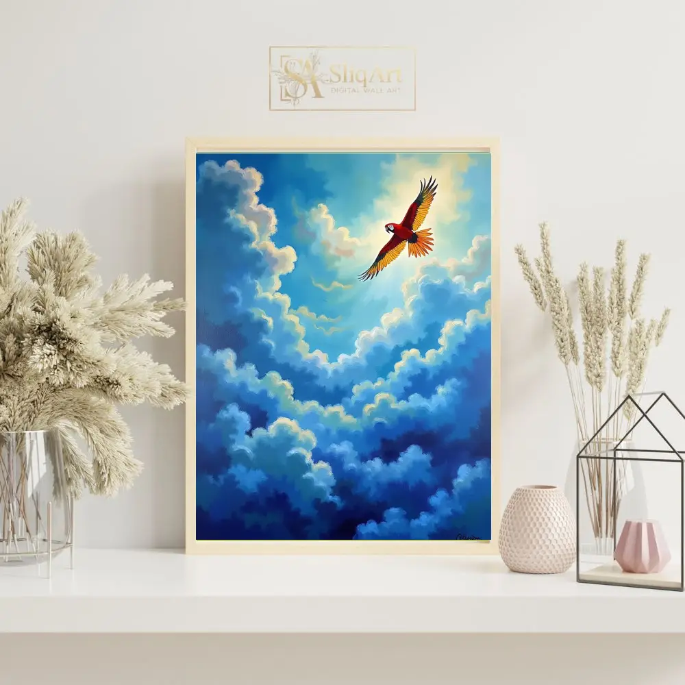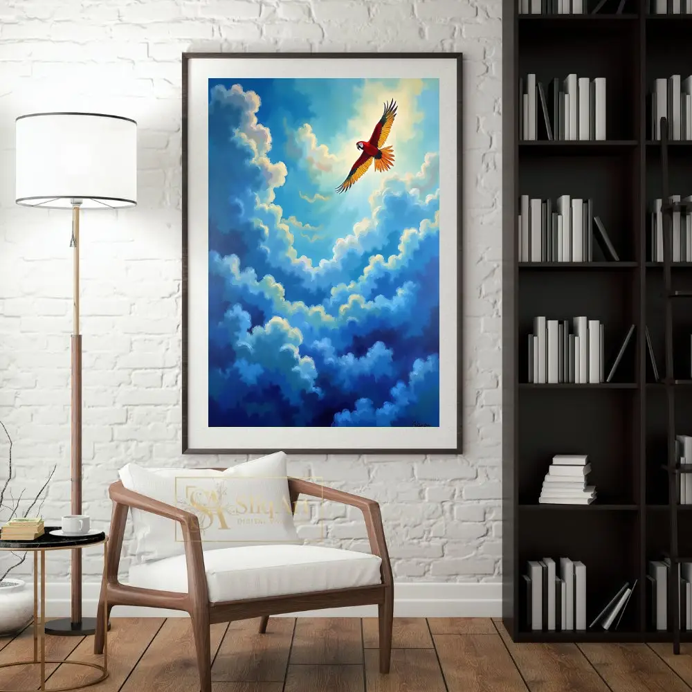 Experience the exhilarating feeling of freedom with this stunning canvas print, ‘The Great Ascent’. A vivid scarlet macaw, rendered in brilliant reds and oranges, takes flight through a vast, ethereal sky filled with majestic, multi-layered clouds.