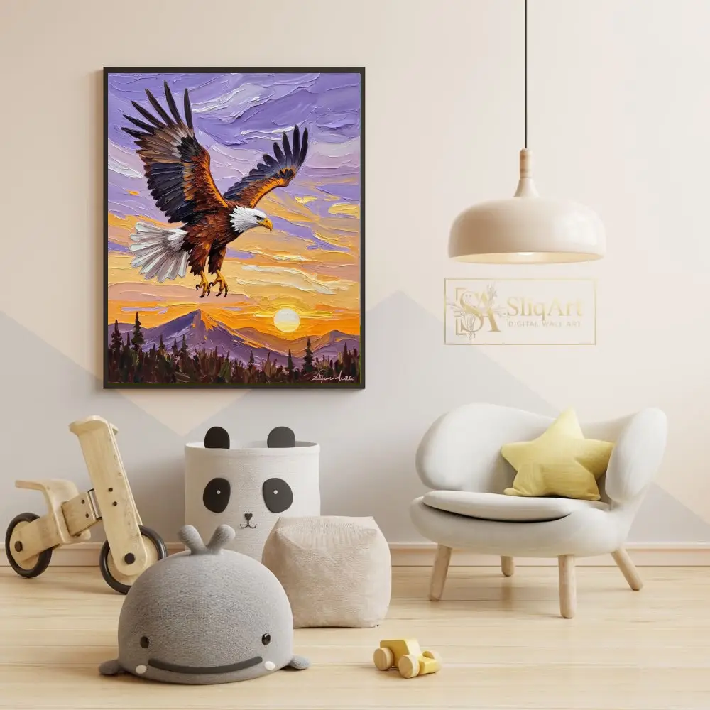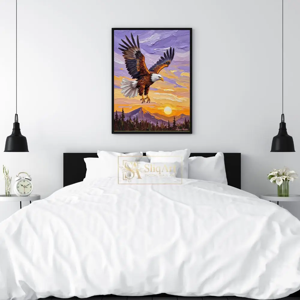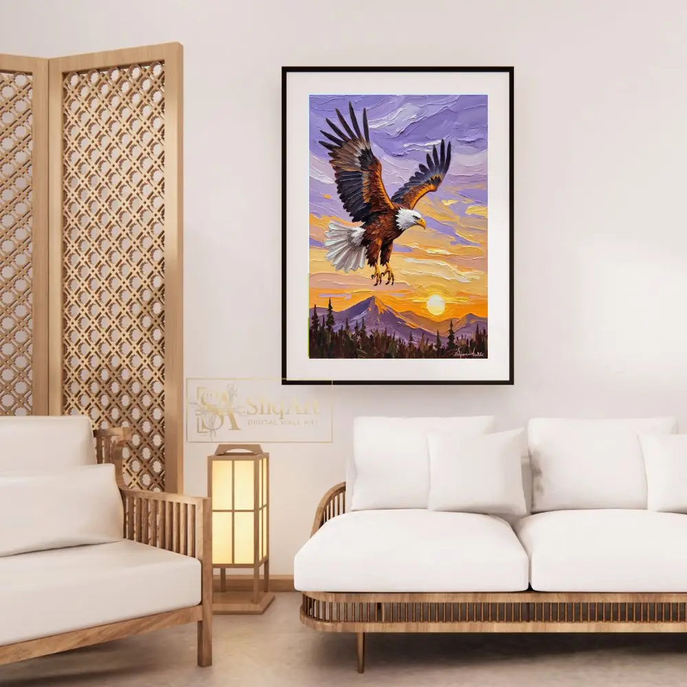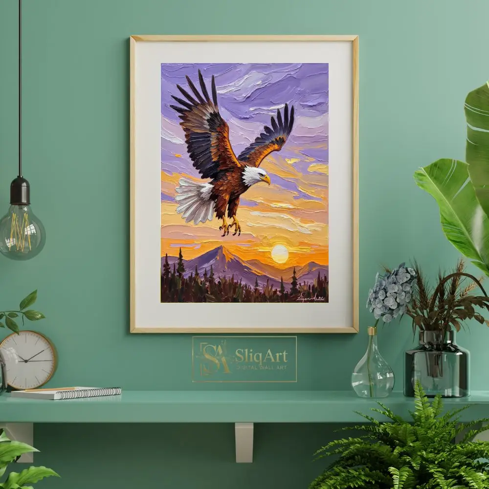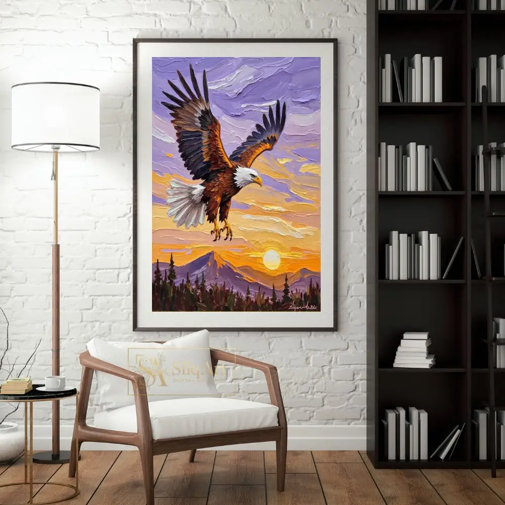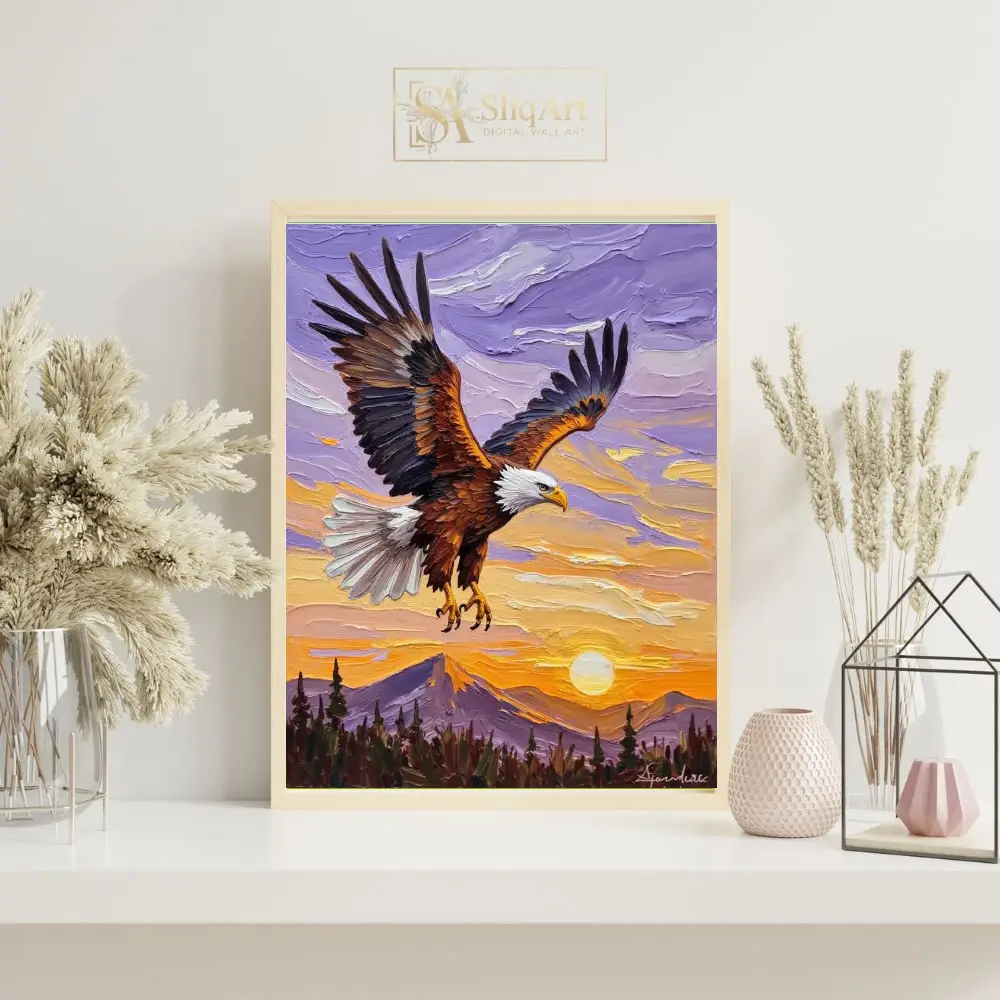 Capture the spirit of freedom and strength with this breathtaking impasto oil painting of a bald eagle. The artwork features a majestic eagle in mid-flight, its powerful wings spread wide against a vibrant sunset sky.