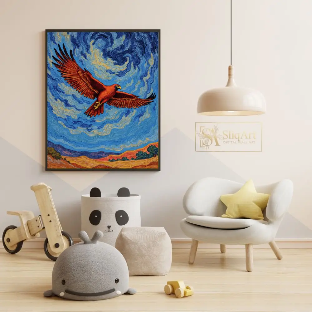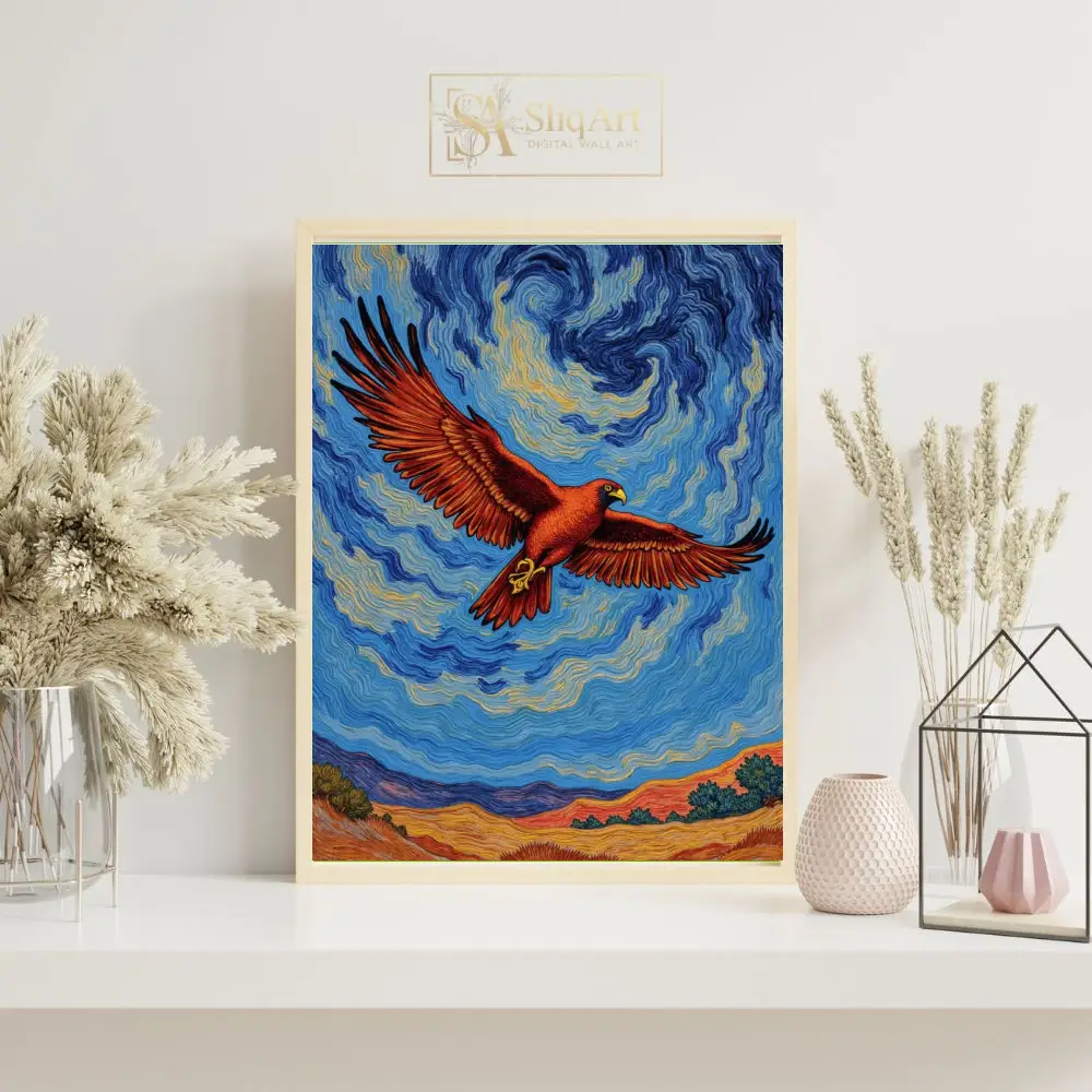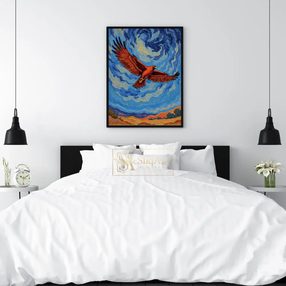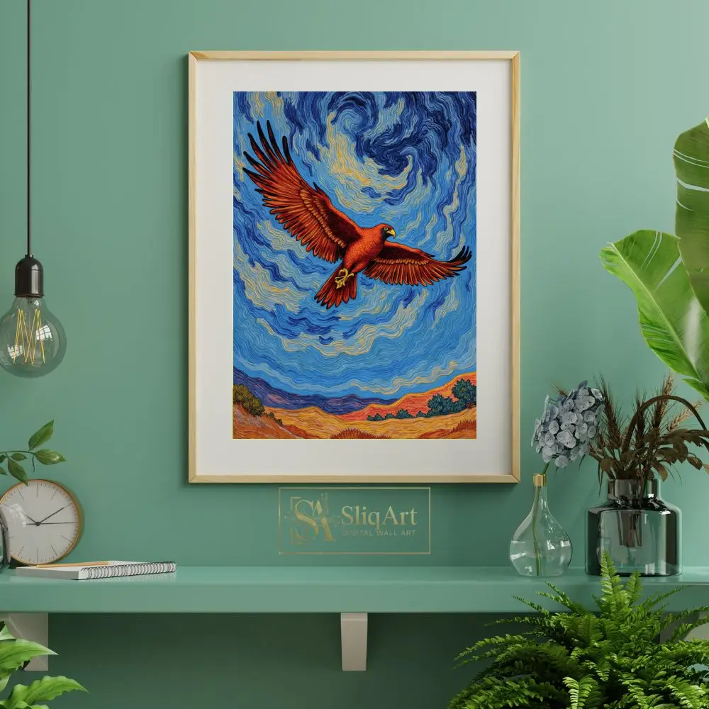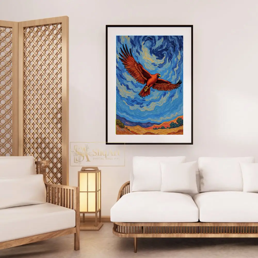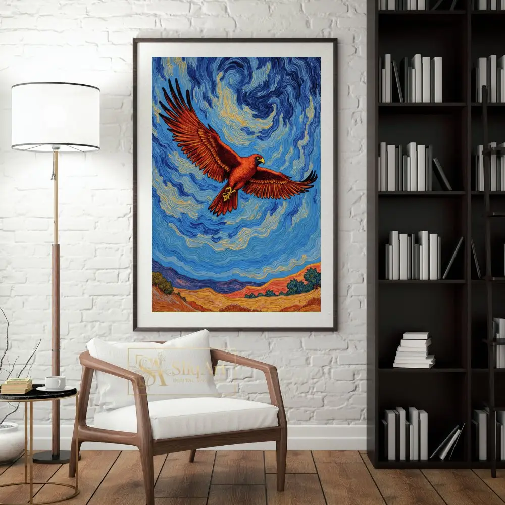 This captivating piece captures the raw power and grace of a soaring eagle, rendered in a breathtaking post-impressionist style. Heavily inspired by the rhythmic brushstrokes and vibrant intensity of Vincent van Gogh, the artwork features a swirling, kinetic sky in deep blues and celestial yellows.