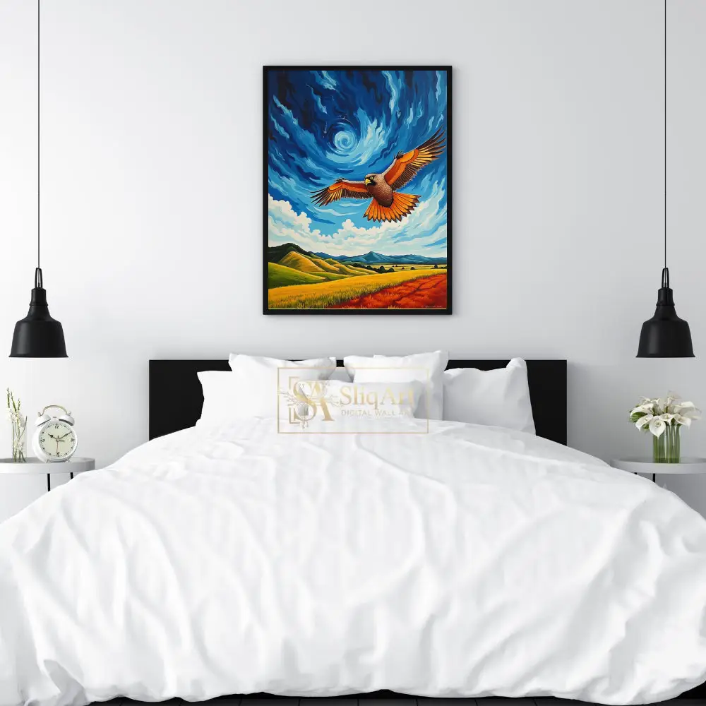 Experience the soaring freedom of the wild with this striking post-impressionist masterpiece. The artwork features a majestic hawk in full flight, its wings displaying vibrant shades of burnt orange and deep brown as it glides over a rolling rural landscape.