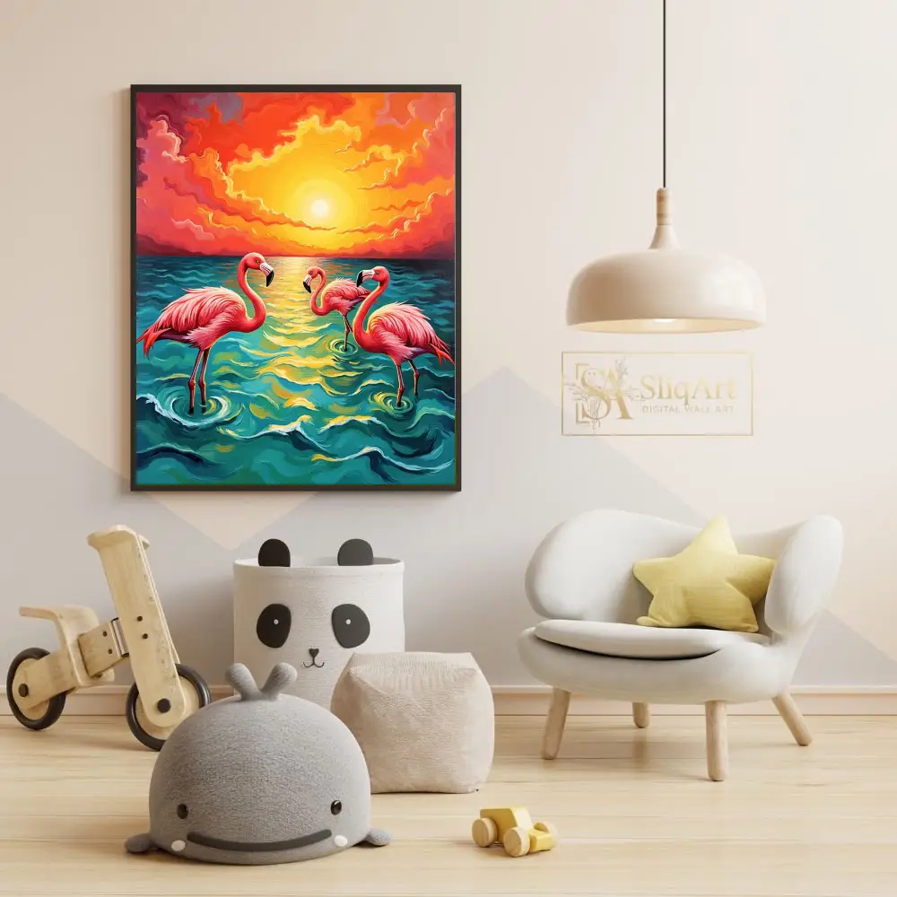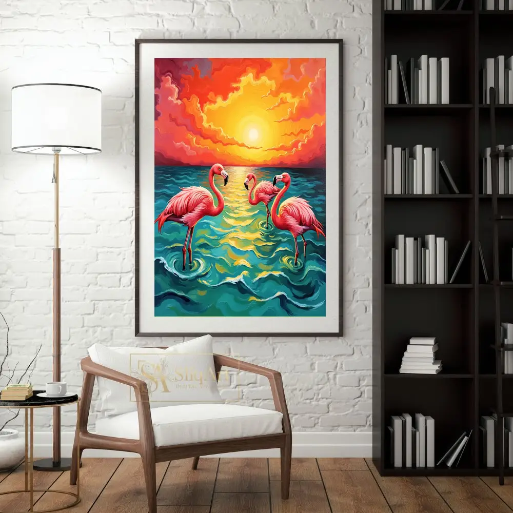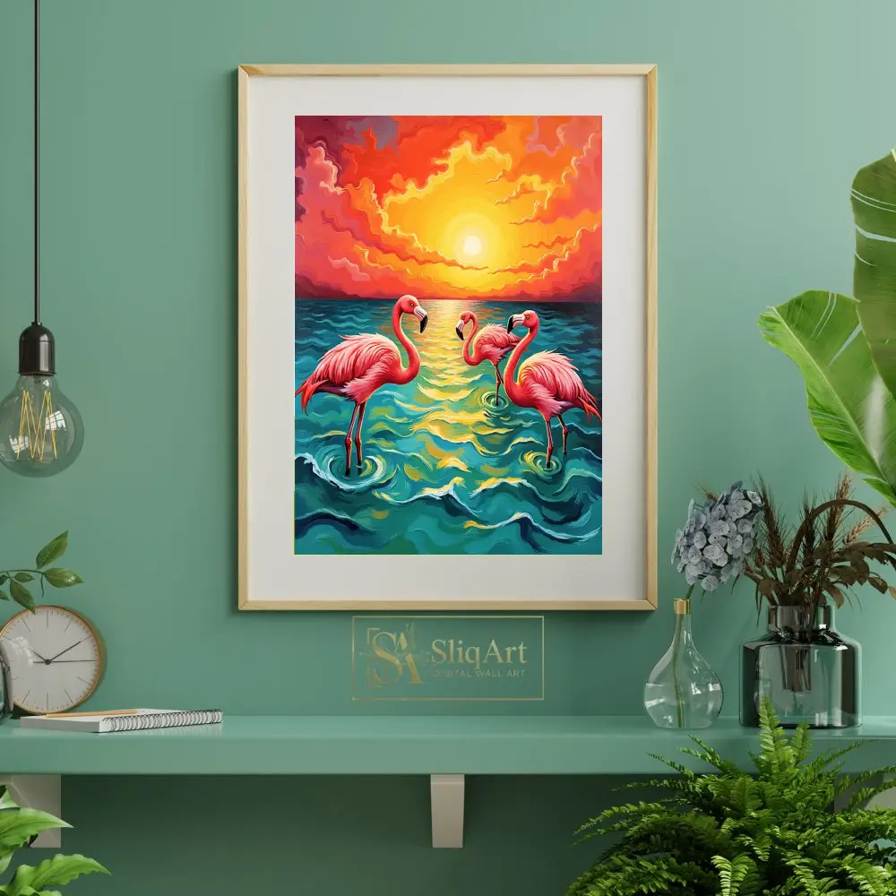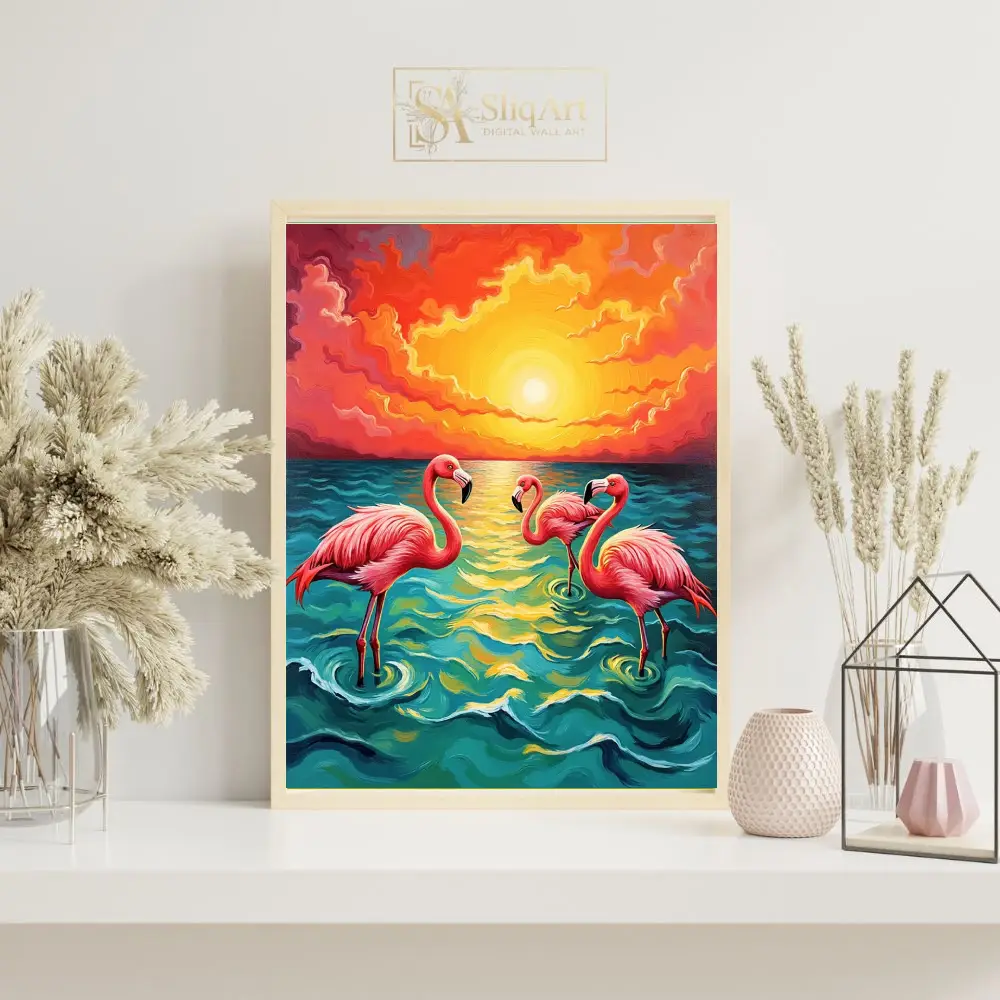 A vibrant impressionist painting of three pink flamingos in the ocean at sunset, featuring rich oranges and deep teals.