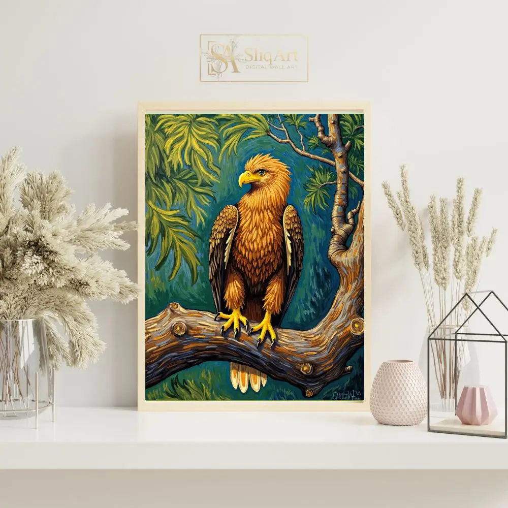 Bring the noble spirit of the wild into your home with this stunning illustrative print of a golden eagle. Perched majestically on a gnarled branch, the eagle’s golden plumage and piercing gaze are captured in rich detail through bold outlines and textured patterns.