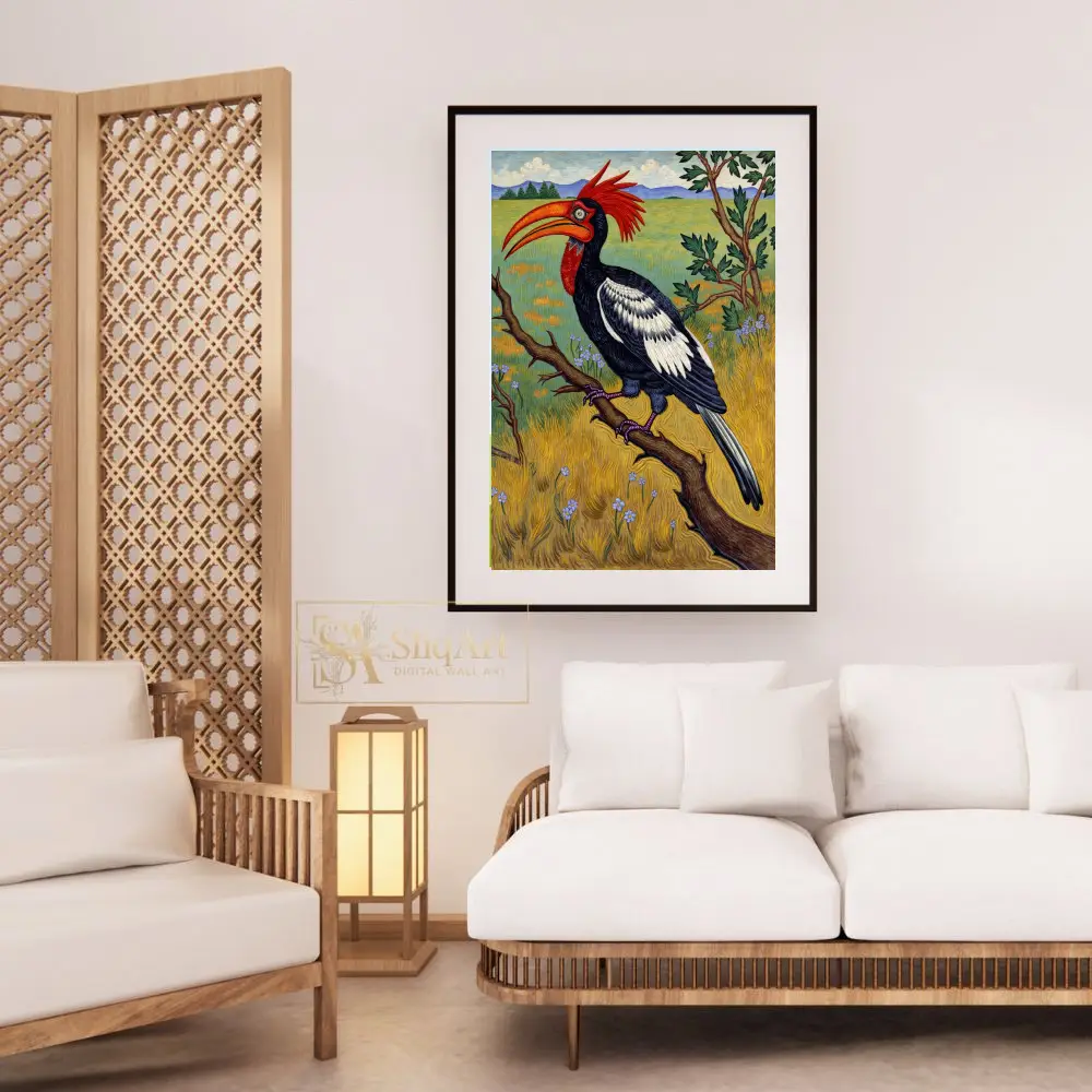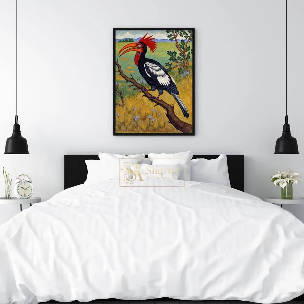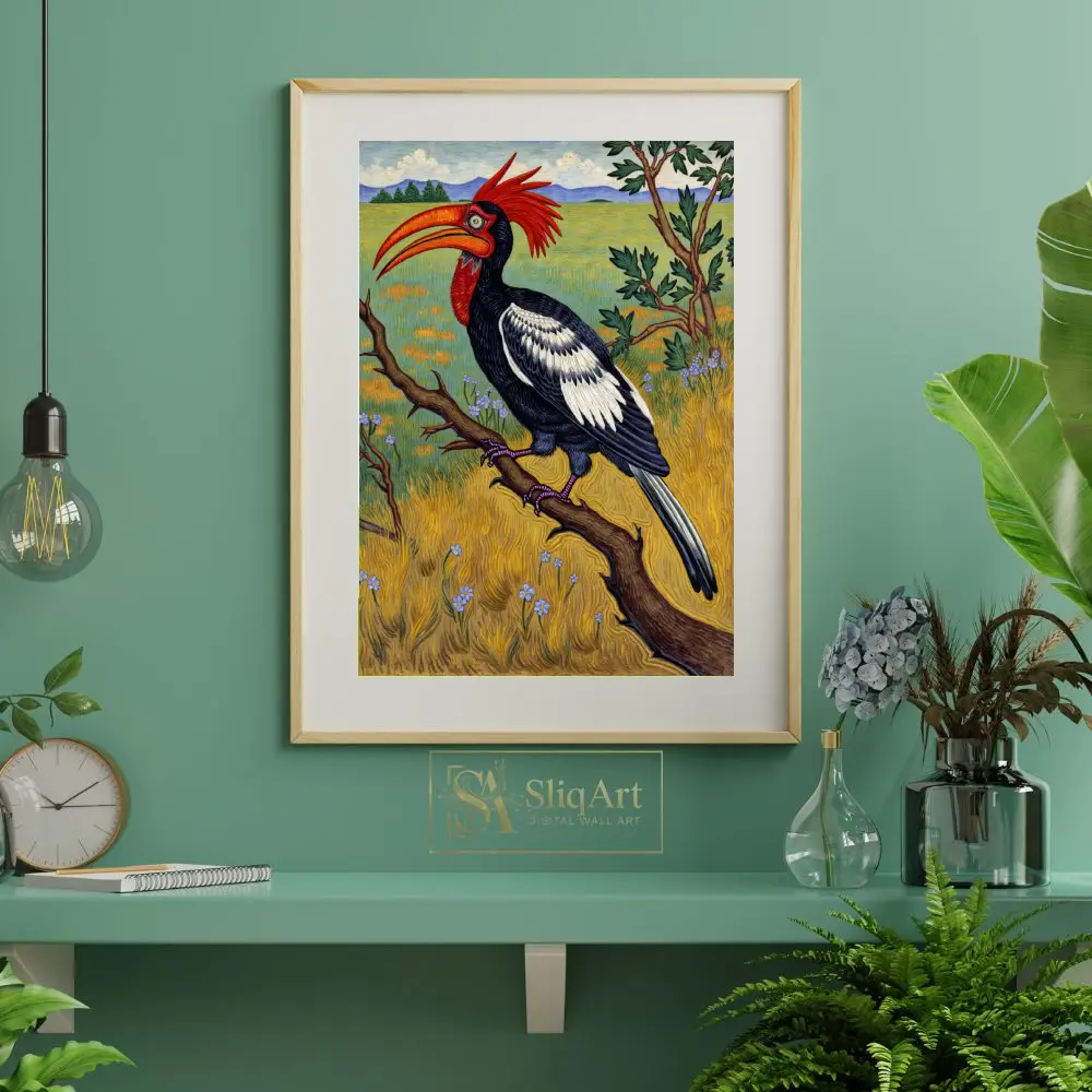 This captivating illustration features a majestic Red-Crested Hornbill, a bird known for its striking appearance, perched on a textured branch. The artwork showcases a bold use of color, with the bird’s fiery red crest and oversized orange beak serving as the focal point against its detailed black and white plumage.