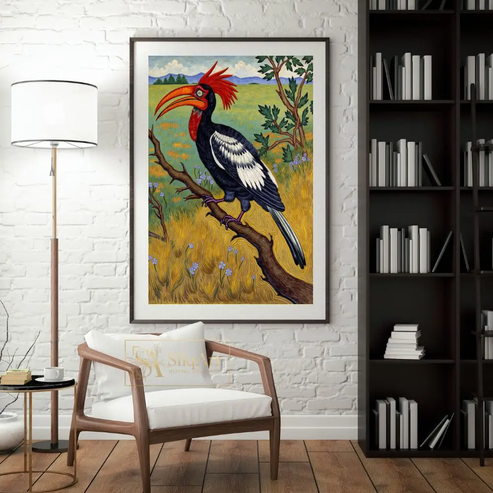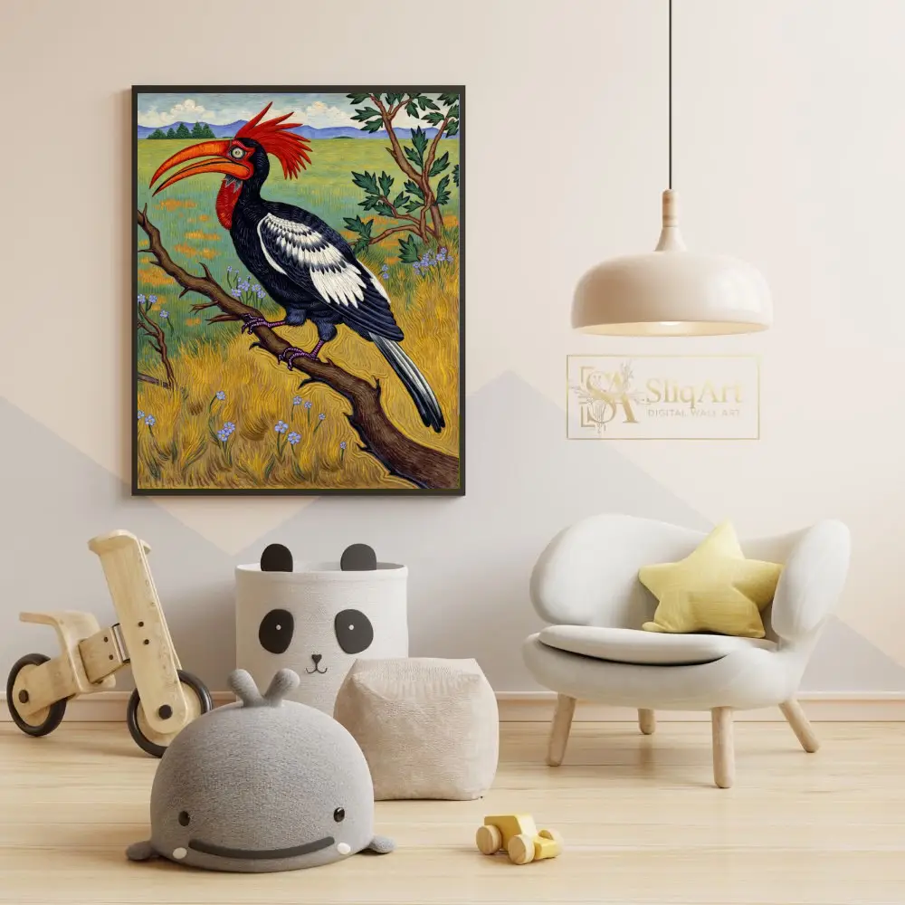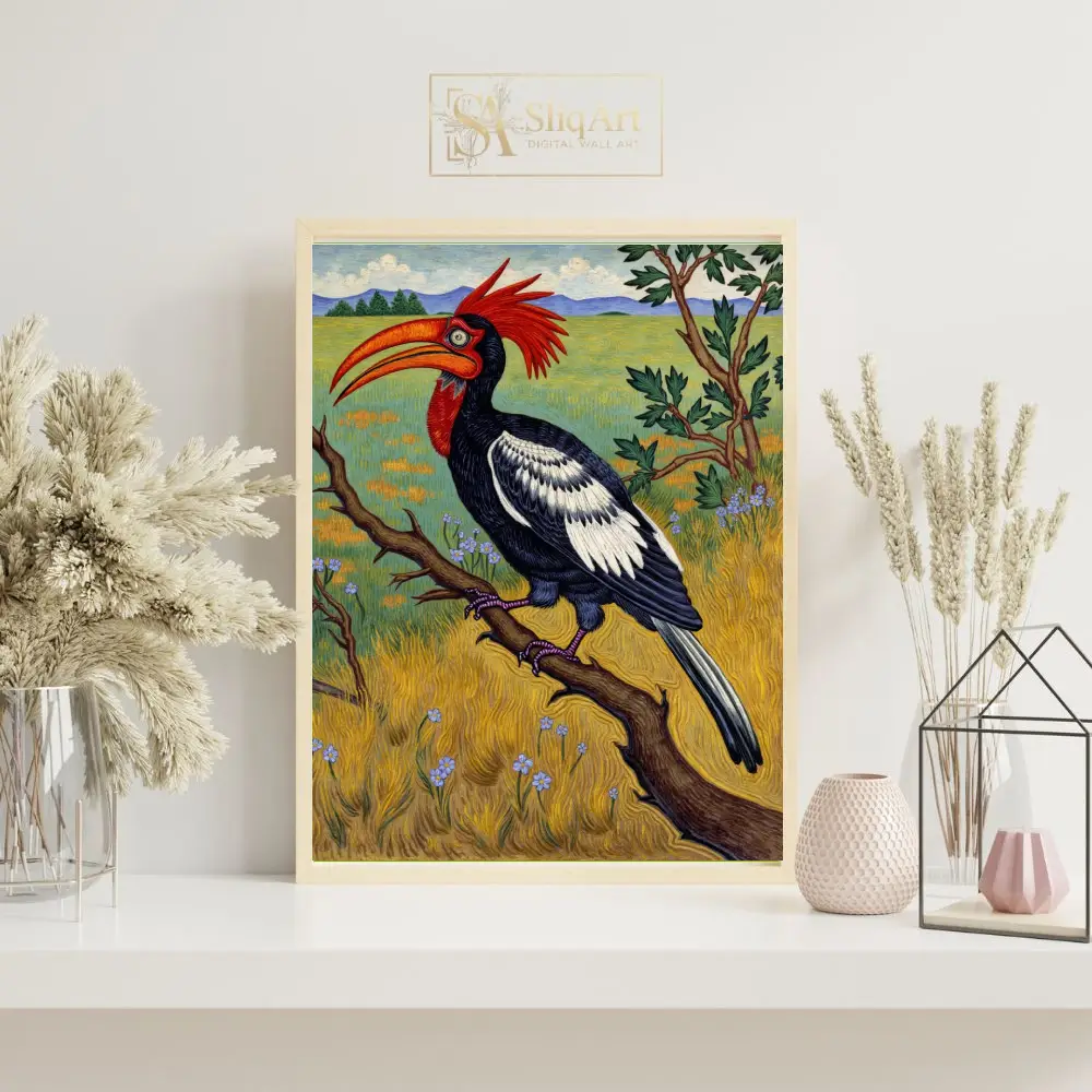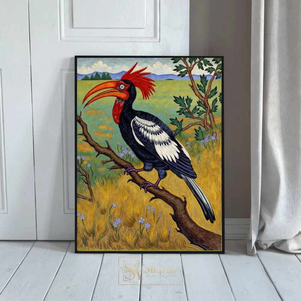 This captivating illustration features a majestic Red-Crested Hornbill, a bird known for its striking appearance, perched on a textured branch. The artwork showcases a bold use of color, with the bird’s fiery red crest and oversized orange beak serving as the focal point against its detailed black and white plumage.