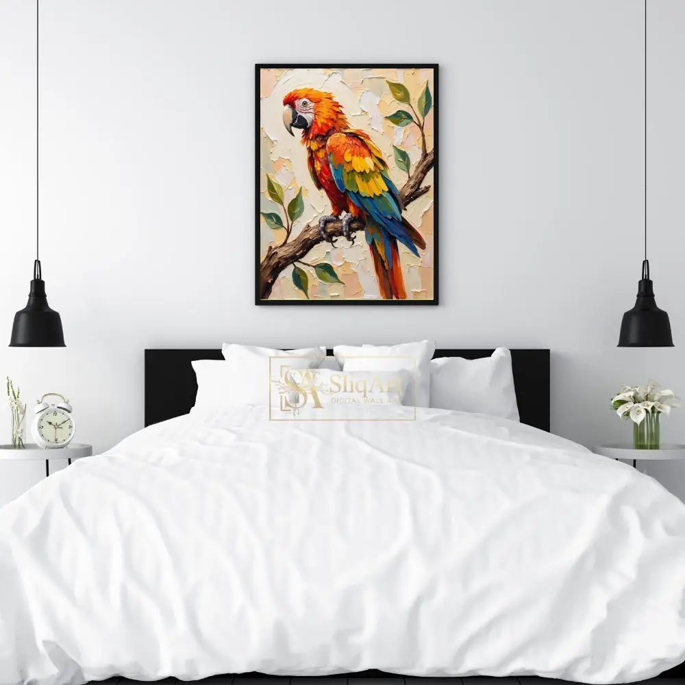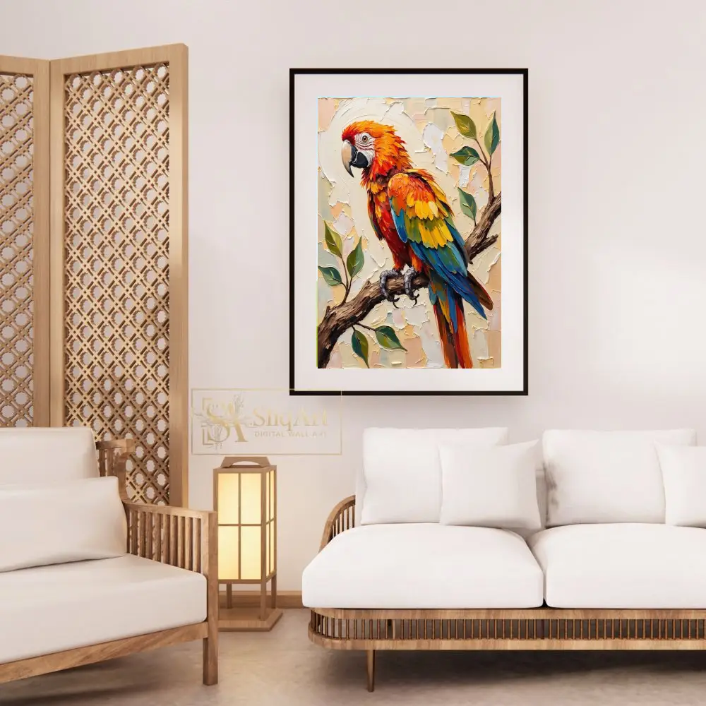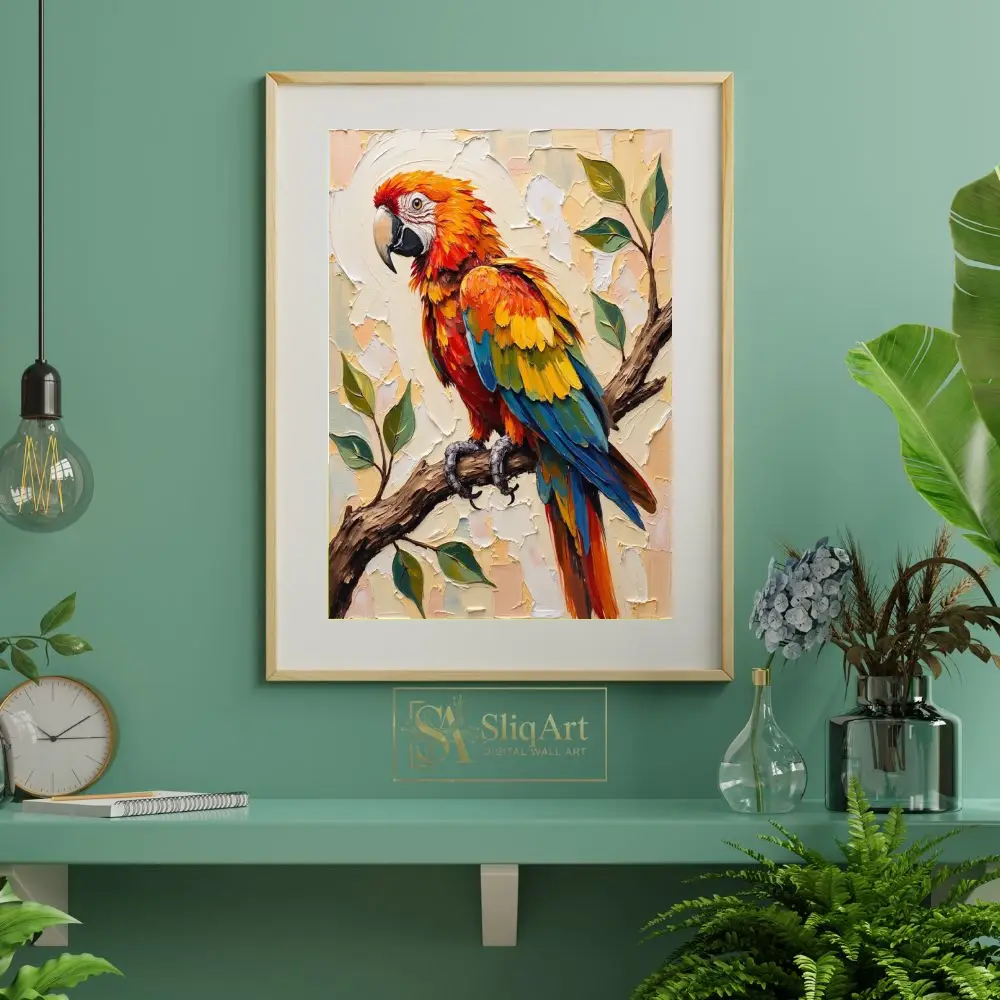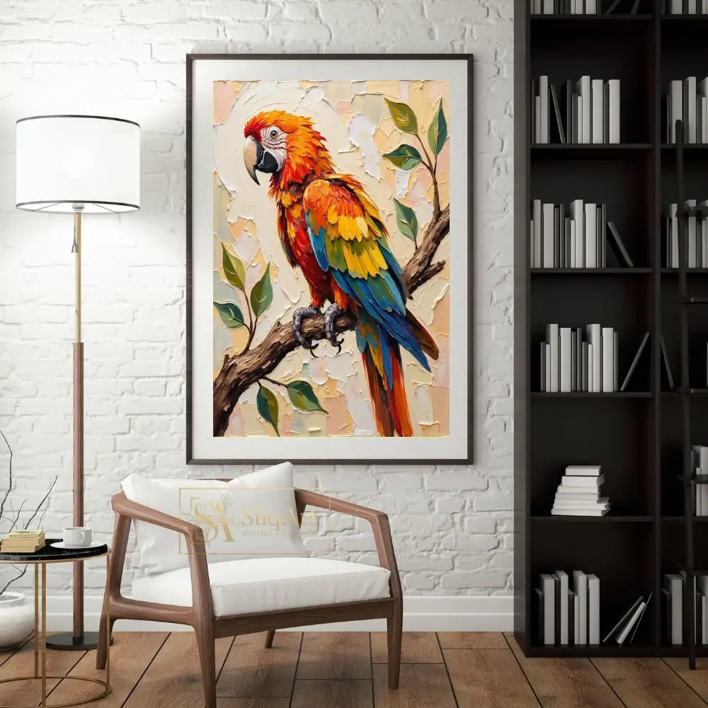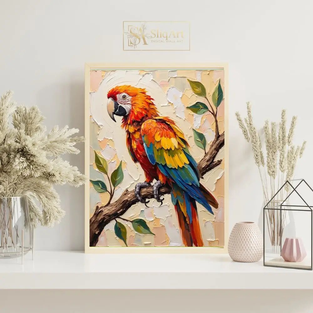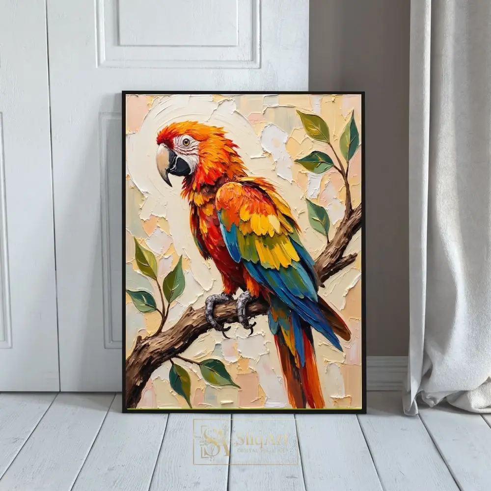 Add a burst of tropical energy to your home with this exquisite impasto painting of a Scarlet Macaw. The artwork utilizes heavy-bodied palette knife techniques to create a rich, tactile surface that highlights the parrot’s magnificent feathers.