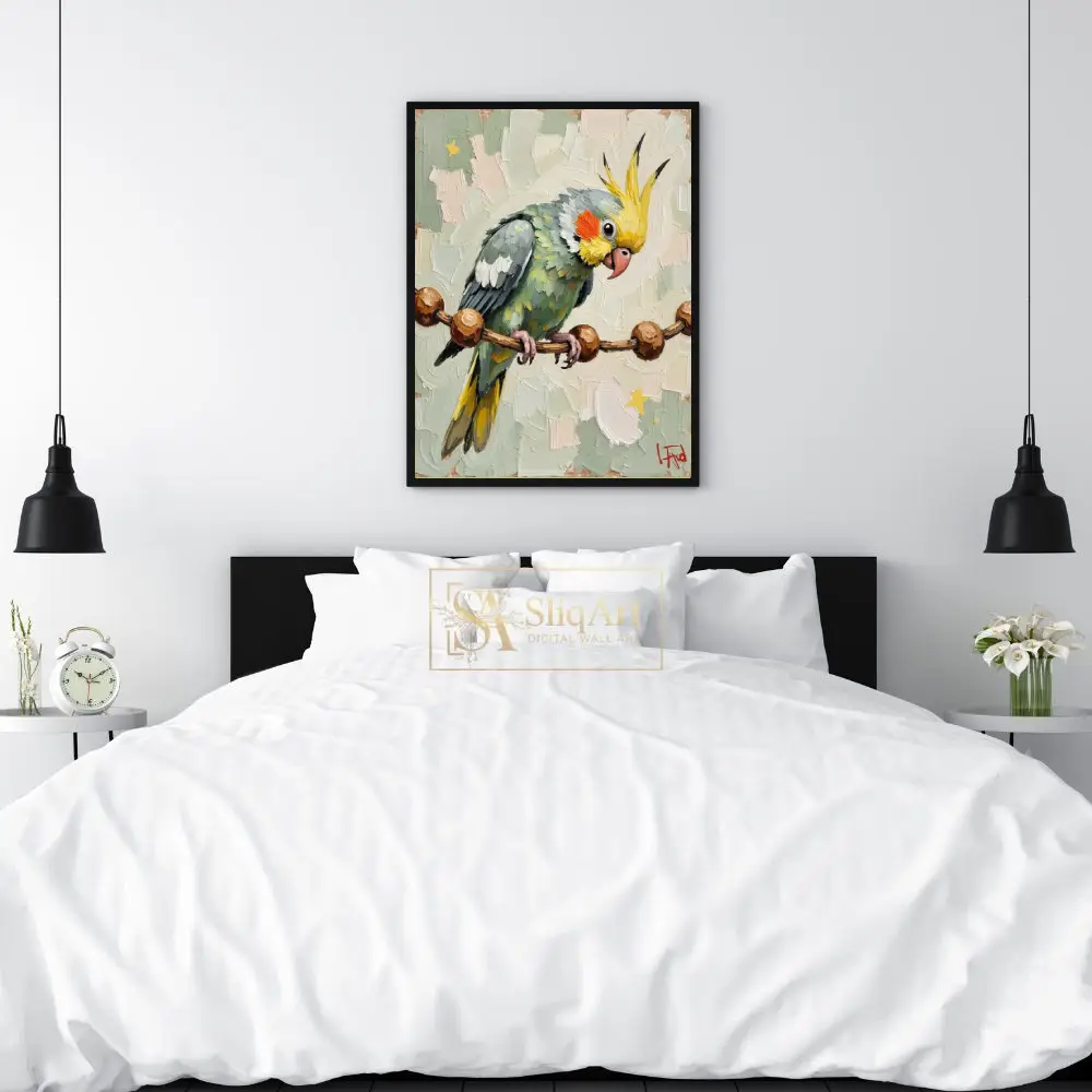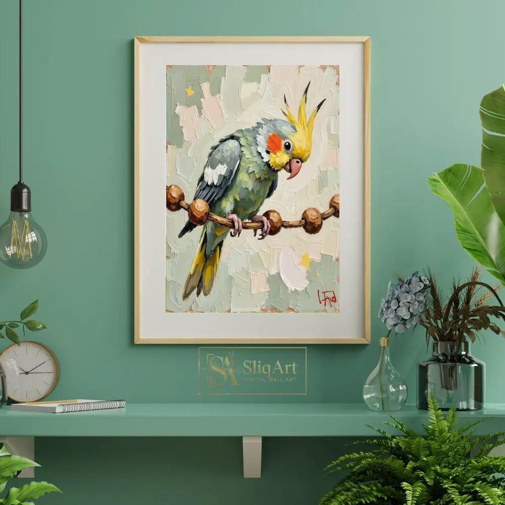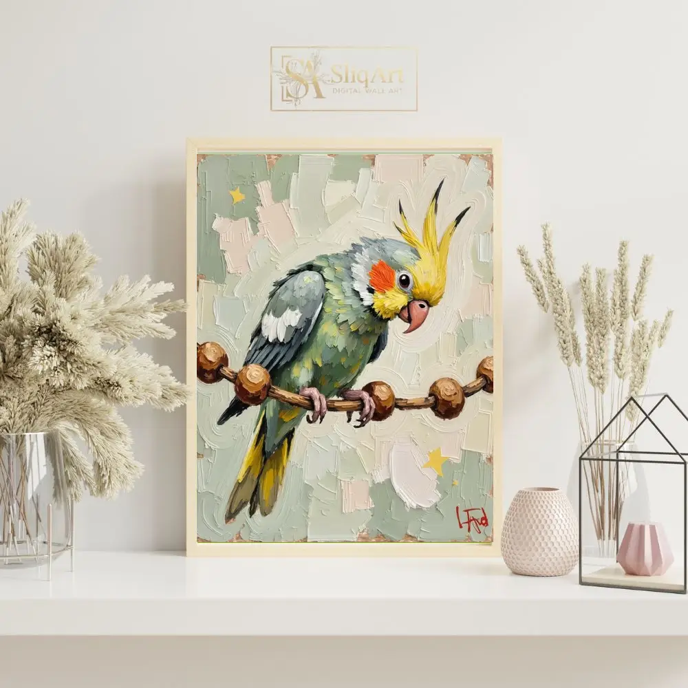 The cockatiel’s signature yellow crest and bright orange cheeks pop against a soothing background of sage green and mint tones. Perched delicately on a beaded branch, this artwork captures the playful and curious spirit of the beloved parrot, making it a perfect conversation piece for any bird lover or art enthusiast.