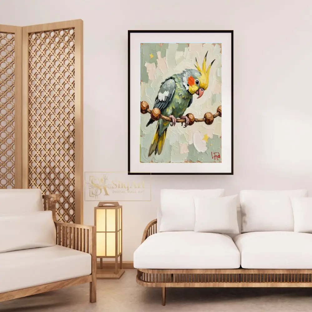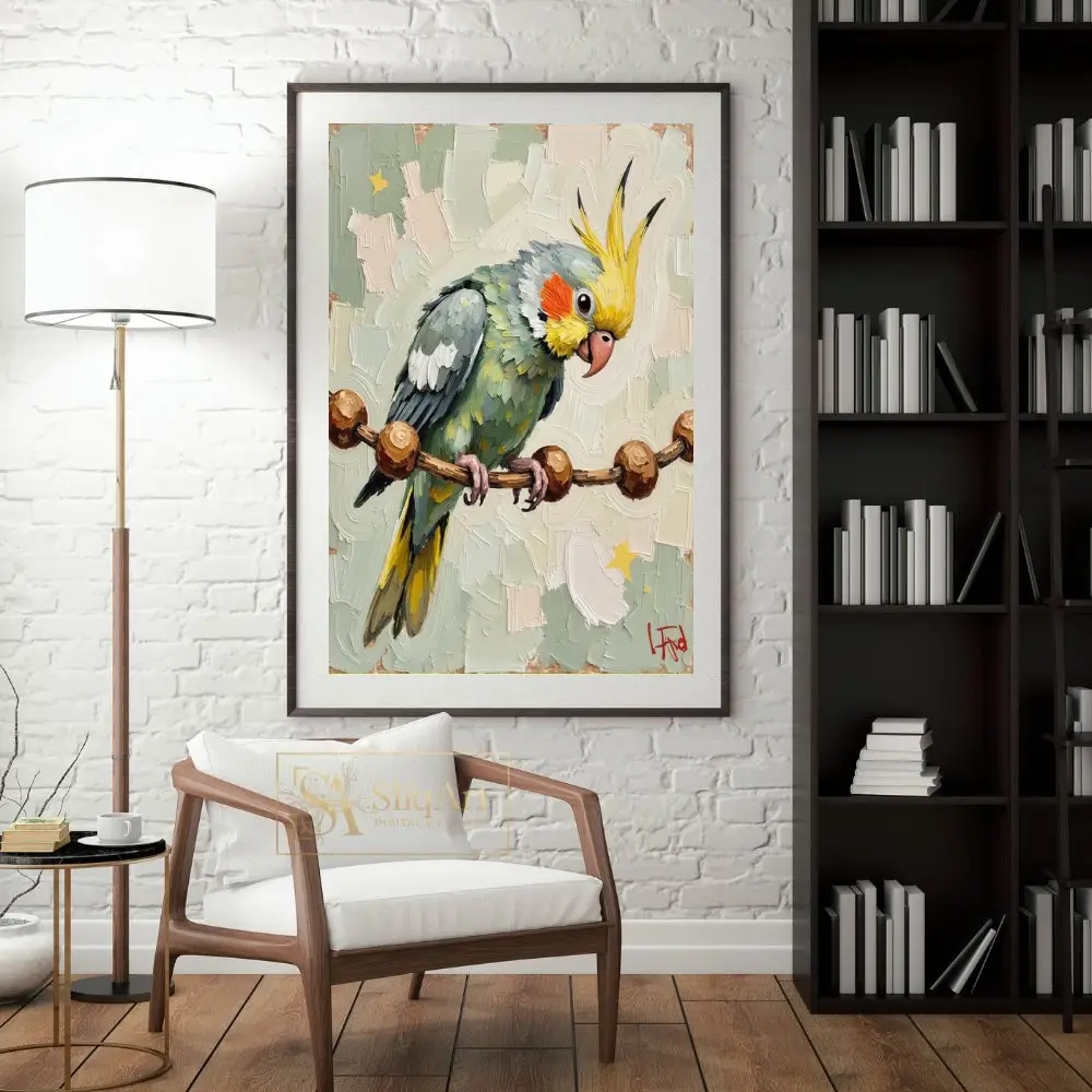 Add a touch of whimsical nature to your walls with this stunning cockatiel bird painting. Executed in a bold impasto style, the artist utilizes thick, expressive palette knife strokes to give the bird a tactile, three-dimensional presence.