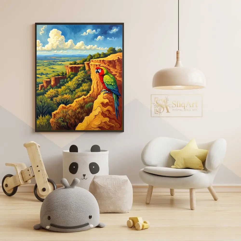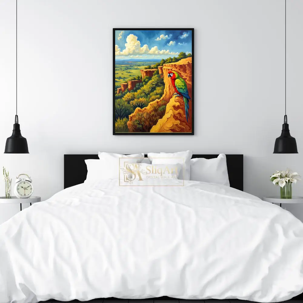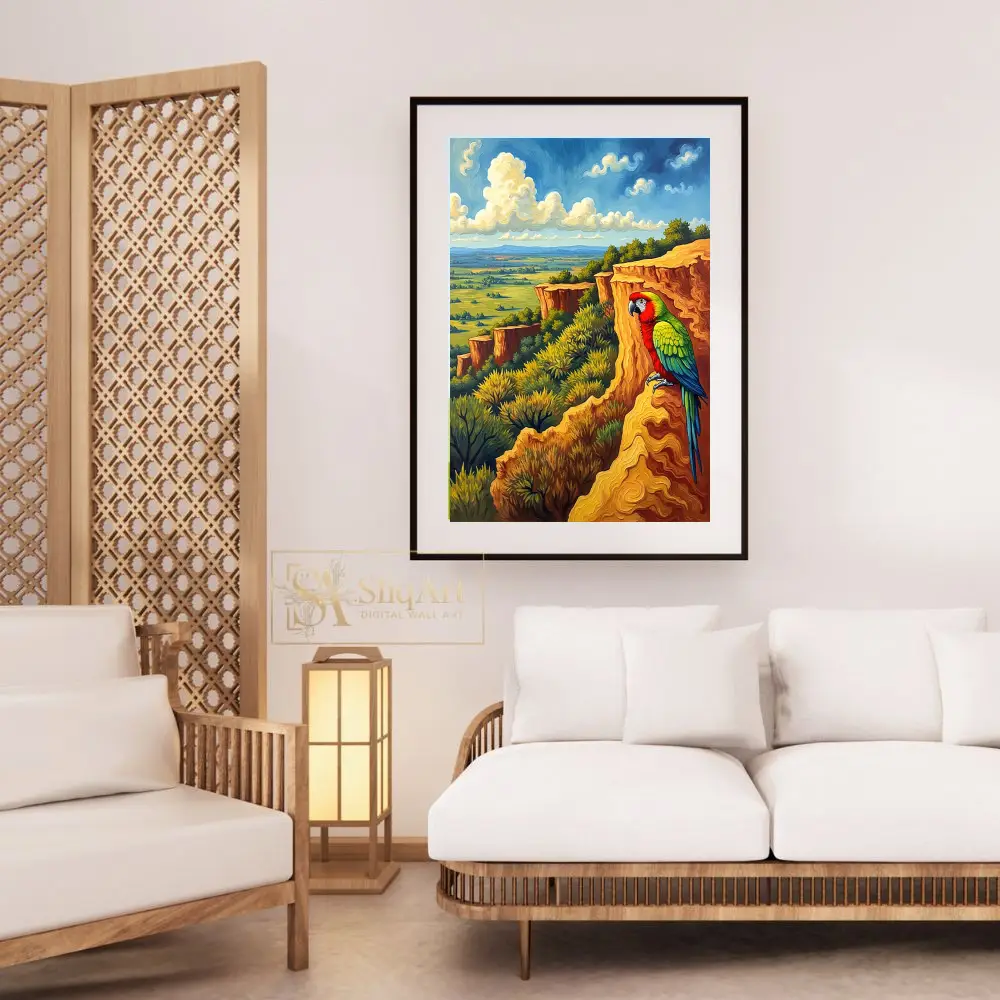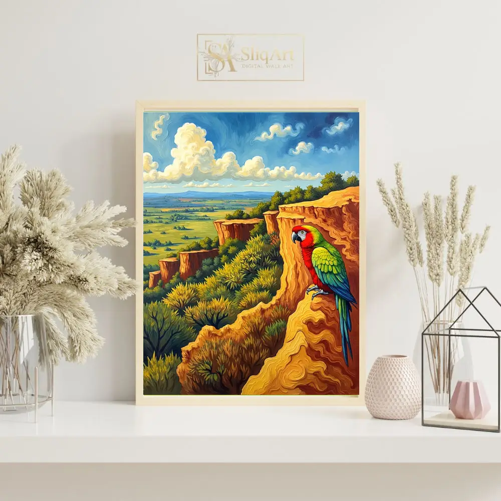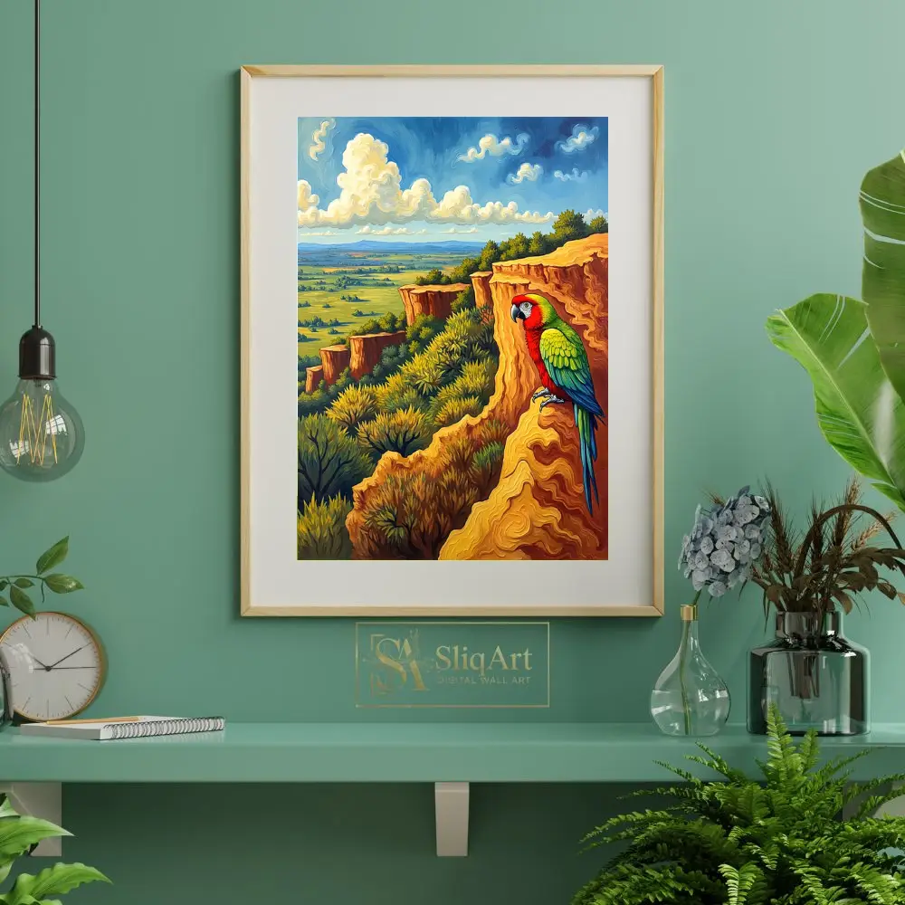 The warm, golden tones of the rock formations contrast beautifully with the vibrant plumage of the parrot and the cool blues of the horizon, creating a dynamic and engaging visual experience. This artwork captures the essence of wild freedom and natural beauty, making it a perfect statement piece for any modern home seeking a touch of the exotic.