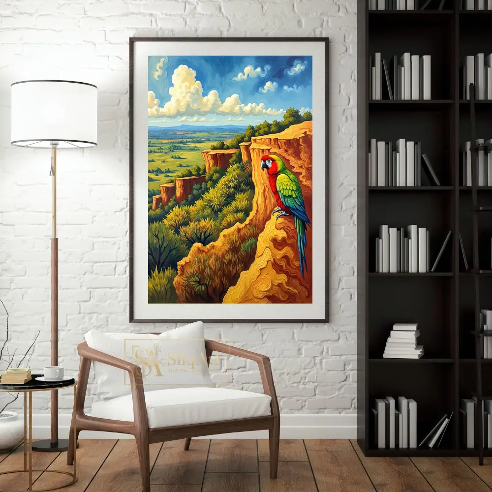 Elevate your interior with this breathtaking piece of art featuring a brilliant red, green, and blue macaw perched majestically upon a sun-drenched canyon cliff. The painting utilizes a unique, swirling brushstroke style reminiscent of post-impressionism, bringing the lush green valley and the expansive blue sky to life.