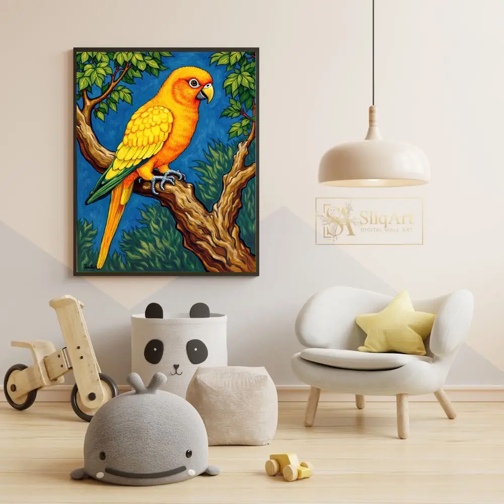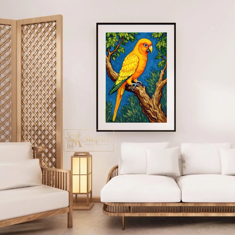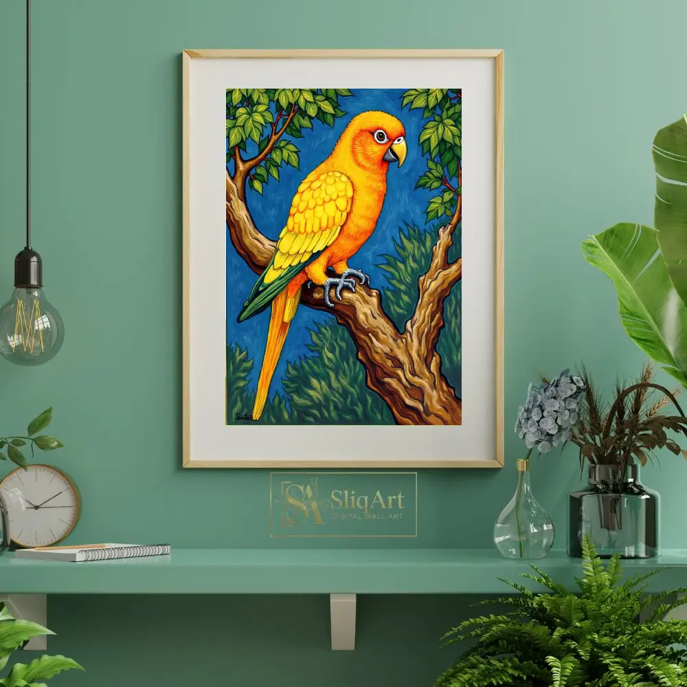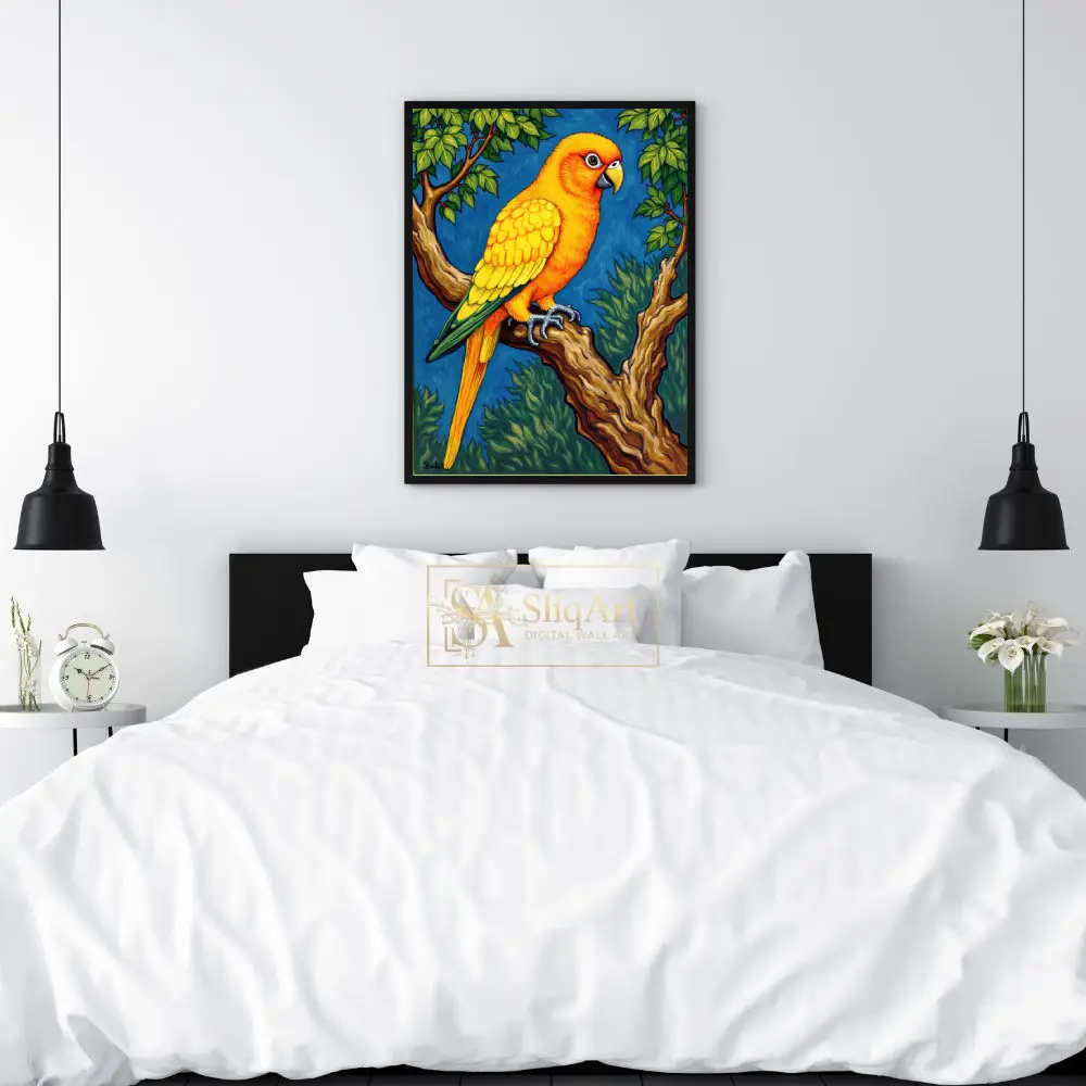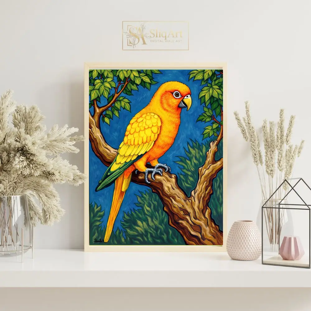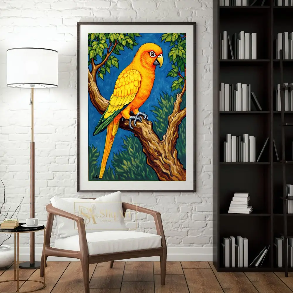 Experience the radiant beauty of the tropics with this exquisite Sun Conure parrot art piece. Every feather is rendered in striking shades of gold and sunset orange, creating a brilliant contrast against the deep azure background.