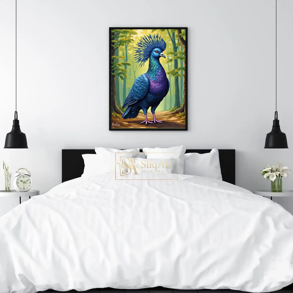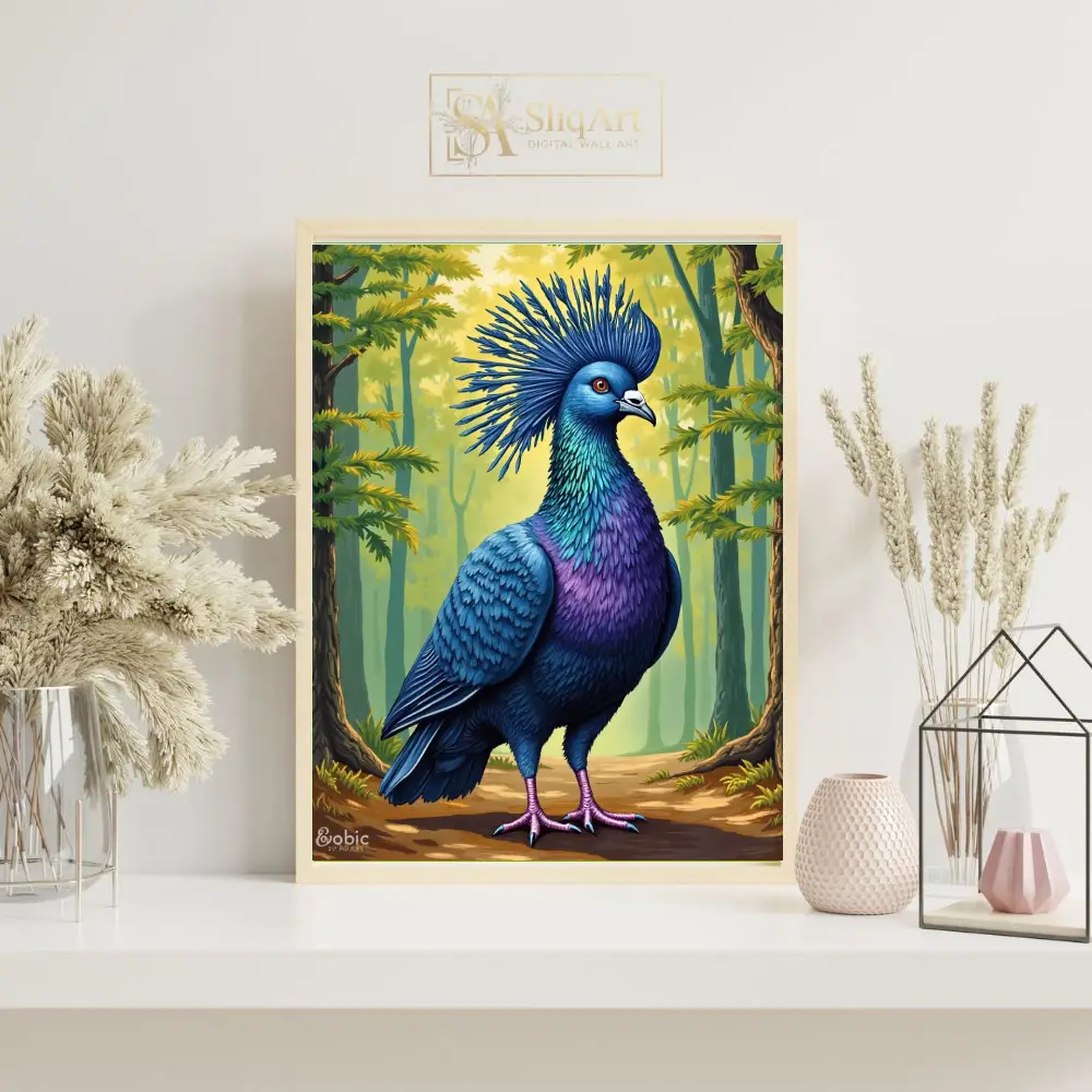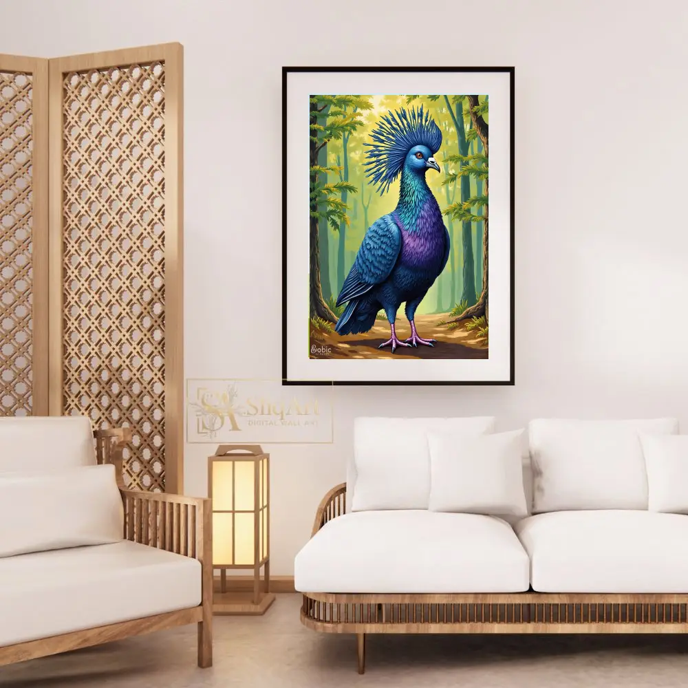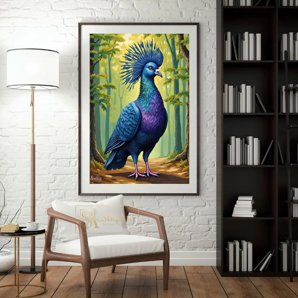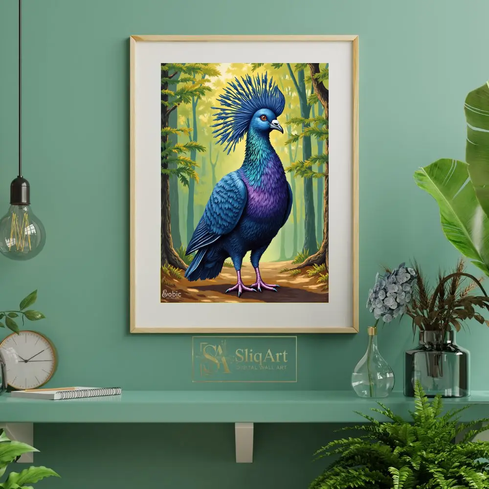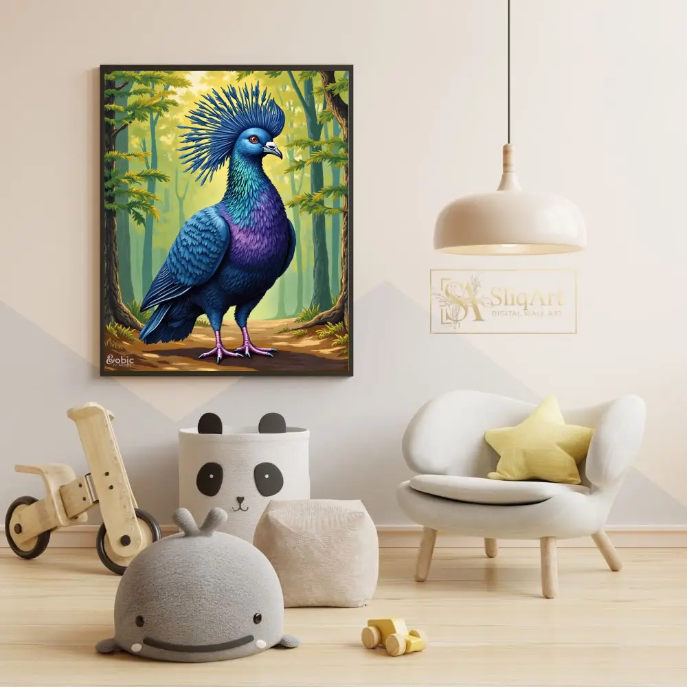 This stunning digital illustration captures the regal beauty of the Victoria Crowned Pigeon in exquisite detail. Featuring vibrant shades of royal blue, deep purple, and shimmering teal, the bird stands proudly against a soft, sun-dappled forest backdrop.