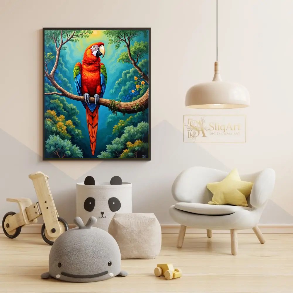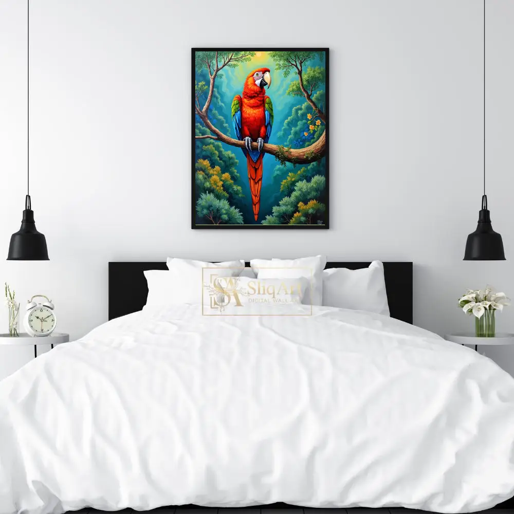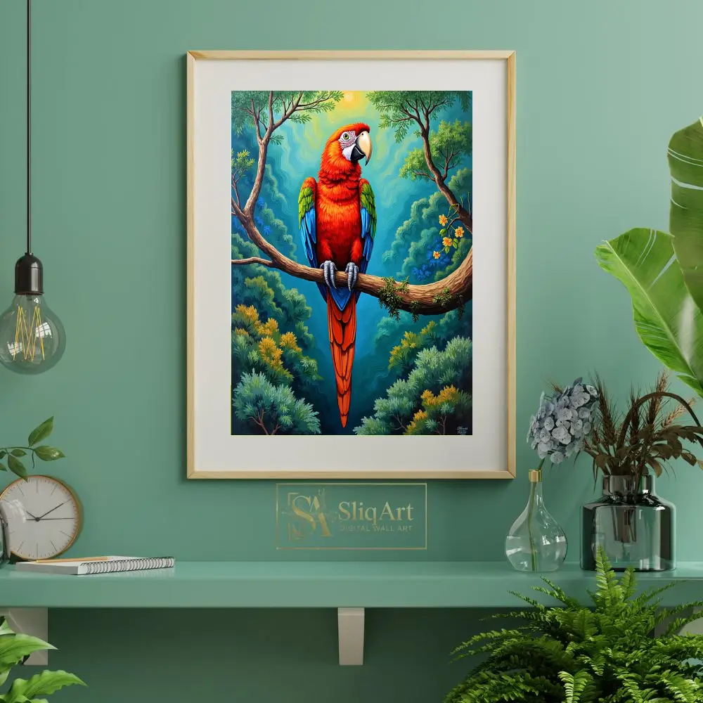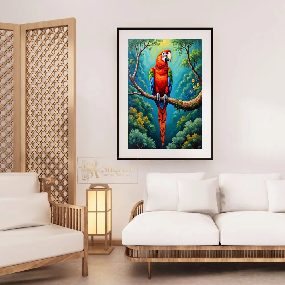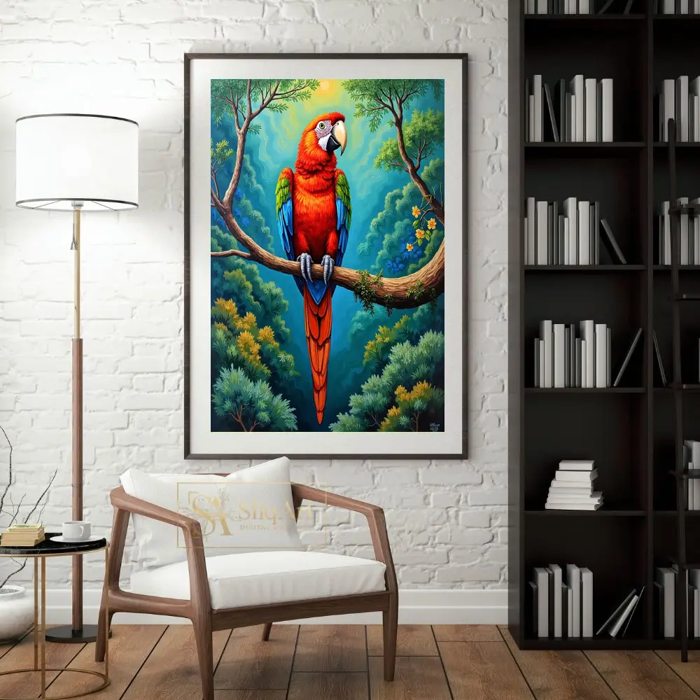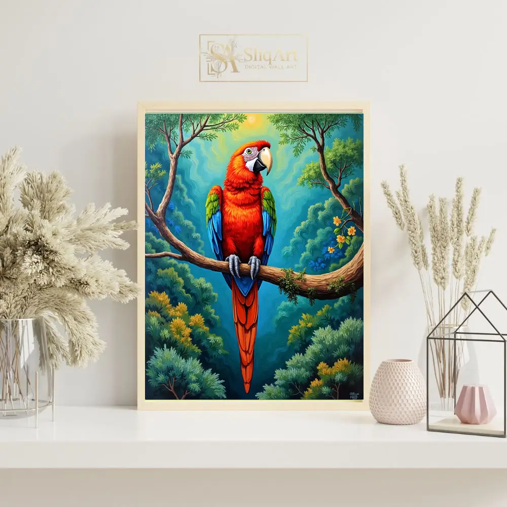 Bring the high-energy spirit of the tropics into your interior with this stunning Scarlet Macaw artwork. The piece features a majestic parrot perched on a mossy branch, set against a backdrop of swirling, stylized jungle foliage and a glowing sun.