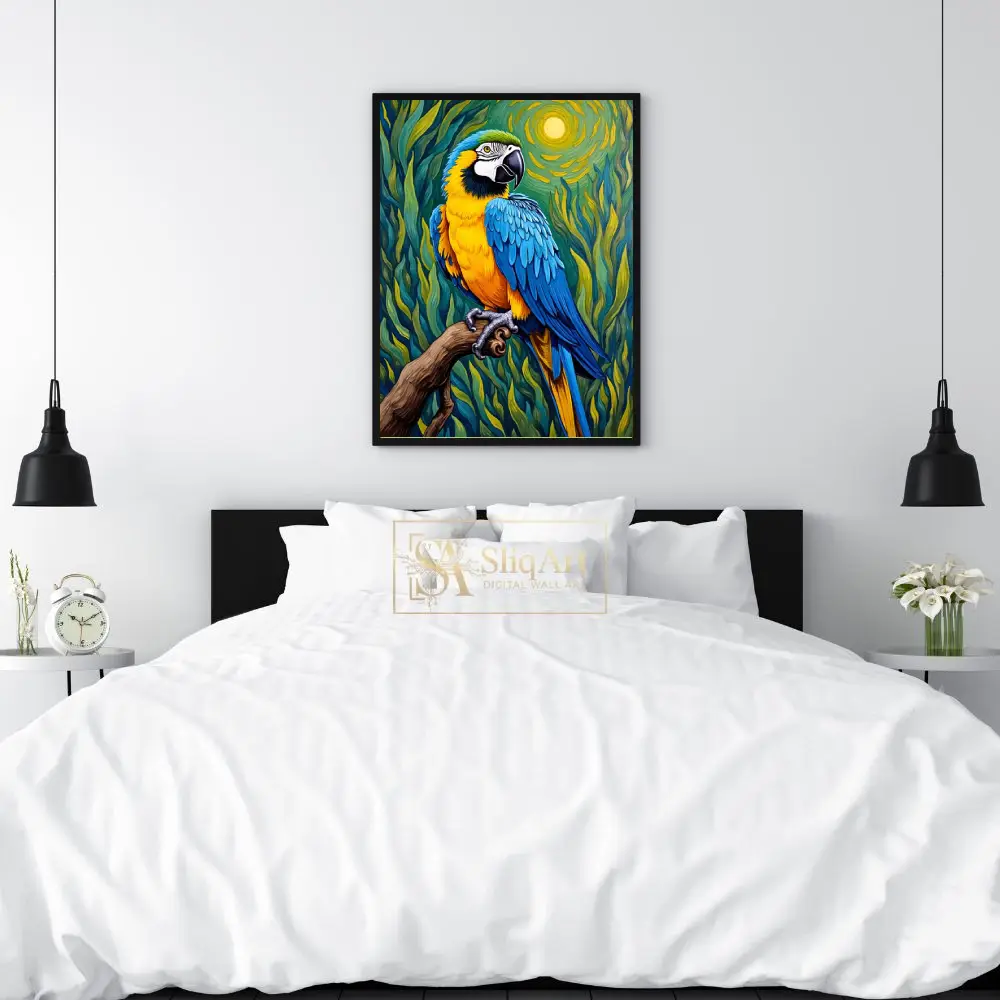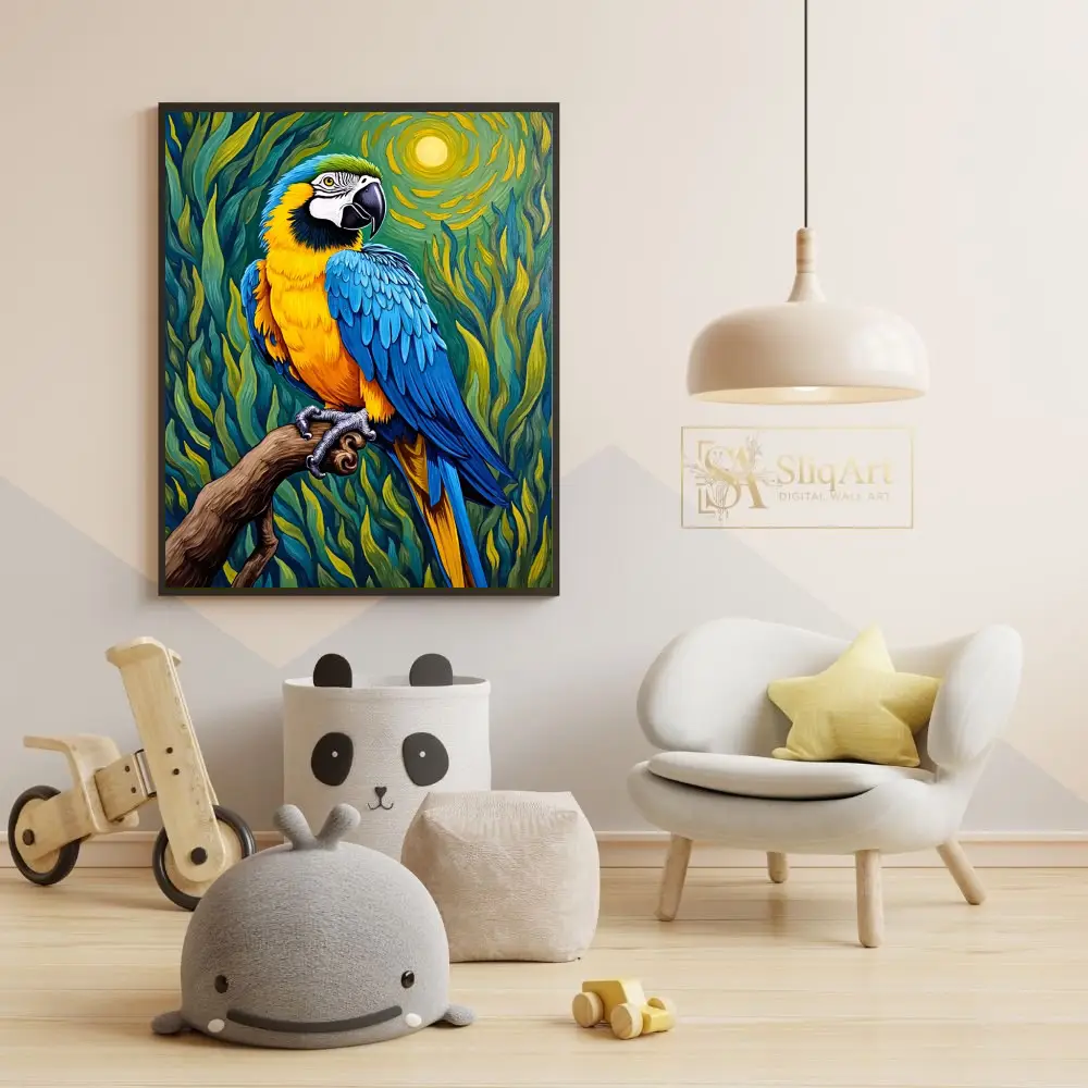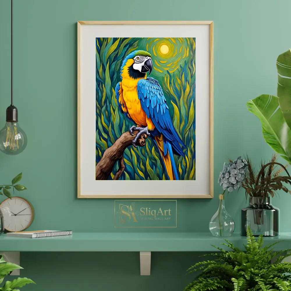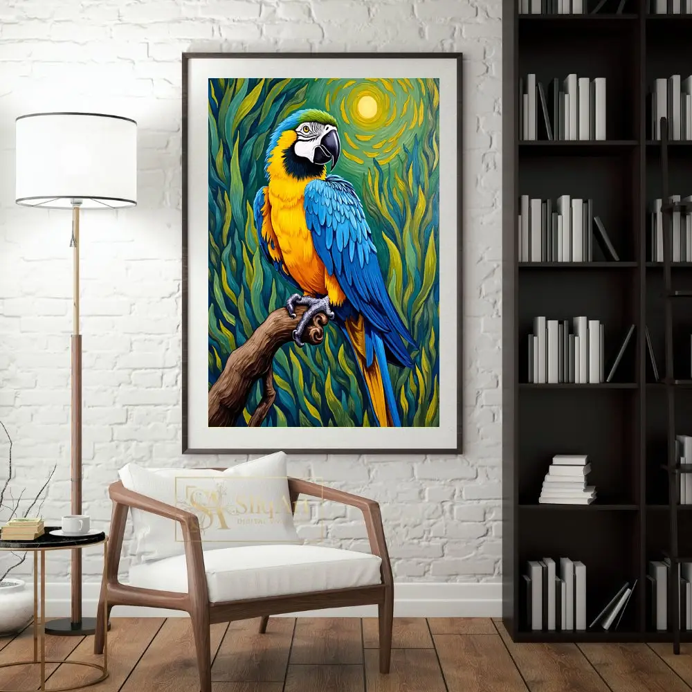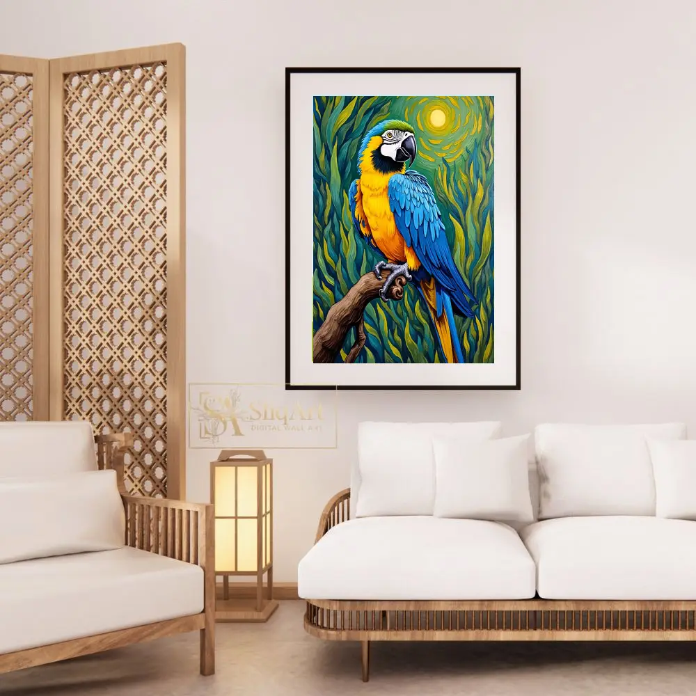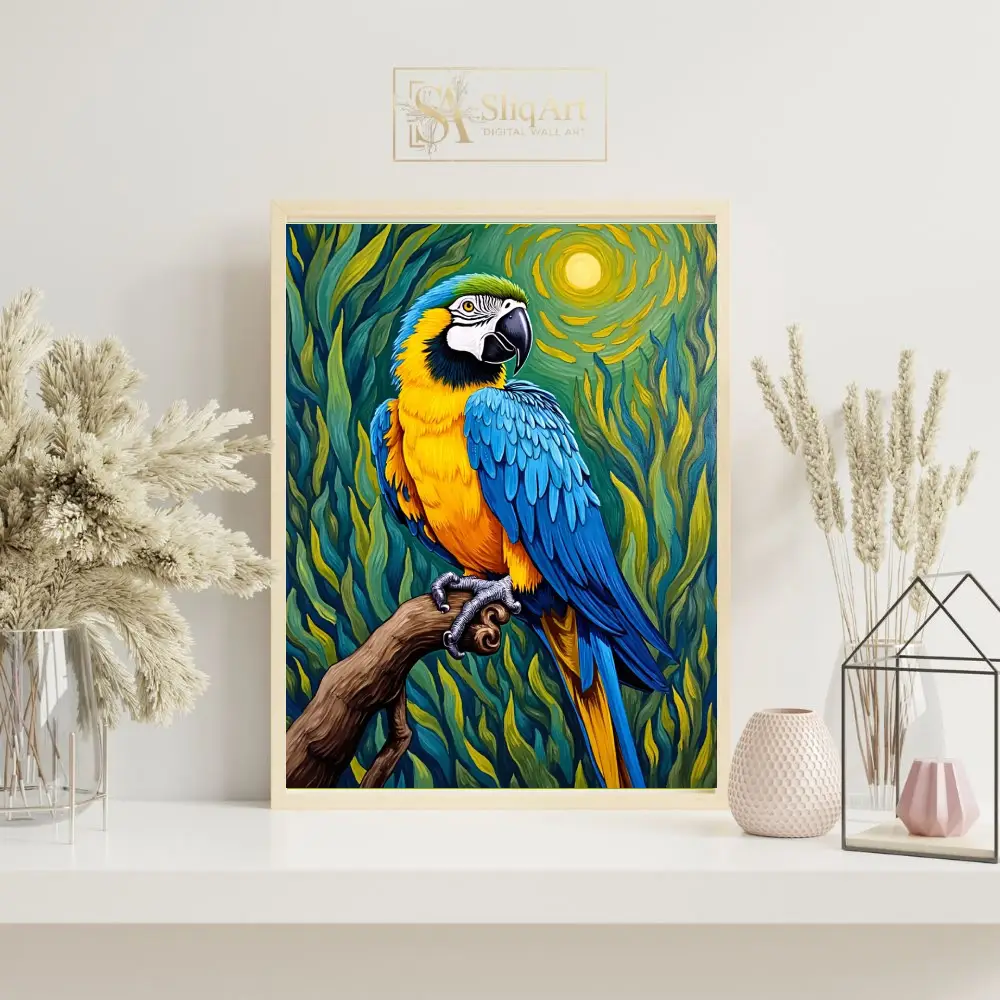 Bring the vibrant energy of the tropics into your home with this stunning Blue-and-yellow Macaw canvas art. Rendered in a dynamic post-impressionist style, this piece features bold, rhythmic brushstrokes and a swirling golden sun that evokes the heat and light of a sun-drenched jungle.