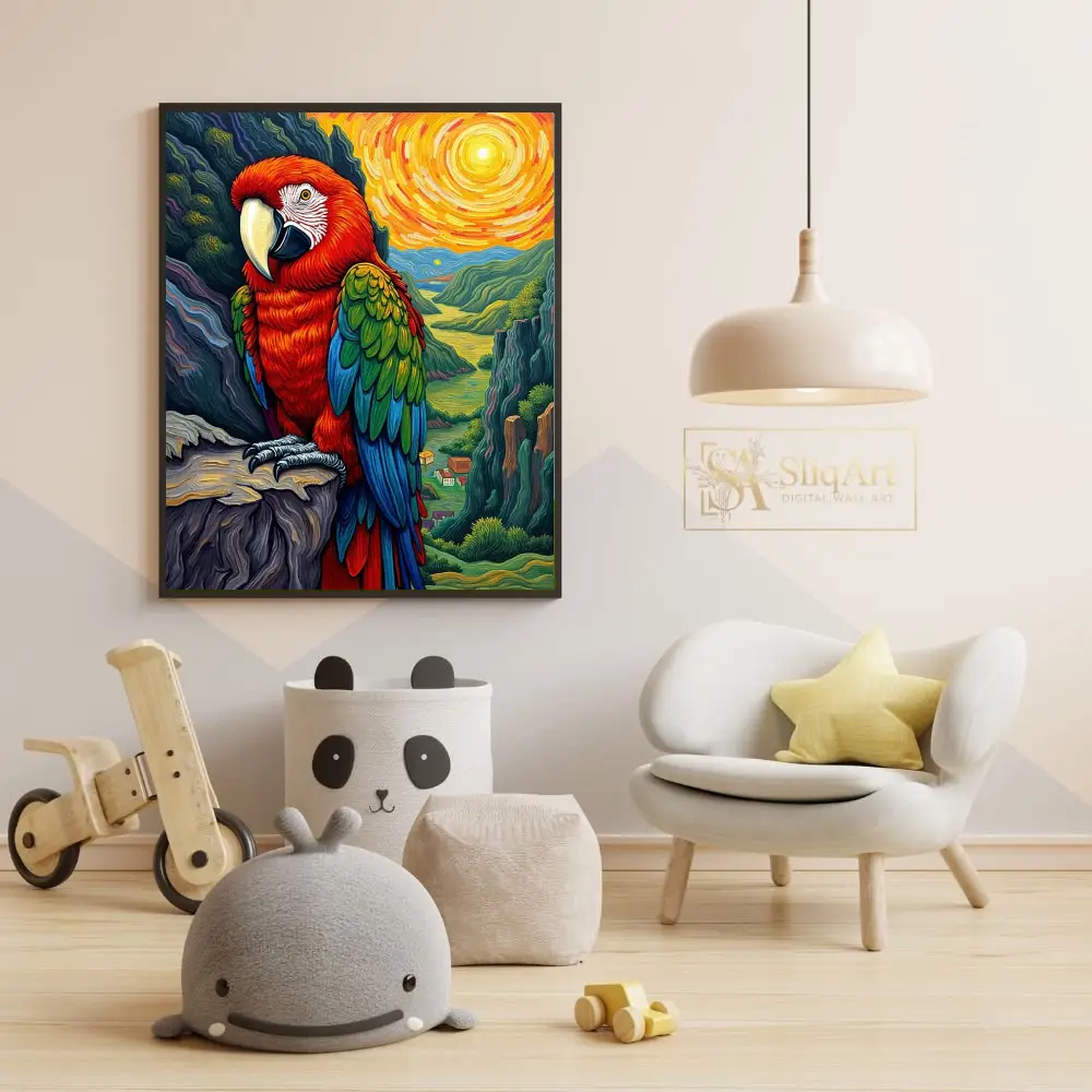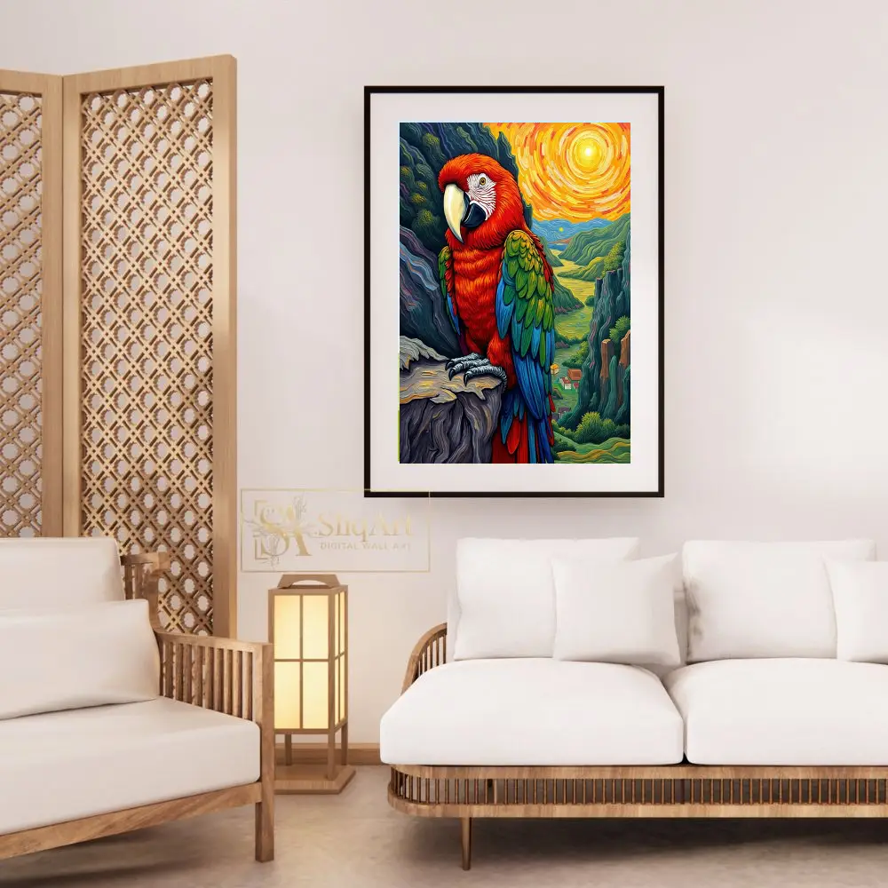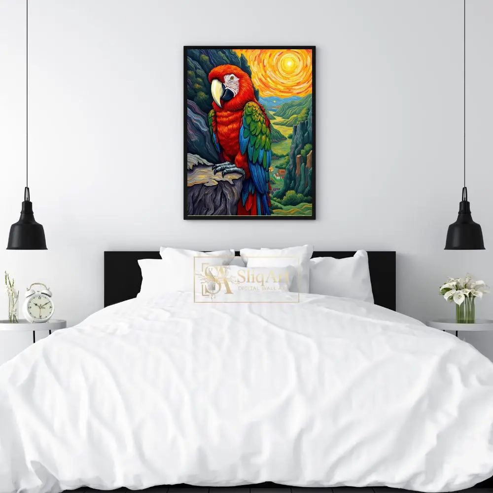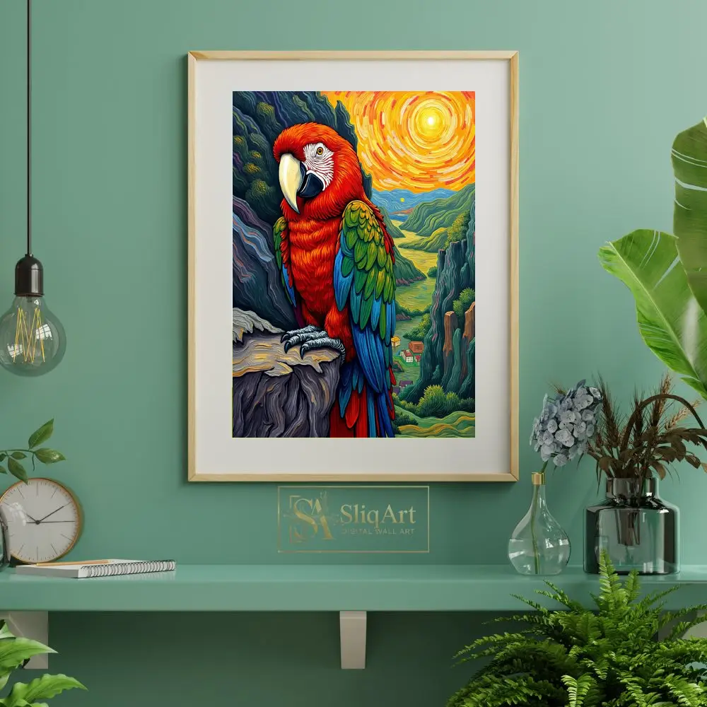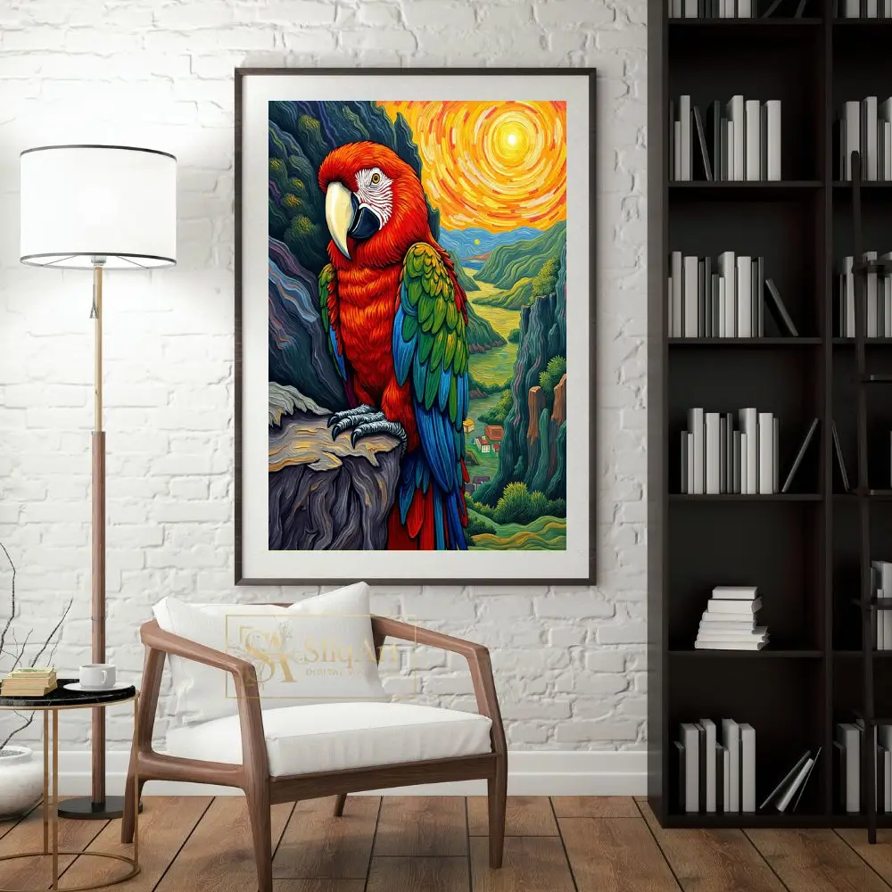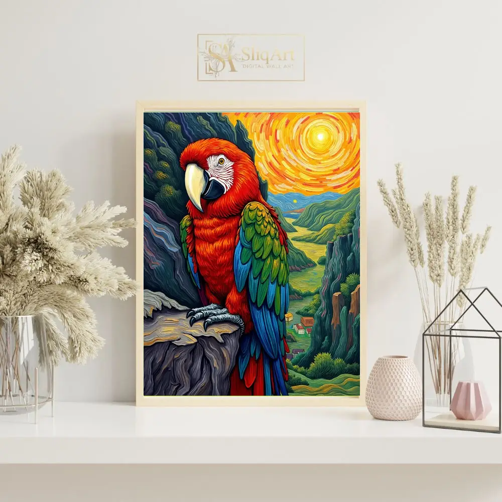 Bring the energy of the tropics into your home with this stunning impressionist-style macaw painting. Featuring a bold scarlet macaw perched majestically against a swirling, sun-drenched valley, this piece uses thick, textured brushstrokes reminiscent of Van Gogh.