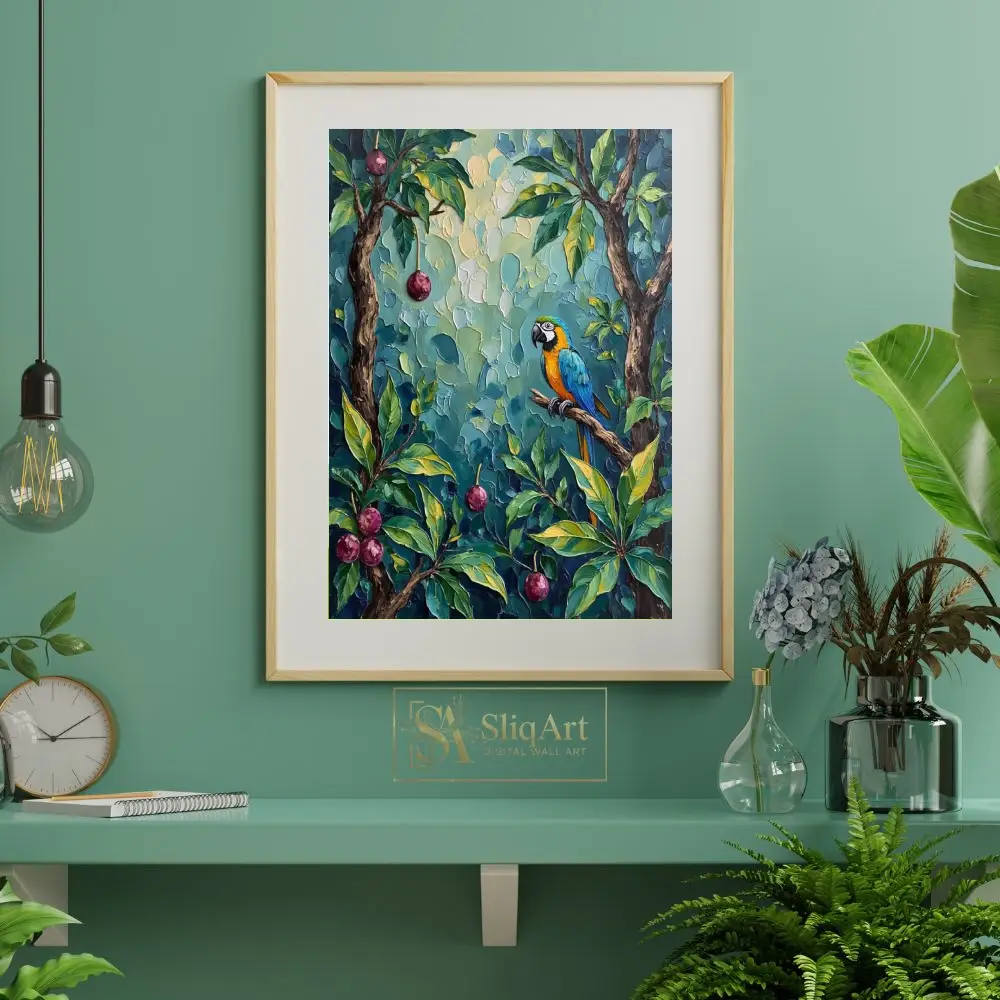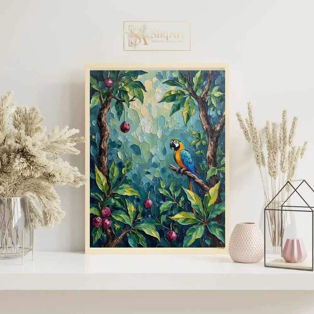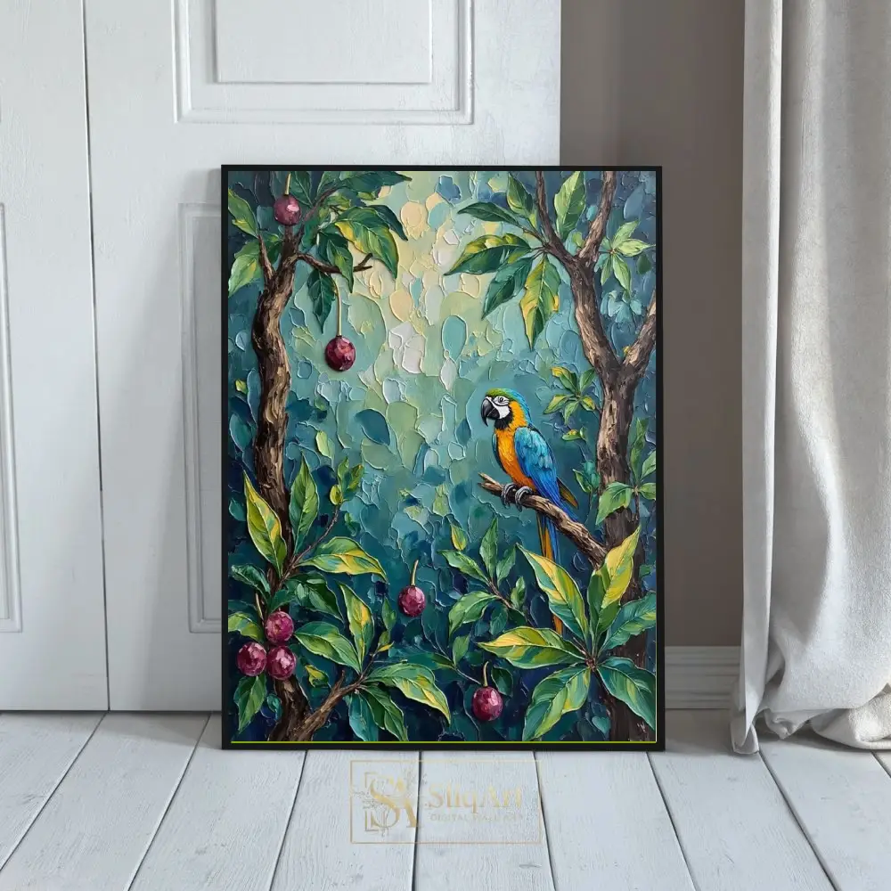 Featuring a majestic blue and gold macaw perched amidst a lush canopy of emerald leaves and deep purple fruit, this piece uses thick, expressive brushstrokes to create a tactile sense of depth and life. The interplay of light and shadow within the textured background adds a serene, atmospheric quality, capturing the quiet vibrancy of a hidden jungle sanctuary.