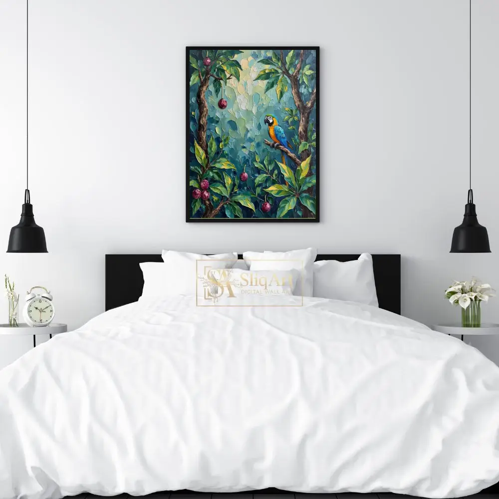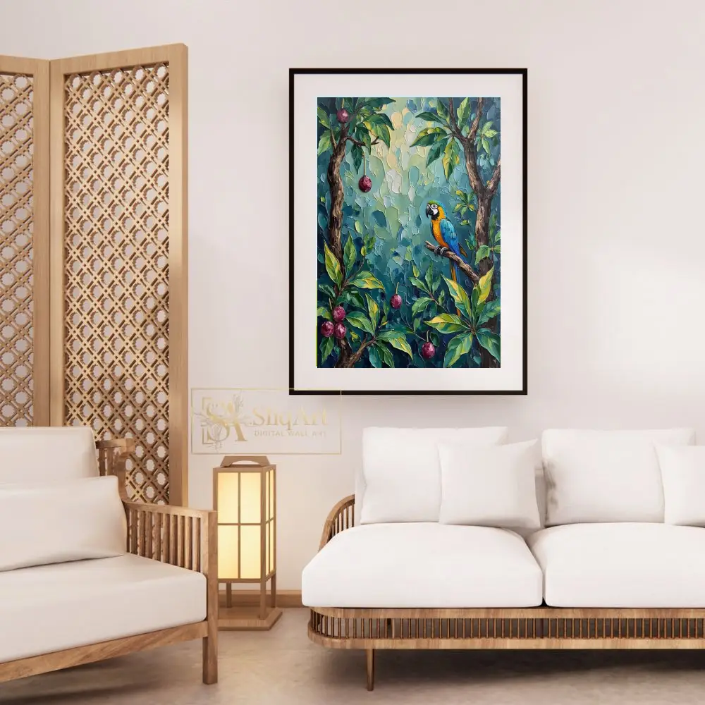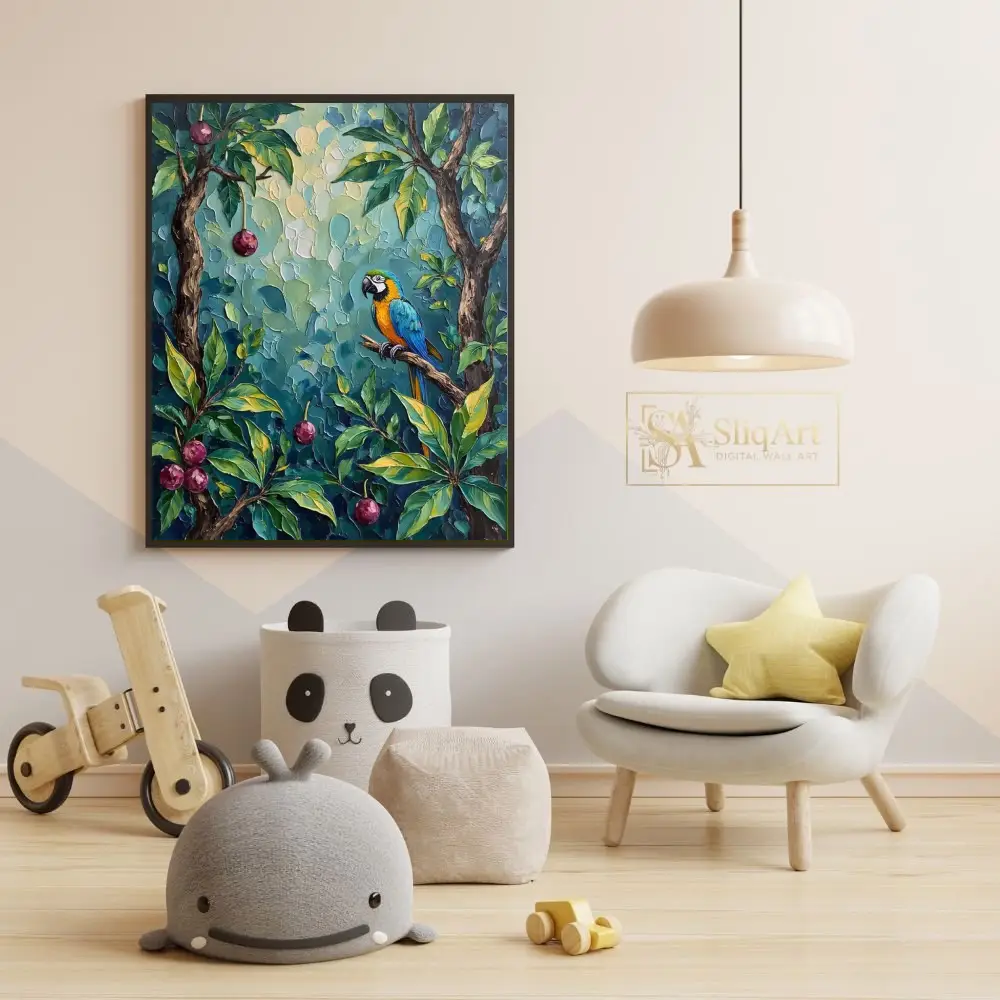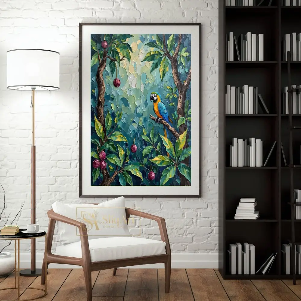 Featuring a majestic blue and gold macaw perched amidst a lush canopy of emerald leaves and deep purple fruit, this piece uses thick, expressive brushstrokes to create a tactile sense of depth and life. The interplay of light and shadow within the textured background adds a serene, atmospheric quality, capturing the quiet vibrancy of a hidden jungle sanctuary.