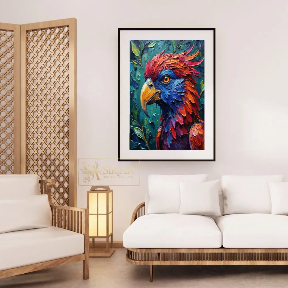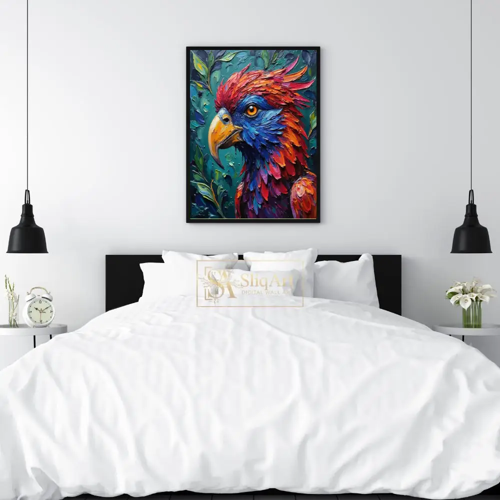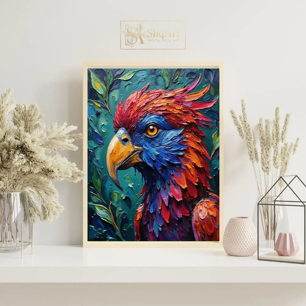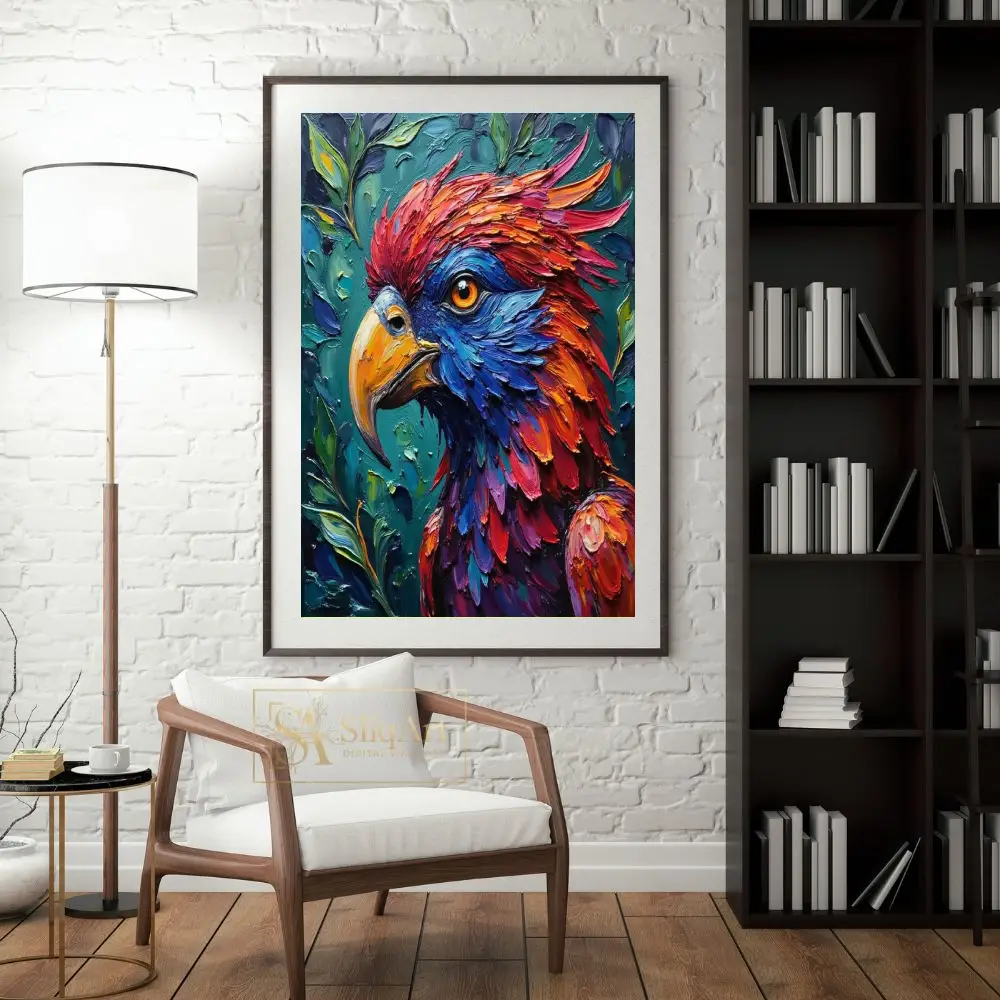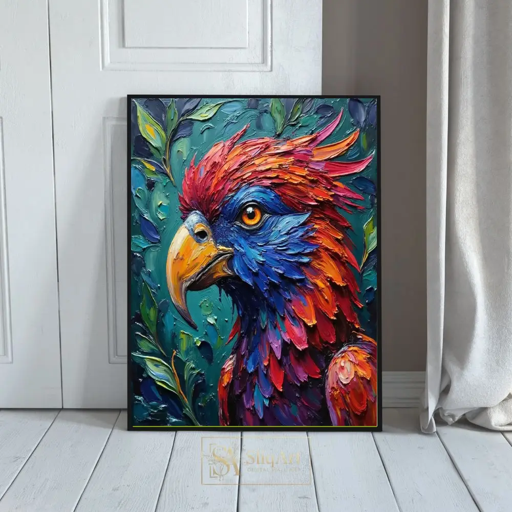 Discover the breathtaking beauty of nature with this vibrant impasto bird portrait. The artist utilizes thick, expressive brushstrokes to create a dynamic sense of depth and movement, bringing the avian subject to life in a flurry of rich reds, fiery oranges, and deep electric blues.