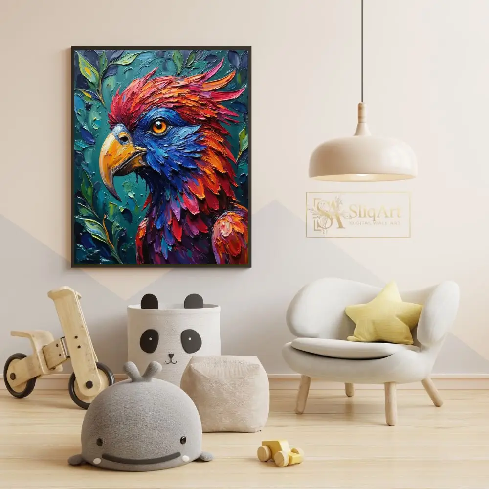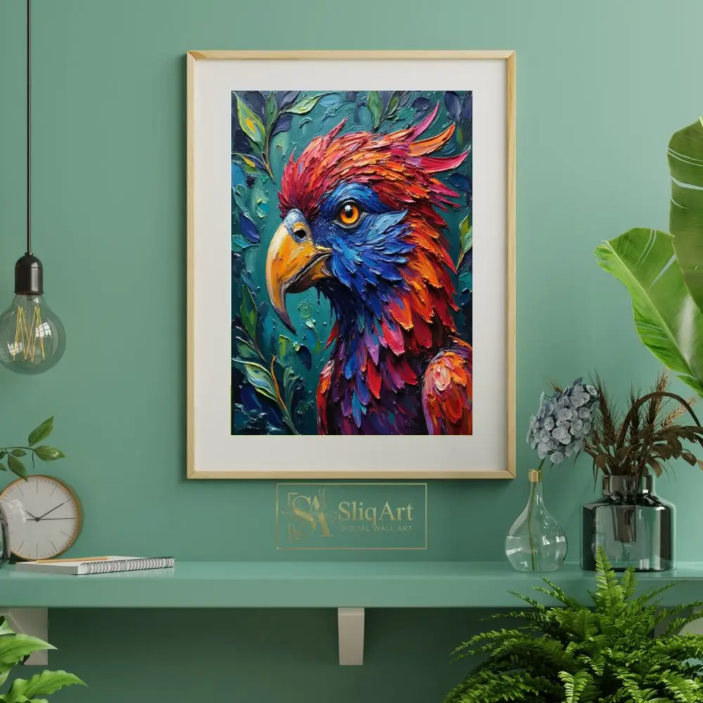 The bird’s piercing orange eye serves as a soulful focal point, contrasting beautifully against the dark teal and emerald green foliage in the background. This expressive piece of art is perfect for those looking to add a burst of energy and contemporary flair to their home decor through high-texture, modern wildlife representation.