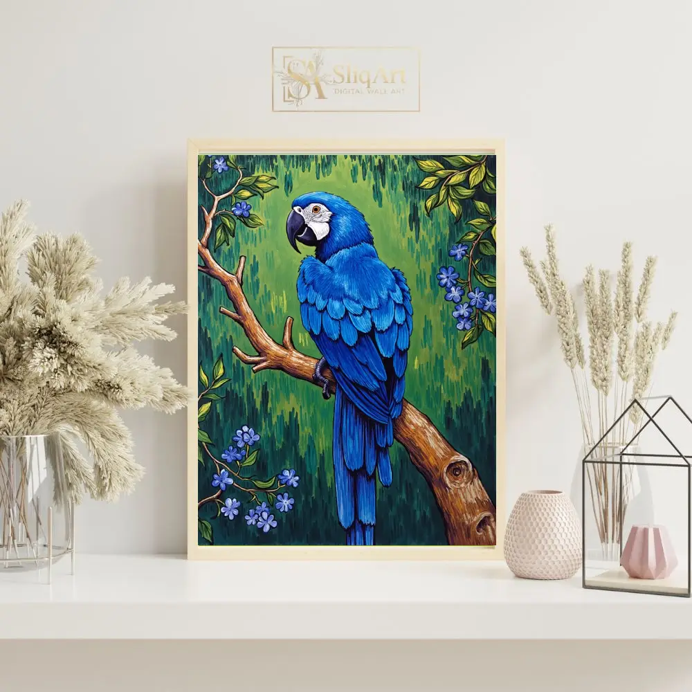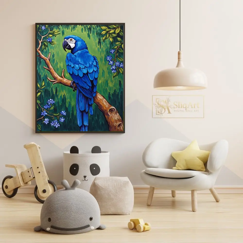 Bring the vibrant energy of the tropics into your home with this stunning illustration of an Electric Blue Macaw. Perched gracefully on a textured wooden branch, the parrot’s brilliant sapphire feathers contrast beautifully against a rich emerald green backdrop.