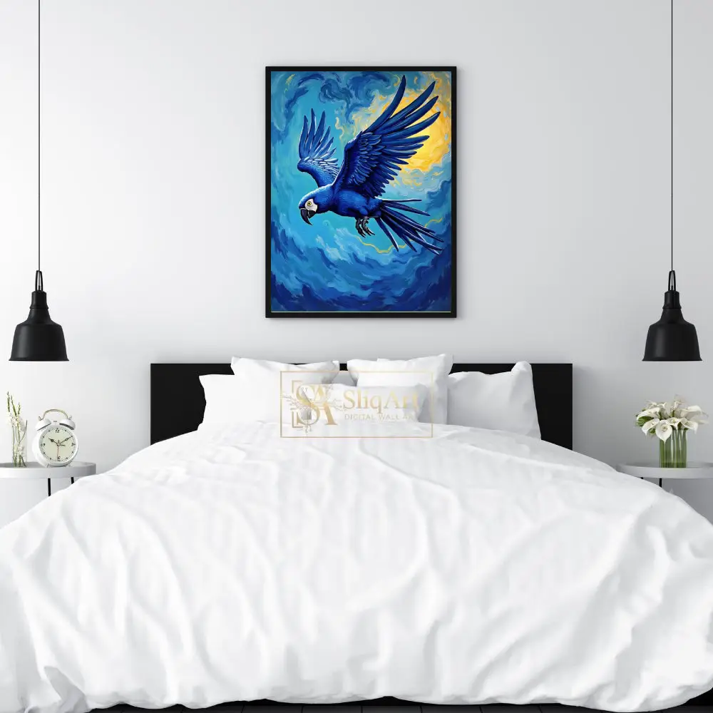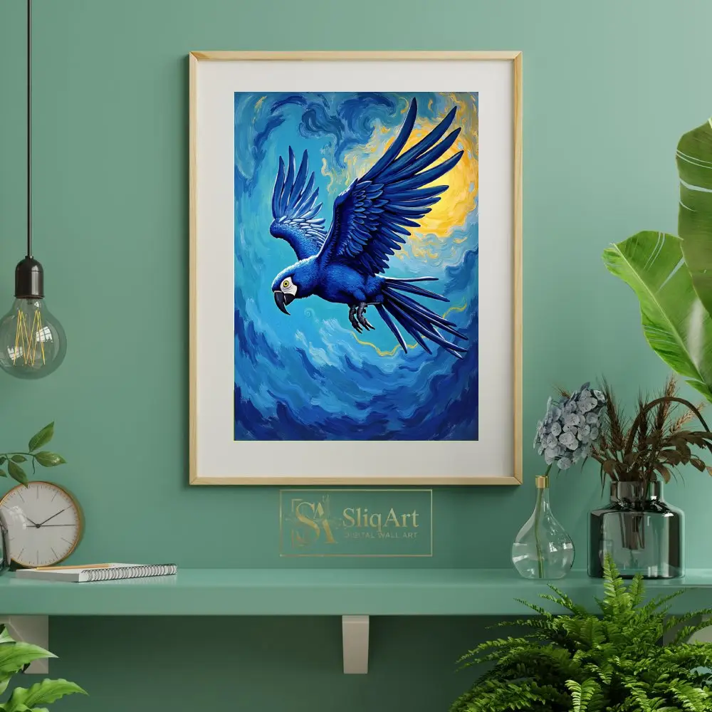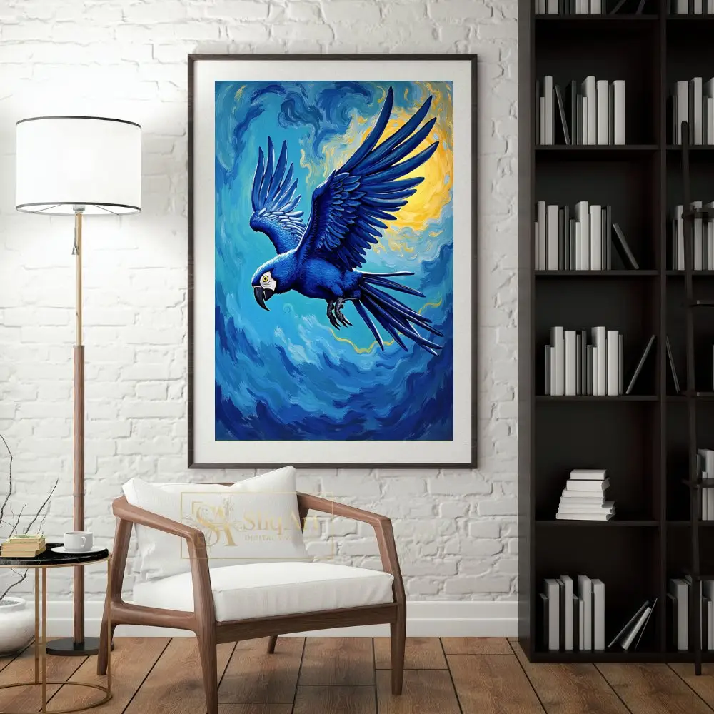 Experience the majestic beauty of a Hyacinth Macaw in full flight, rendered in a breathtaking Post-Impressionist style. This piece features a striking blue parrot soaring through a sky filled with energetic, swirling brushstrokes reminiscent of Van Gogh’s masterpieces.