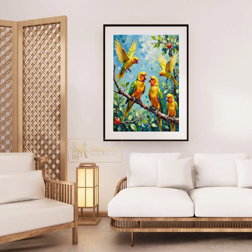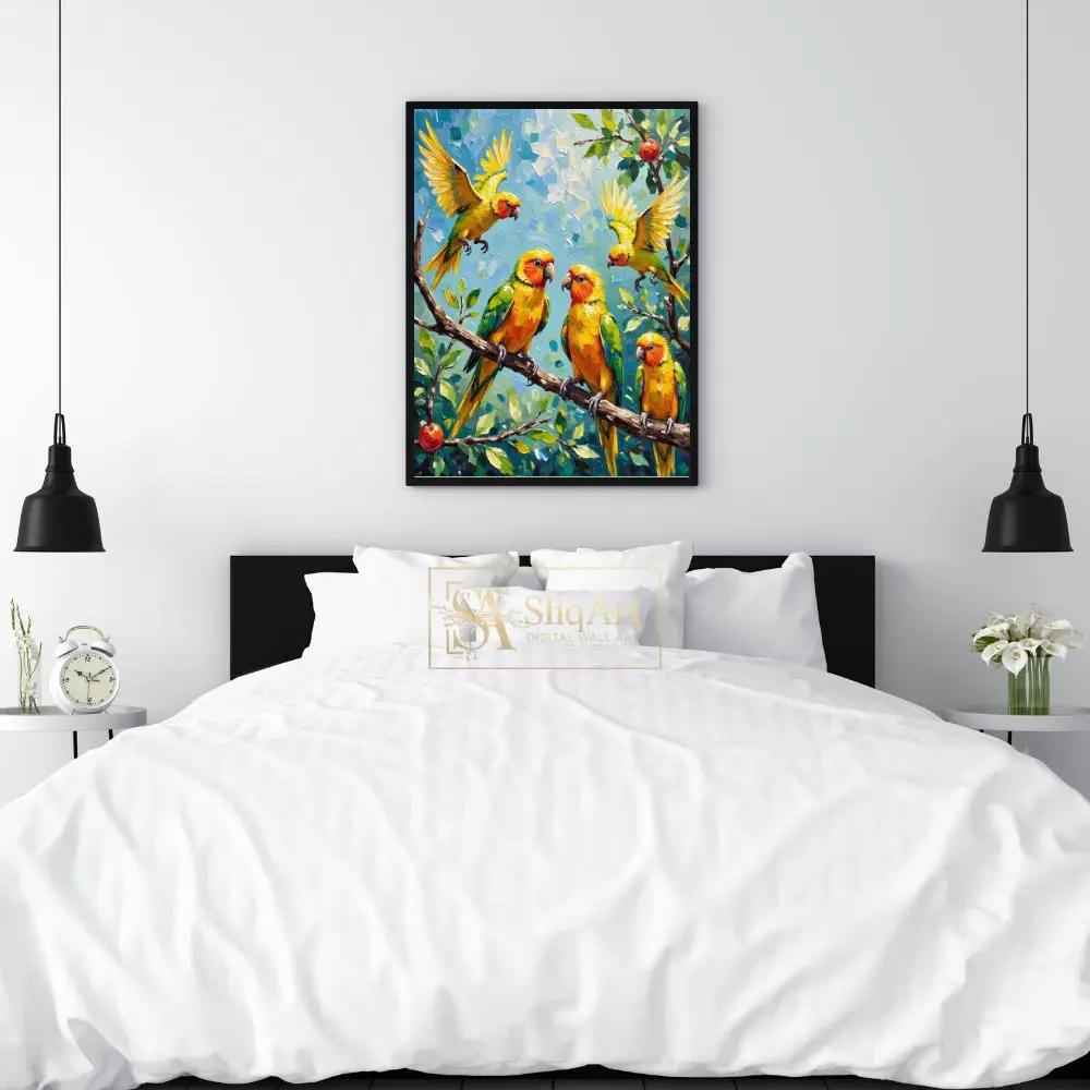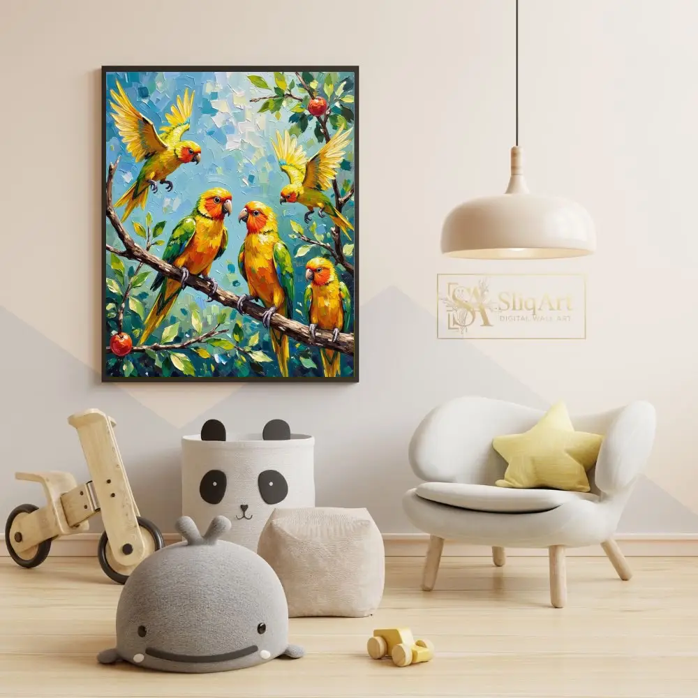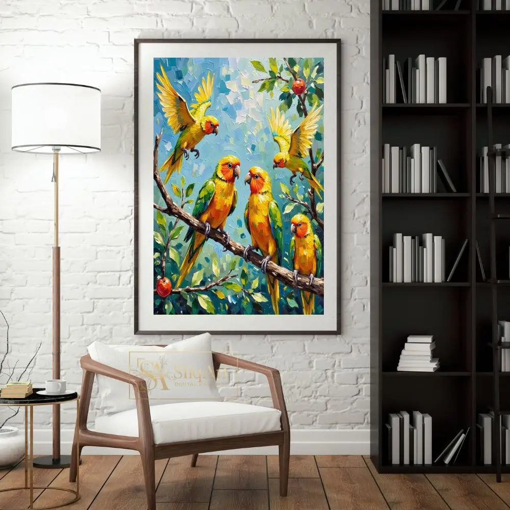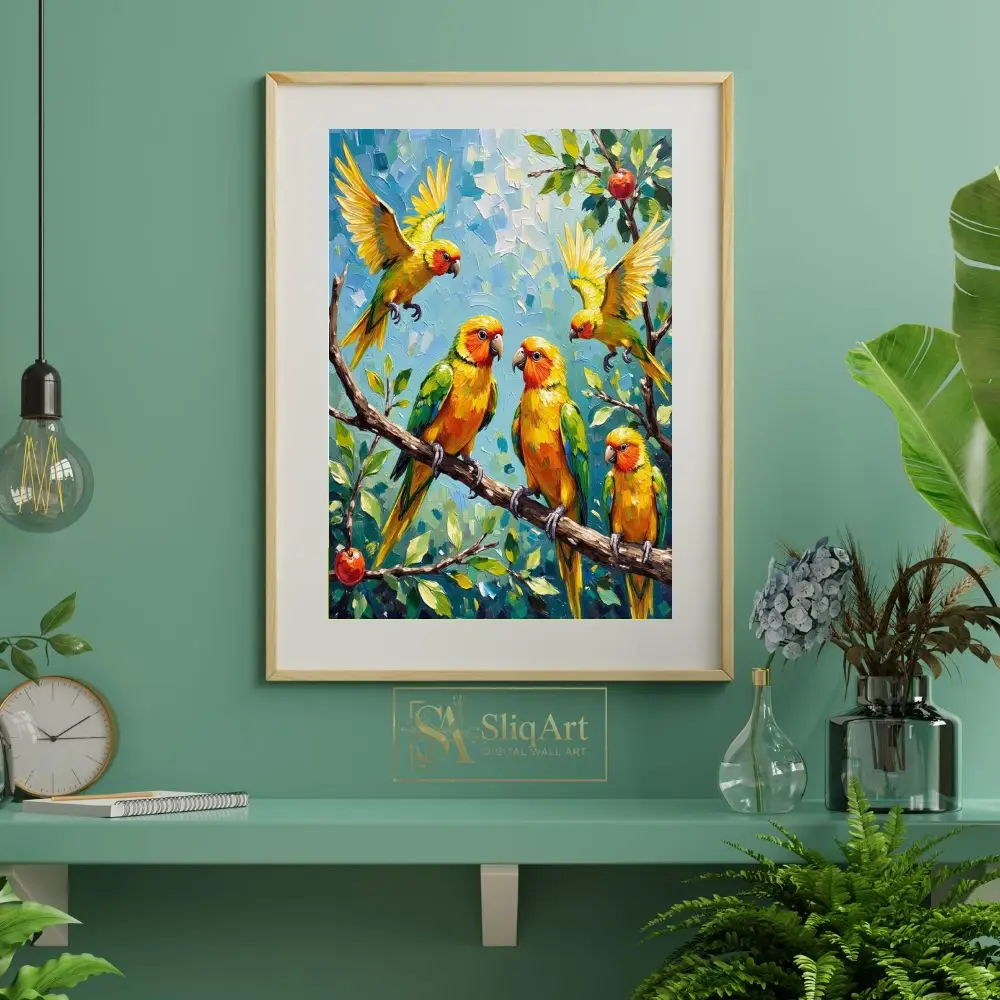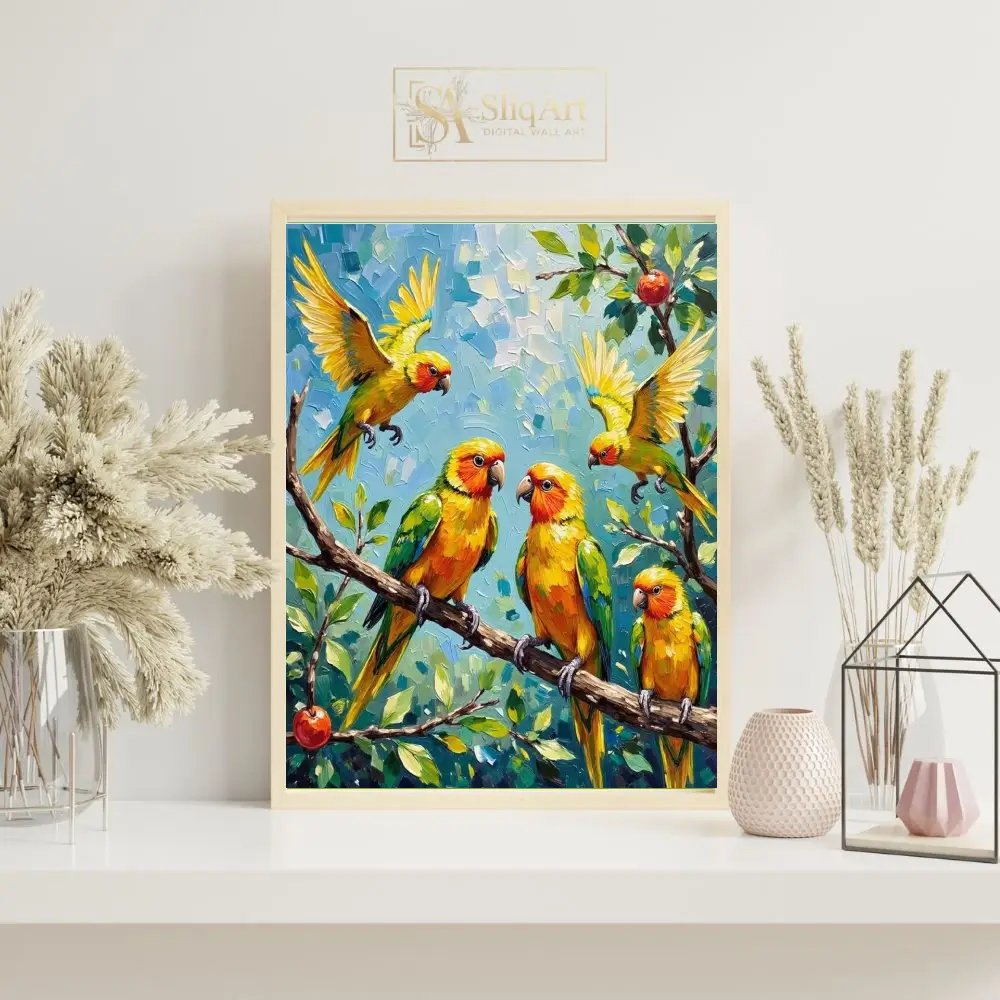 This stunning impasto-style artwork captures the lively spirit of five Sun Conure parrots in a lush, tropical setting. The thick, textured brushstrokes and palette knife techniques create a dynamic sense of movement and depth.