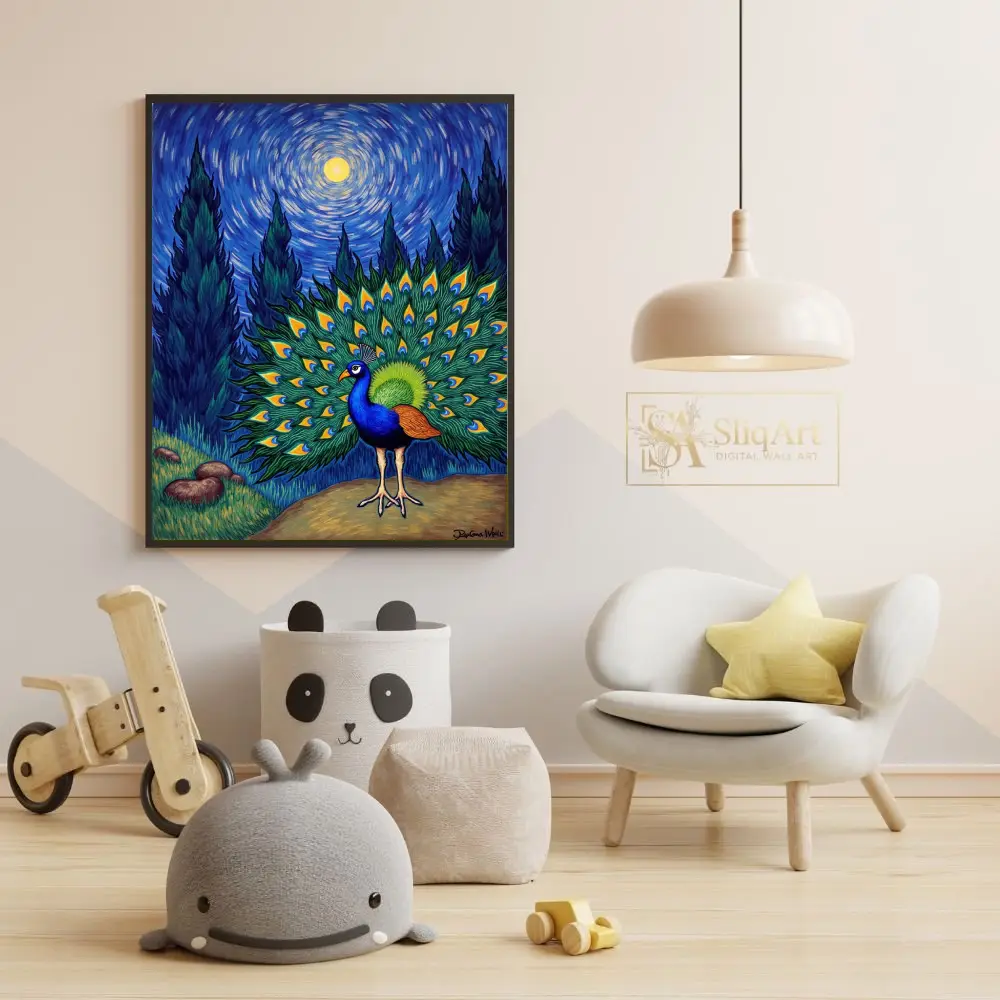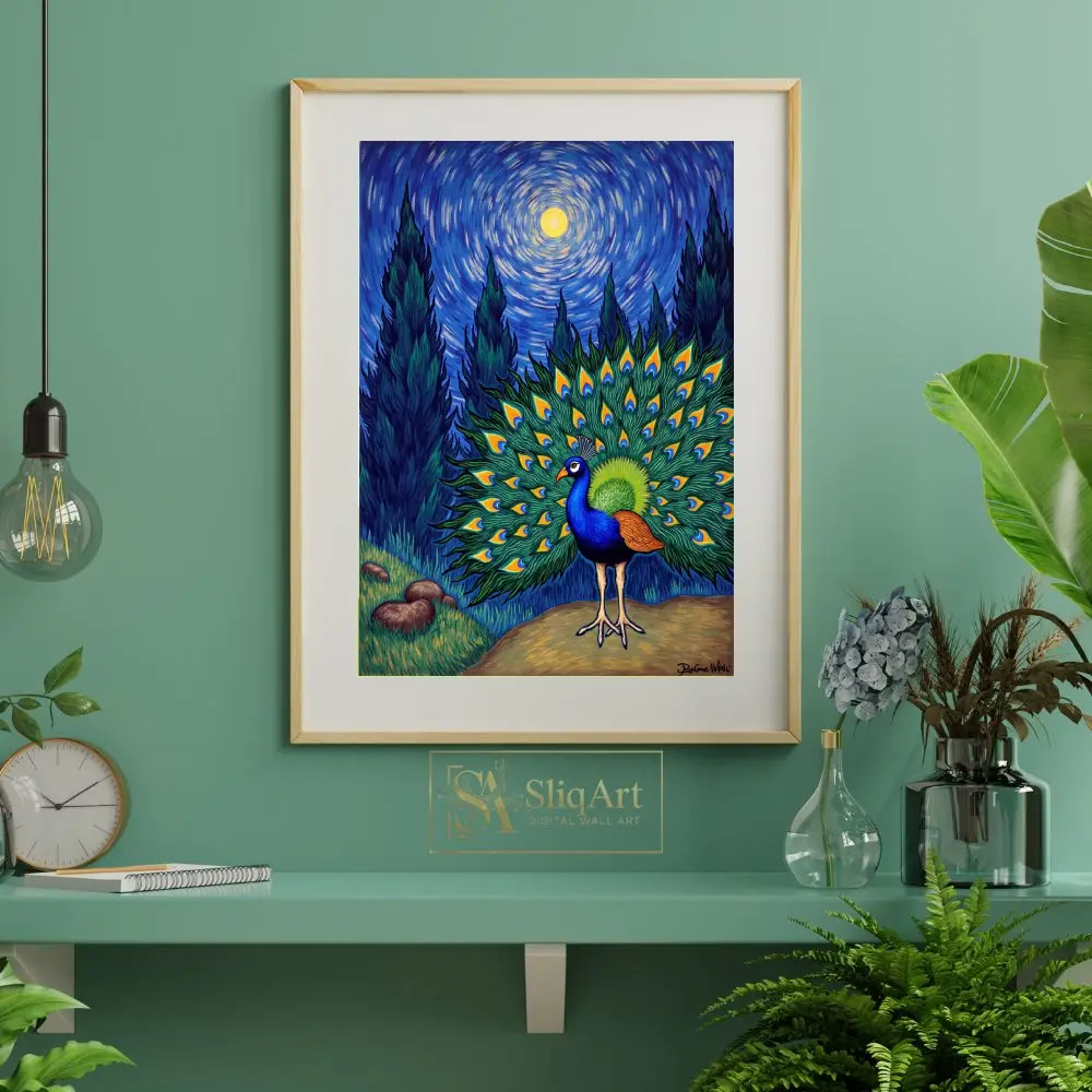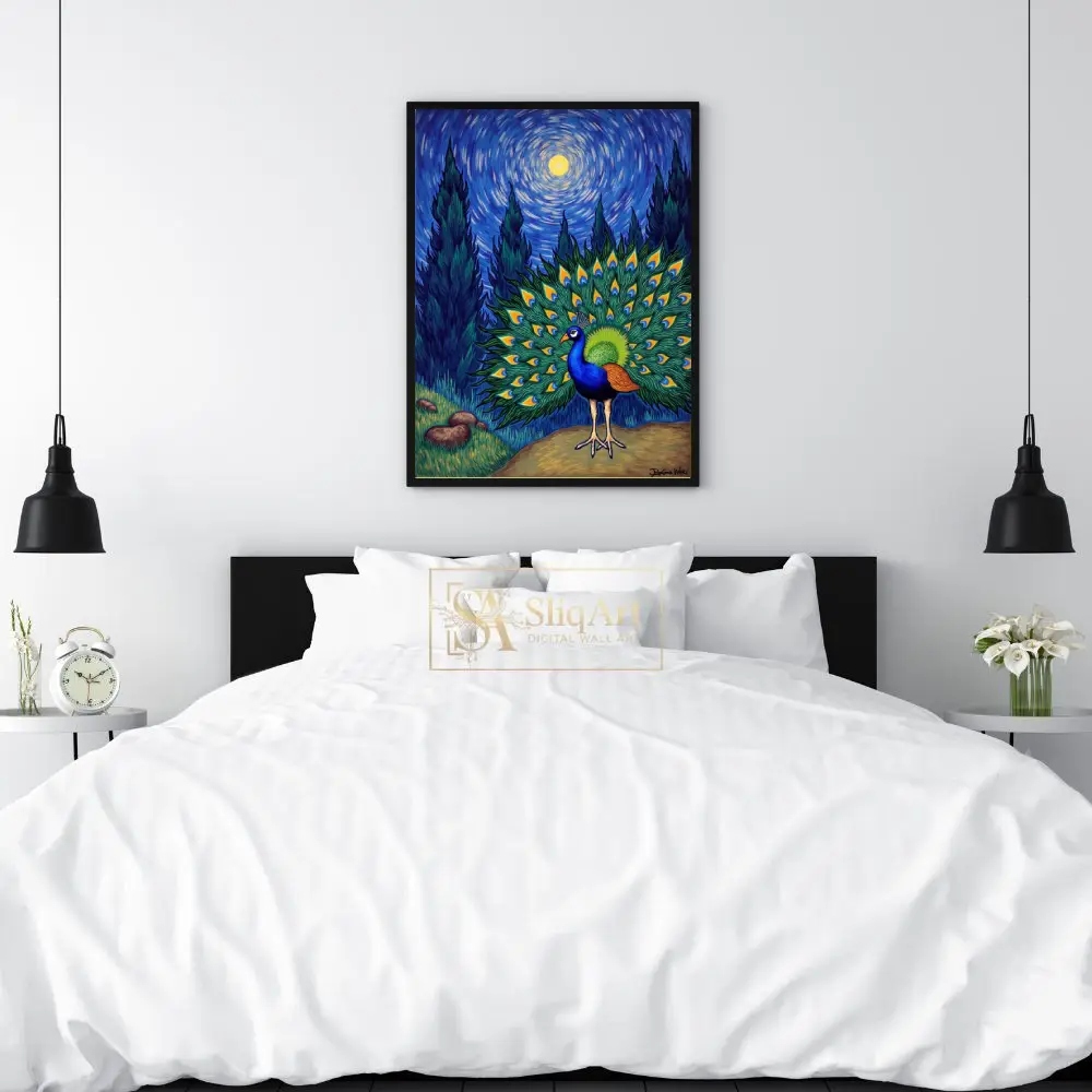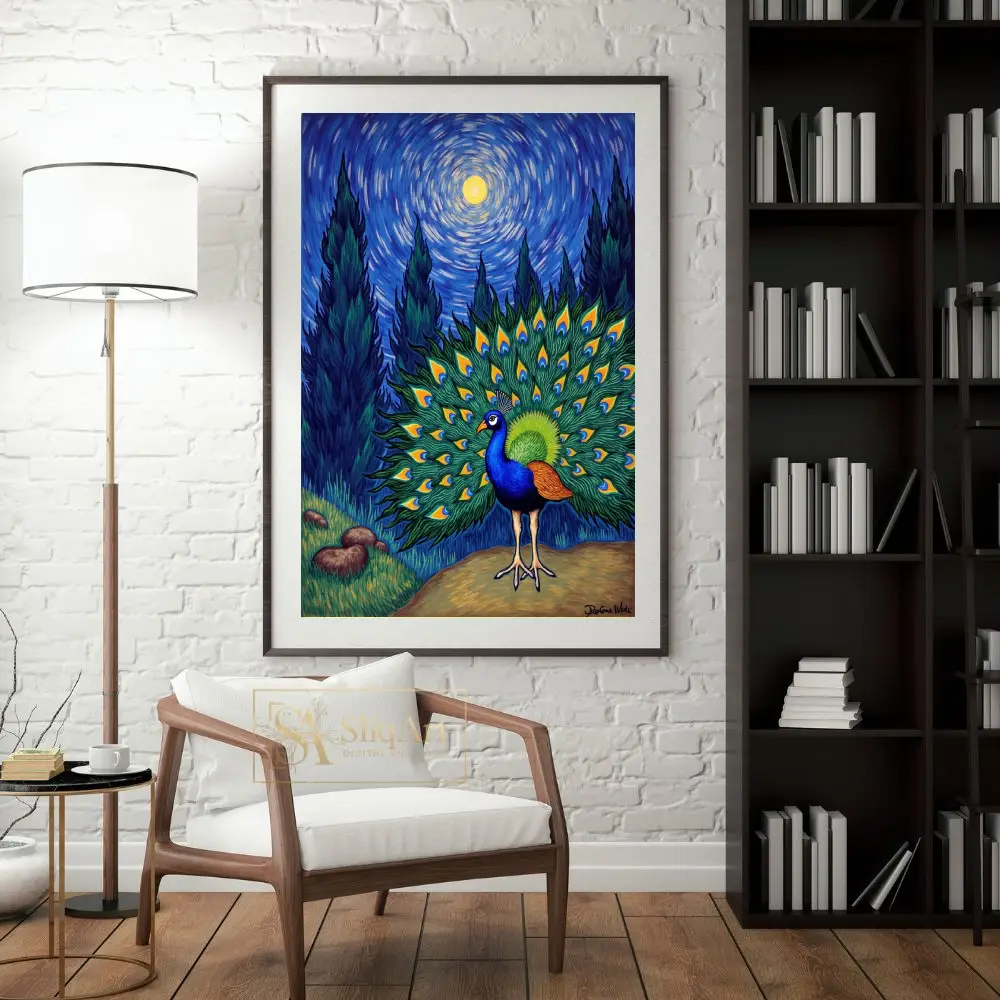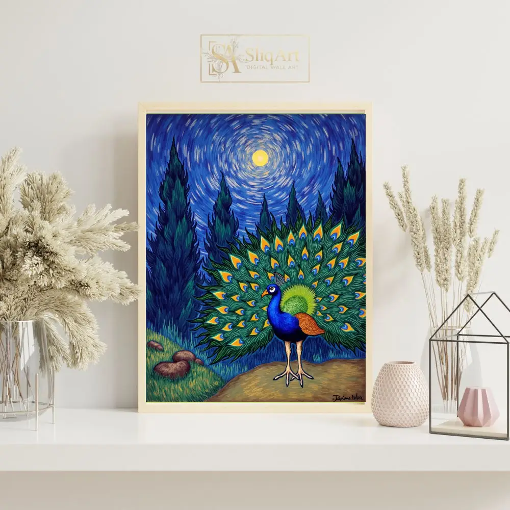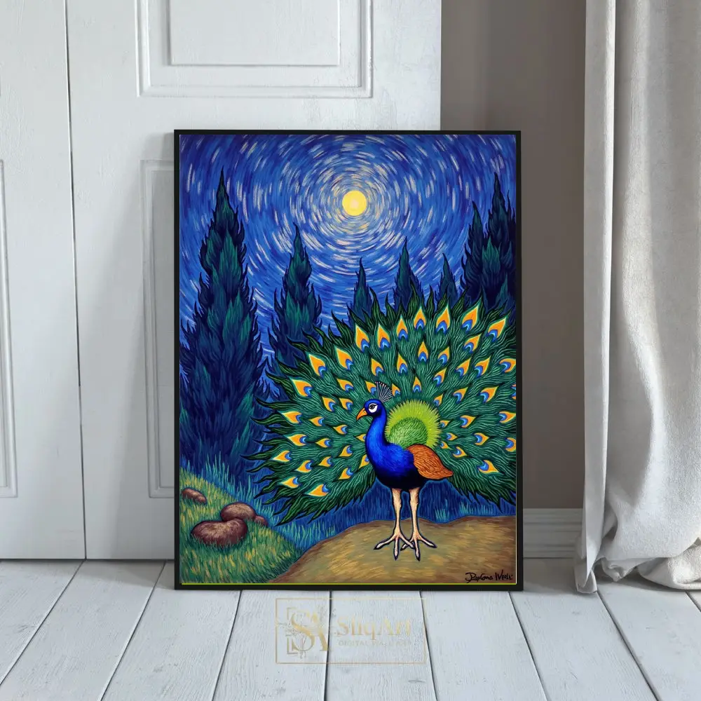 Experience a breathtaking fusion of nature’s majesty and art history’s most iconic aesthetic. This stunning piece features a peacock in full display, its iridescent tail feathers forming a vibrant fan against a background inspired by Vincent van Gogh’s ‘The Starry Night’.