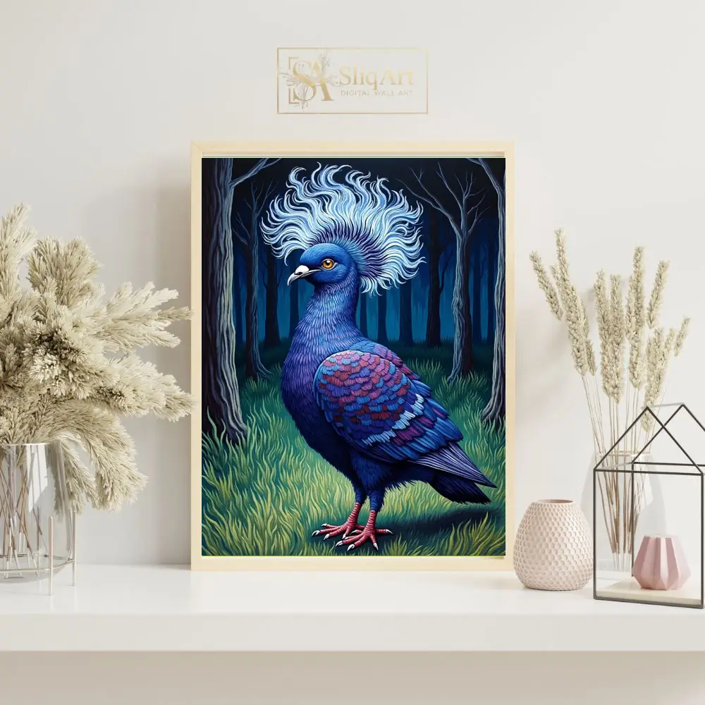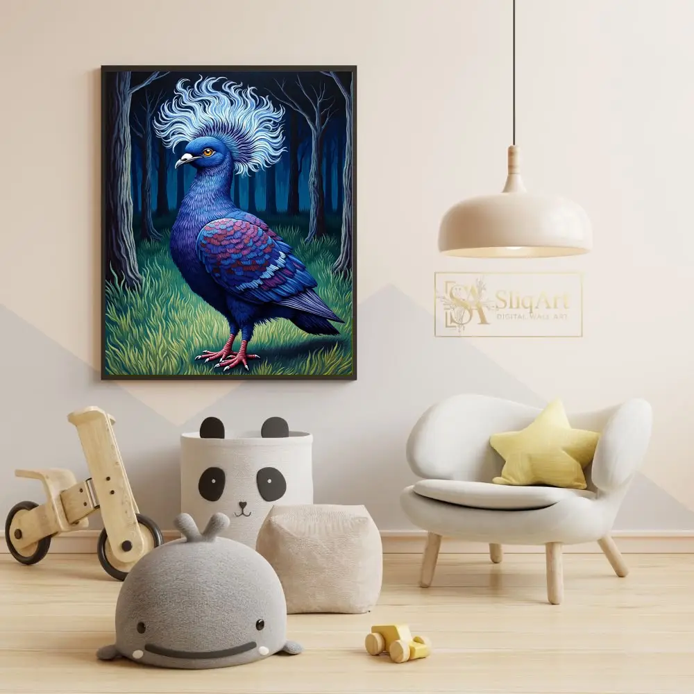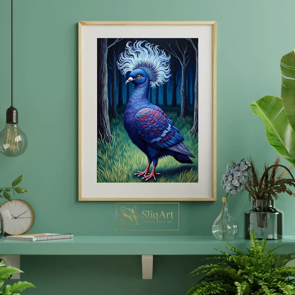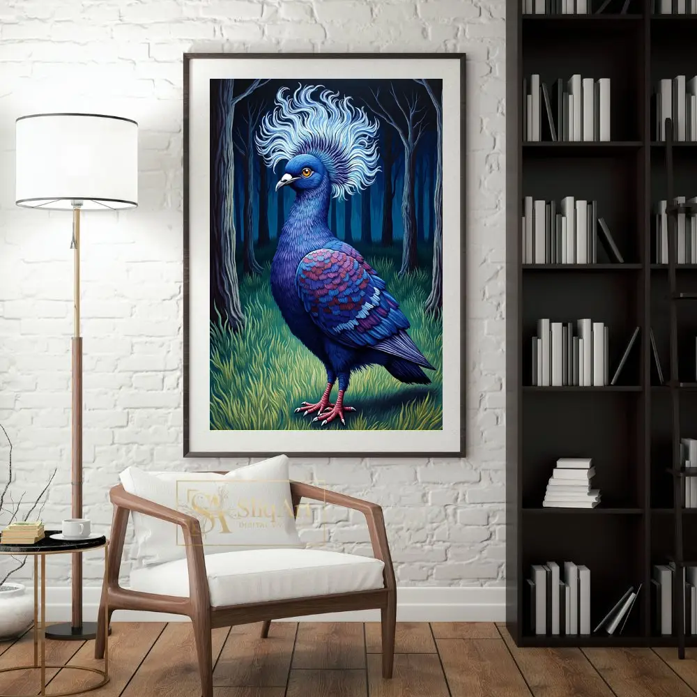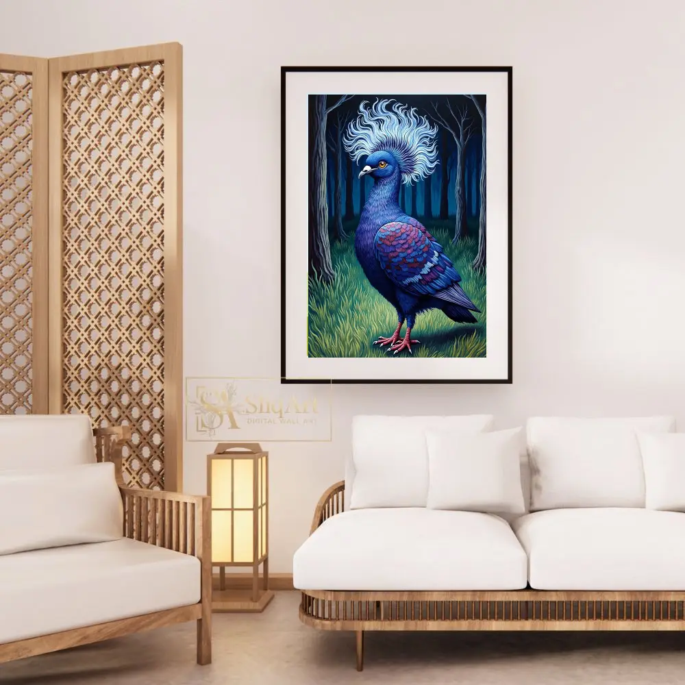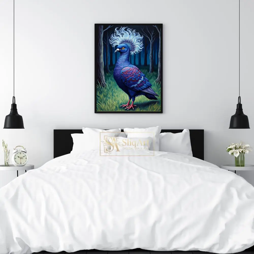 Elevate your interior with this striking illustration of a majestic blue crowned pigeon. Set against a mystical dark forest background, the bird’s intricate feather patterns in shades of indigo, magenta, and sapphire come alive.