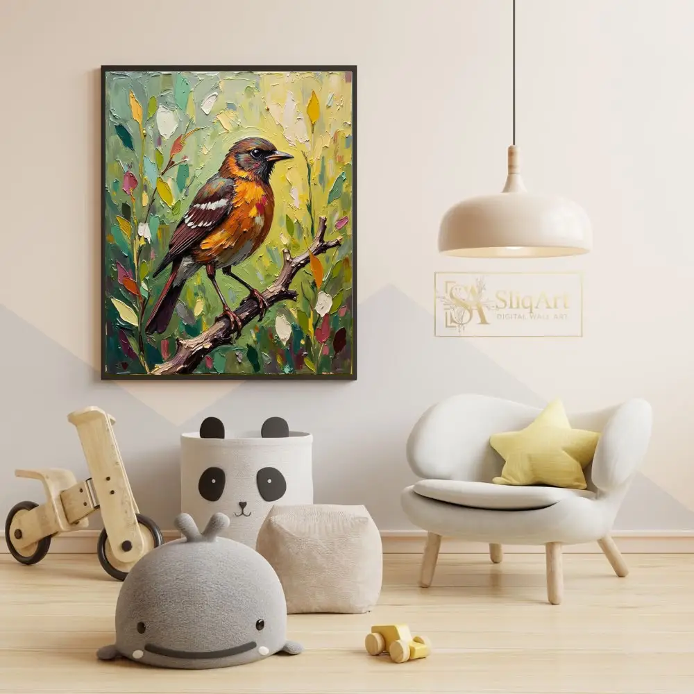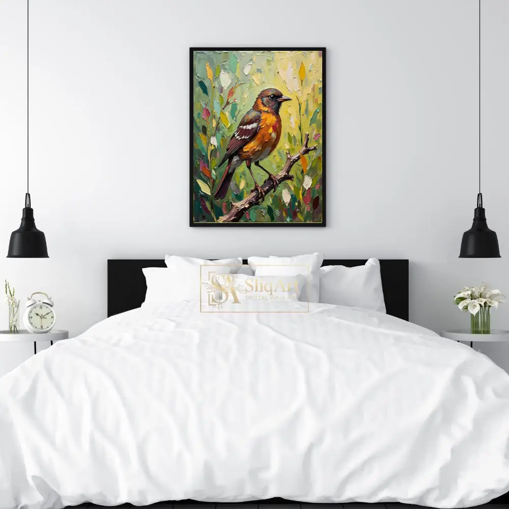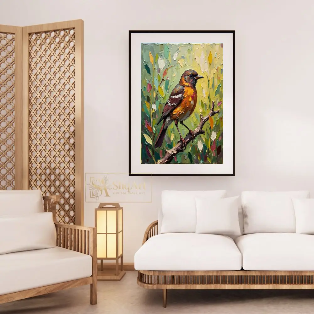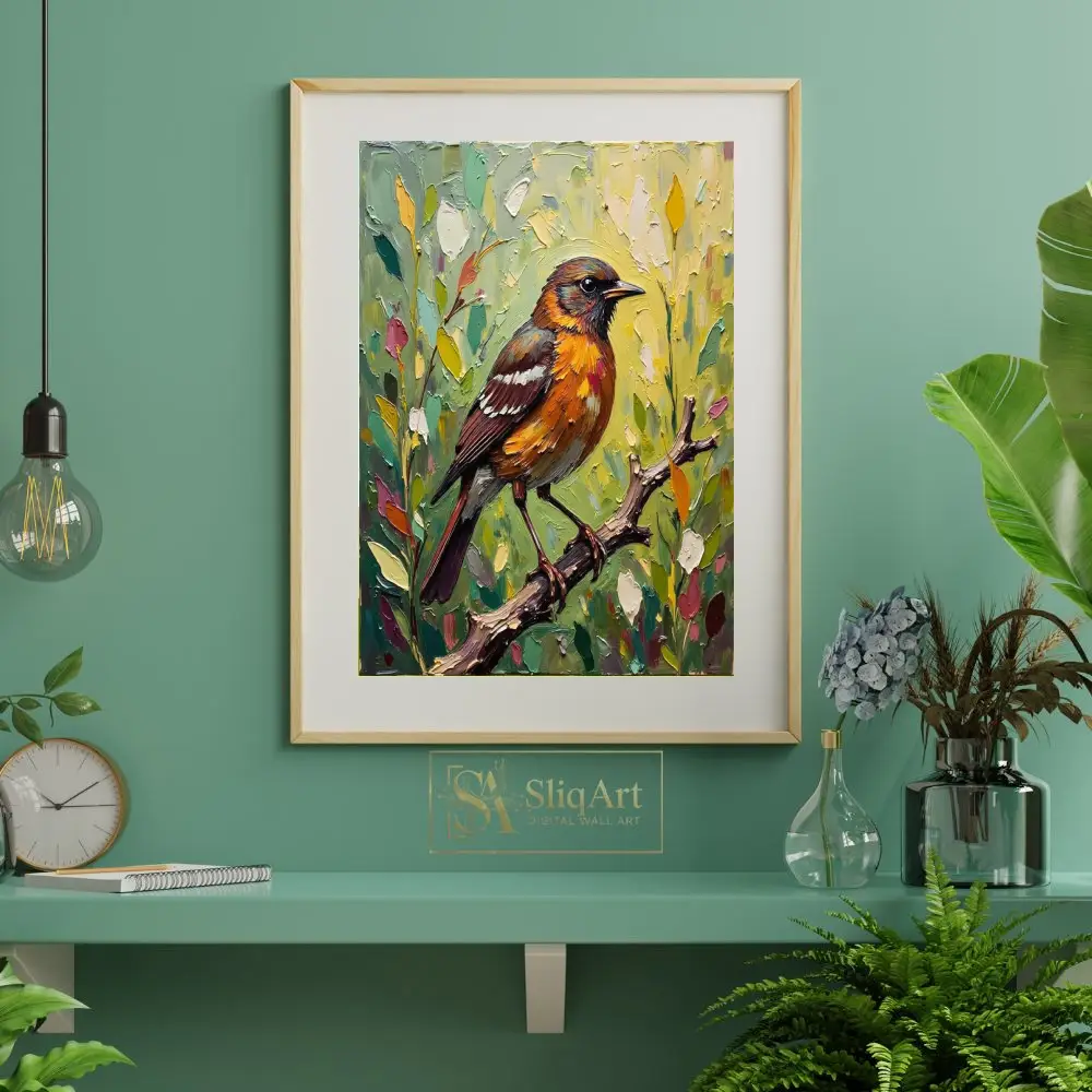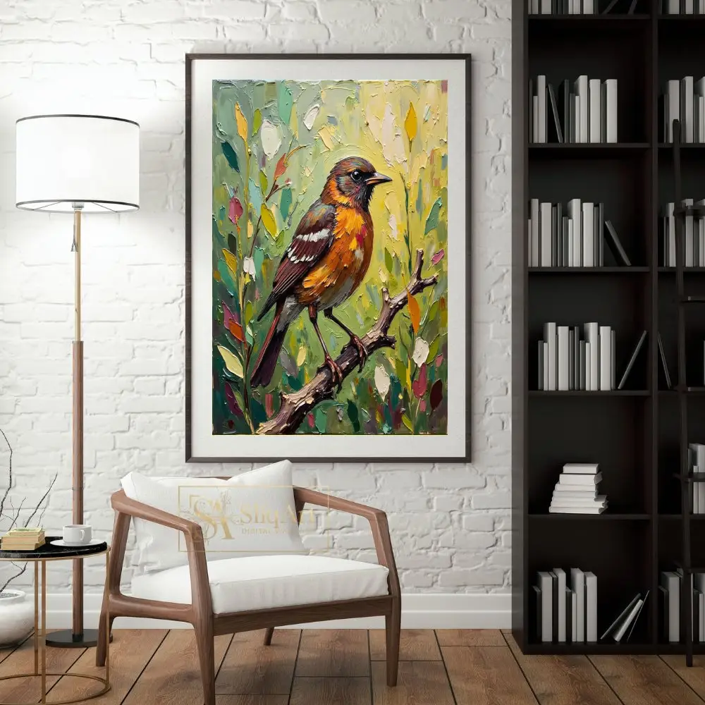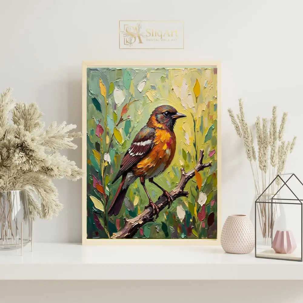 Add a touch of nature’s elegance to your home with this expressive impasto oil painting. The artwork features a stunning songbird with fiery orange and rich brown plumage, perched delicately on a textured branch.