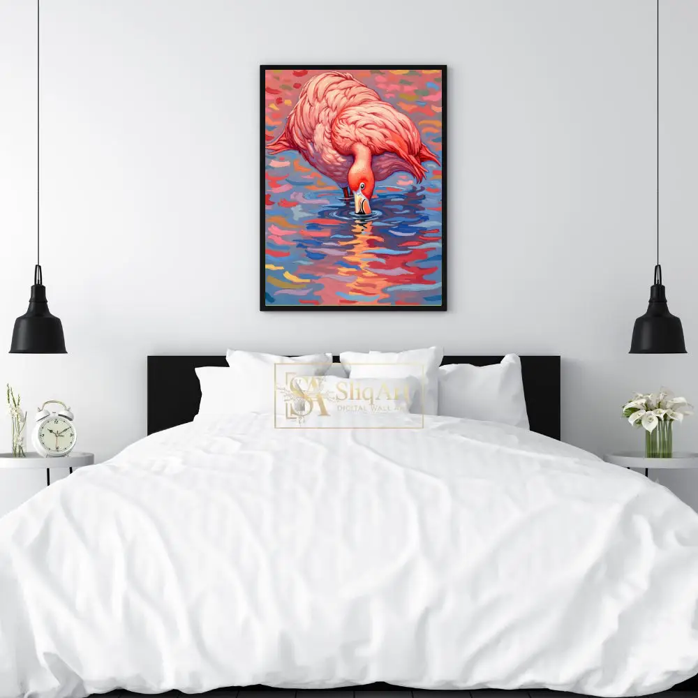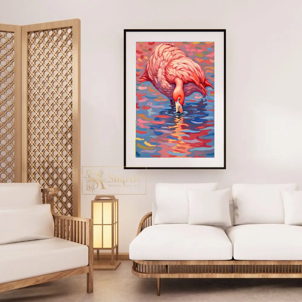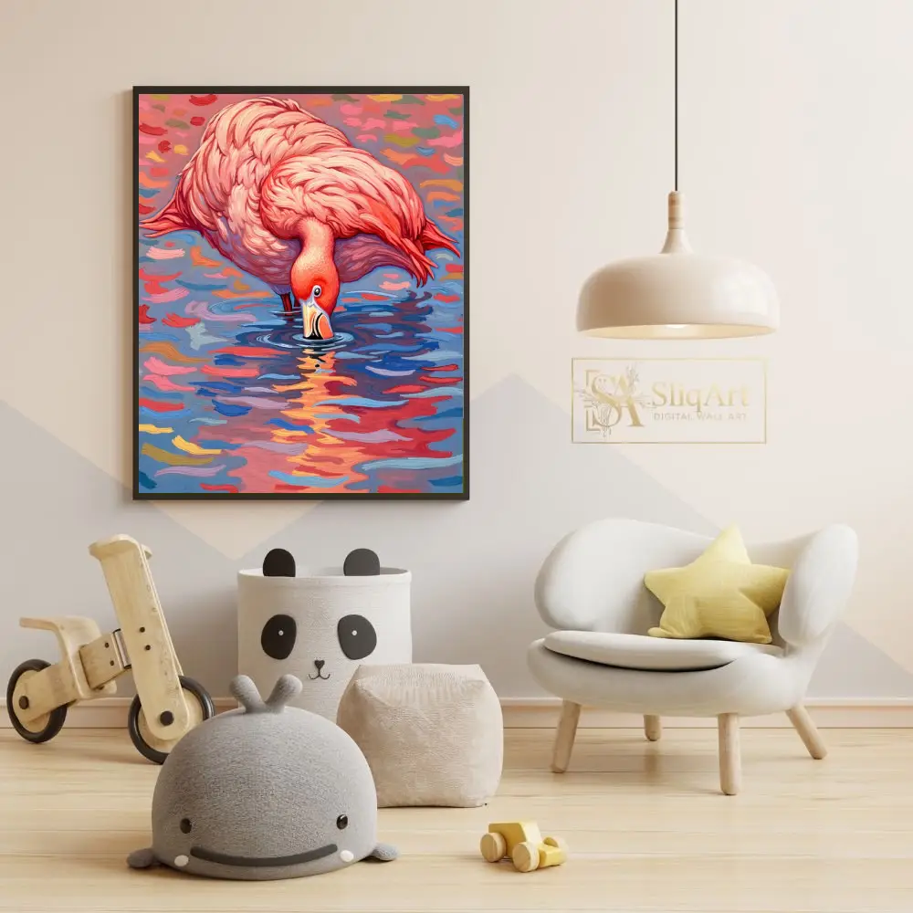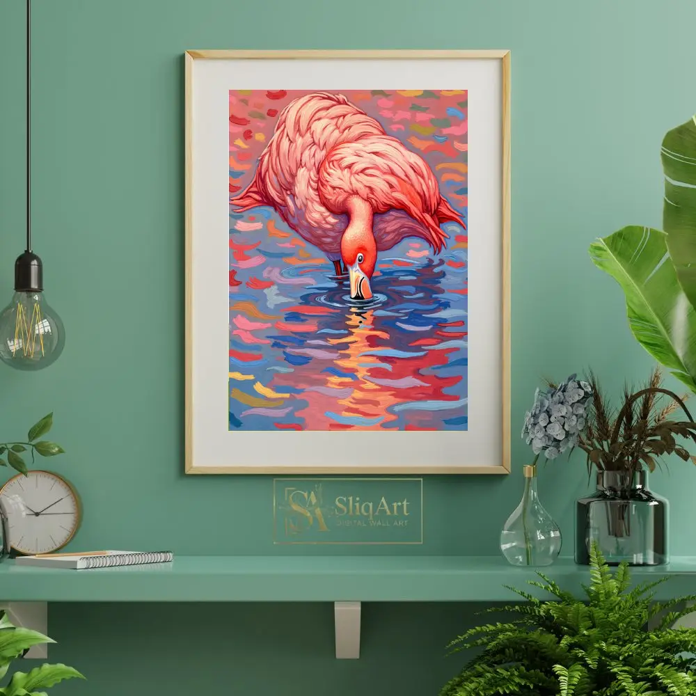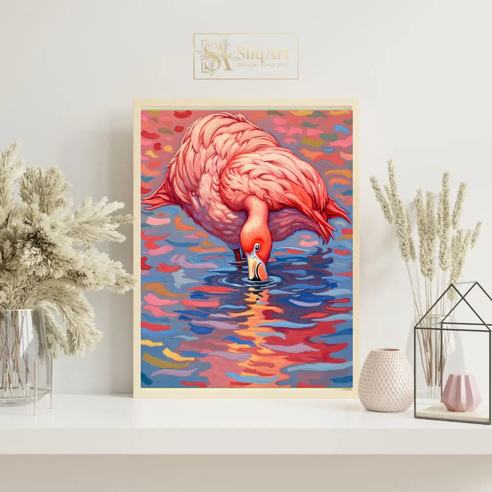 This stunning impressionist piece captures the elegant grace of a pink flamingo as it dips its beak into shimmering waters. The artist utilizes thick, expressive brushstrokes and a palette of coral pinks, deep blues, and warm yellows to create a sense of movement and texture.