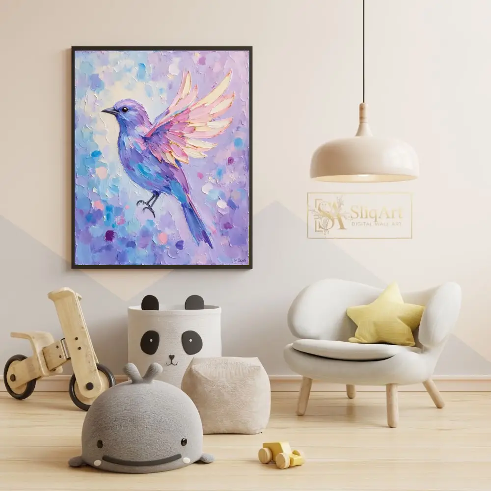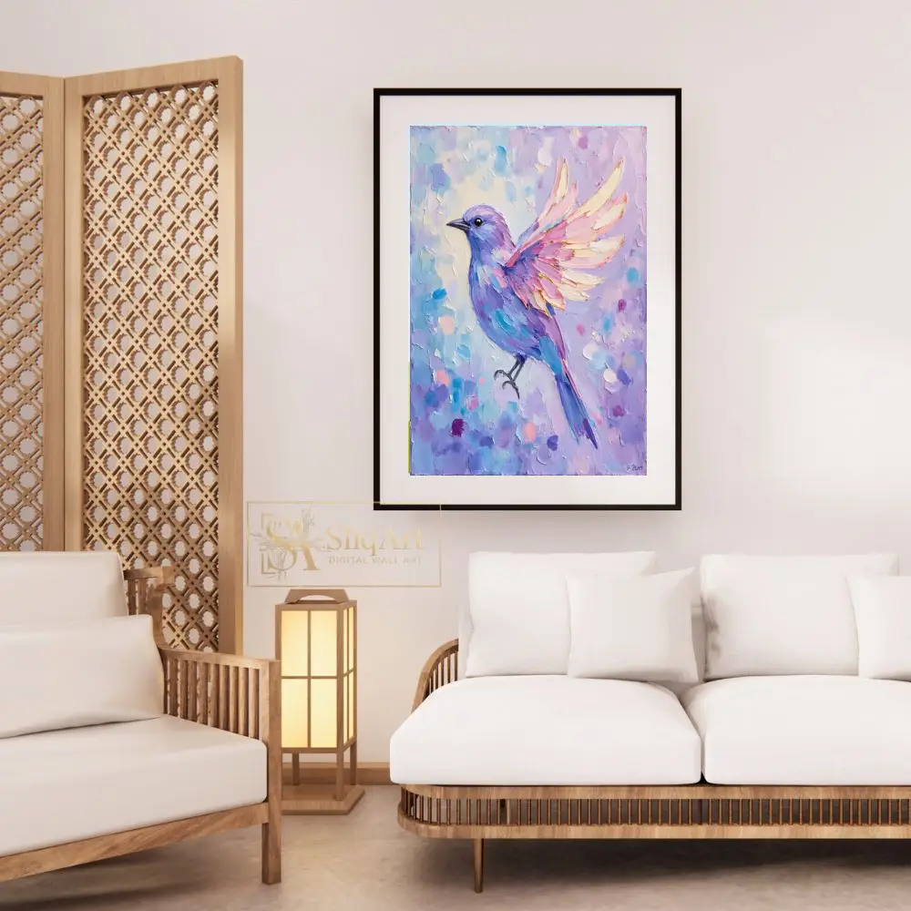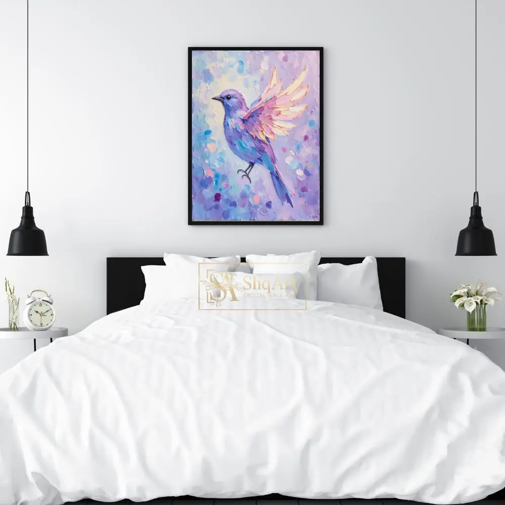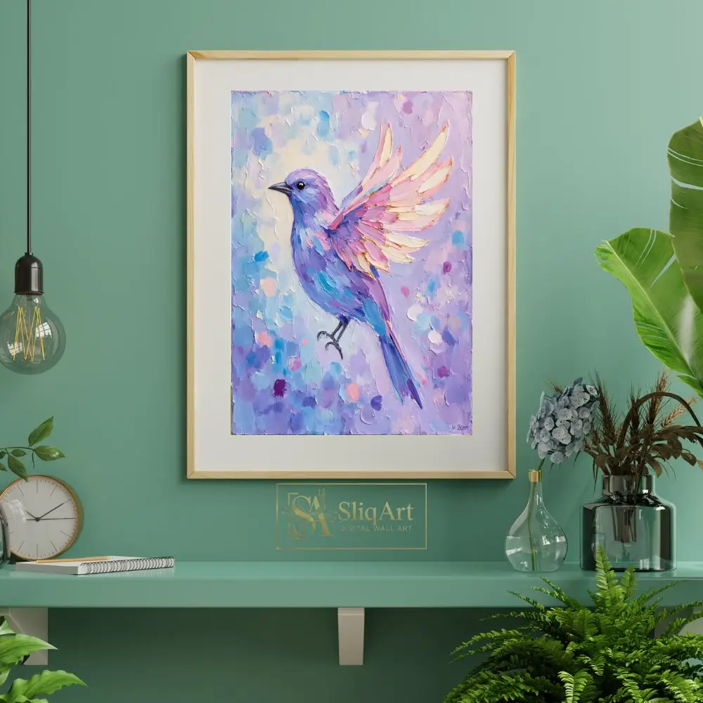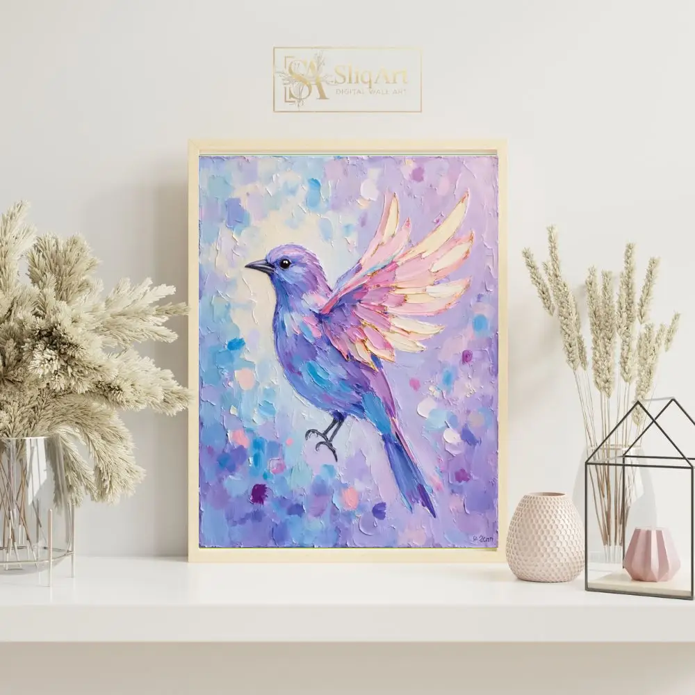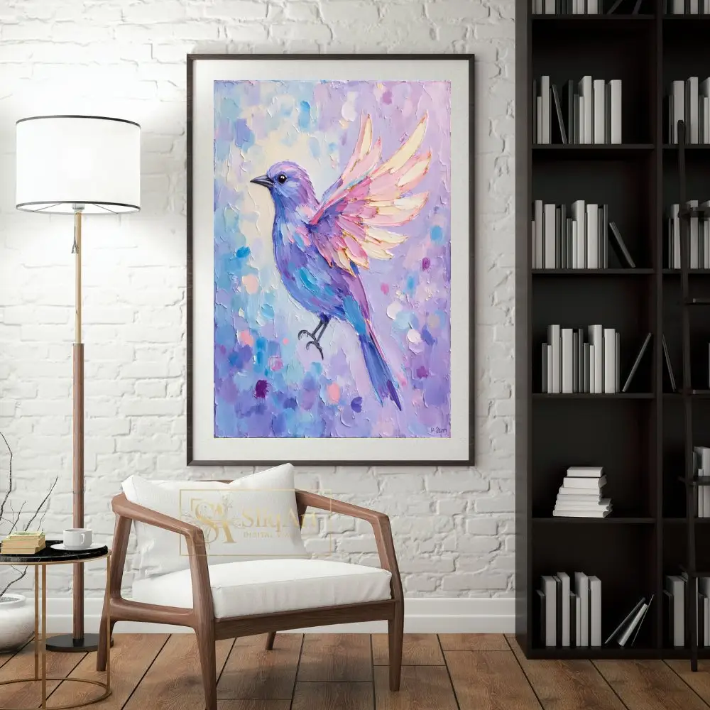 Elevate your interior with this captivating impressionist painting of a bird in mid-flight. Rendered with thick, expressive palette knife strokes, this piece features a dreamy palette of lavender, soft blue, and blush pink.