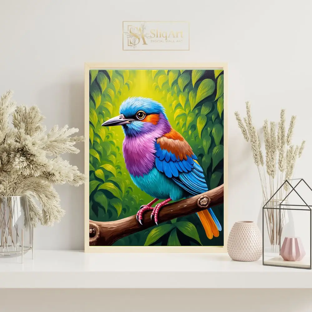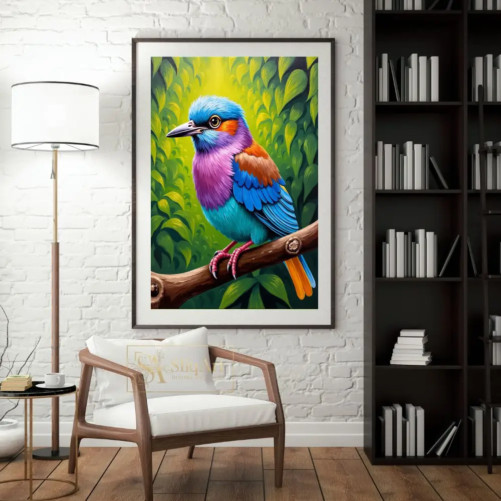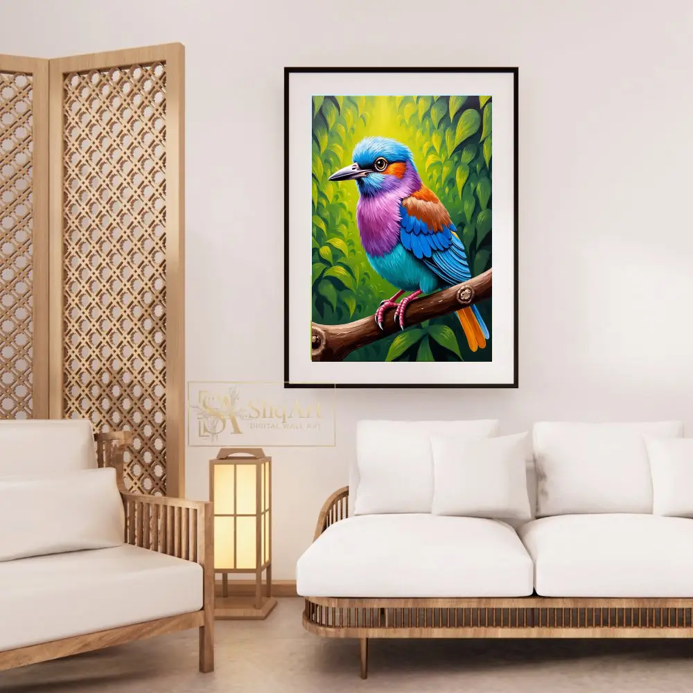 Transform your living space with this breathtakingly vibrant tropical bird wall art. Featuring a magnificent avian subject adorned in a spectrum of electric blues, radiant purples, and warm oranges, this piece captures the essence of exotic nature.