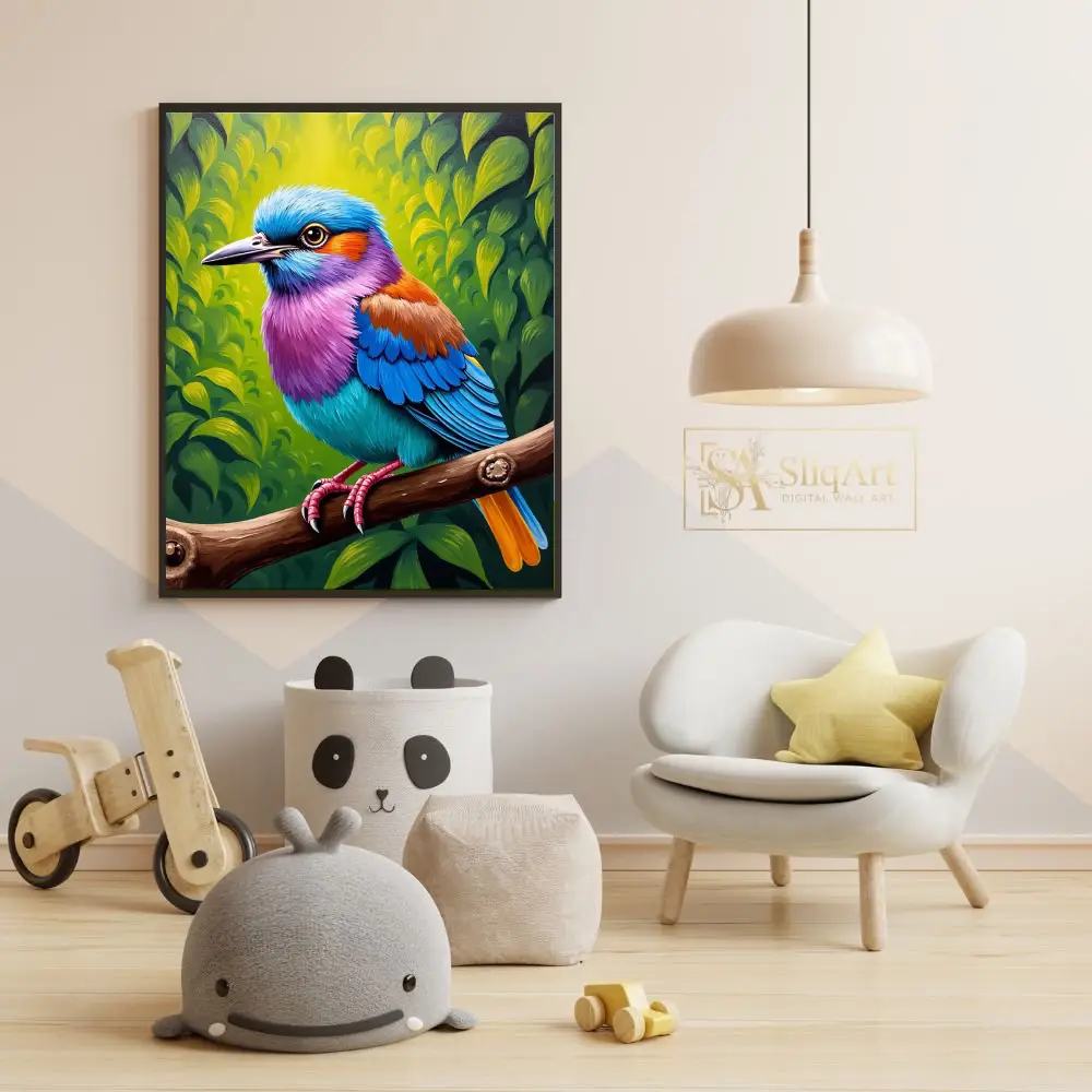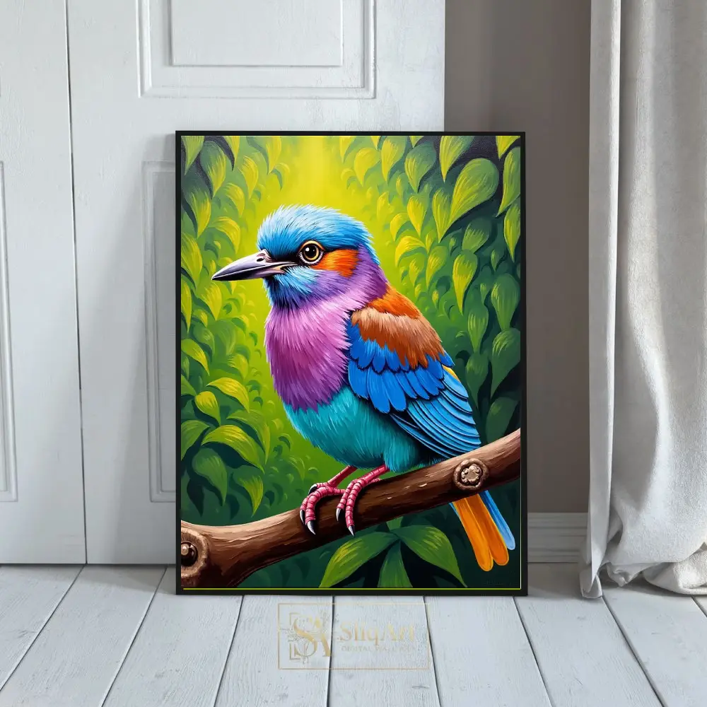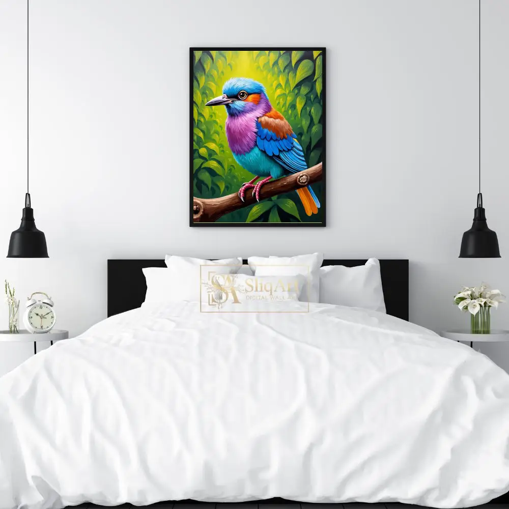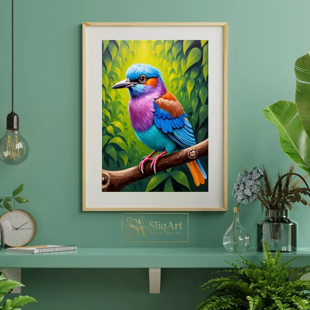 Transform your living space with this breathtakingly vibrant tropical bird wall art. Featuring a magnificent avian subject adorned in a spectrum of electric blues, radiant purples, and warm oranges, this piece captures the essence of exotic nature.