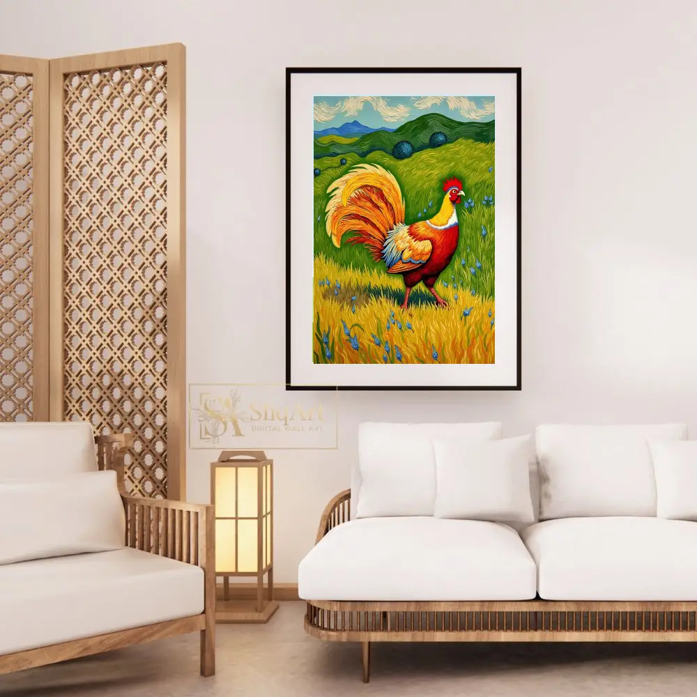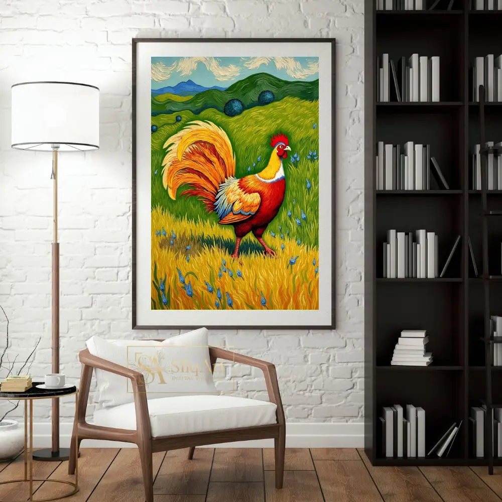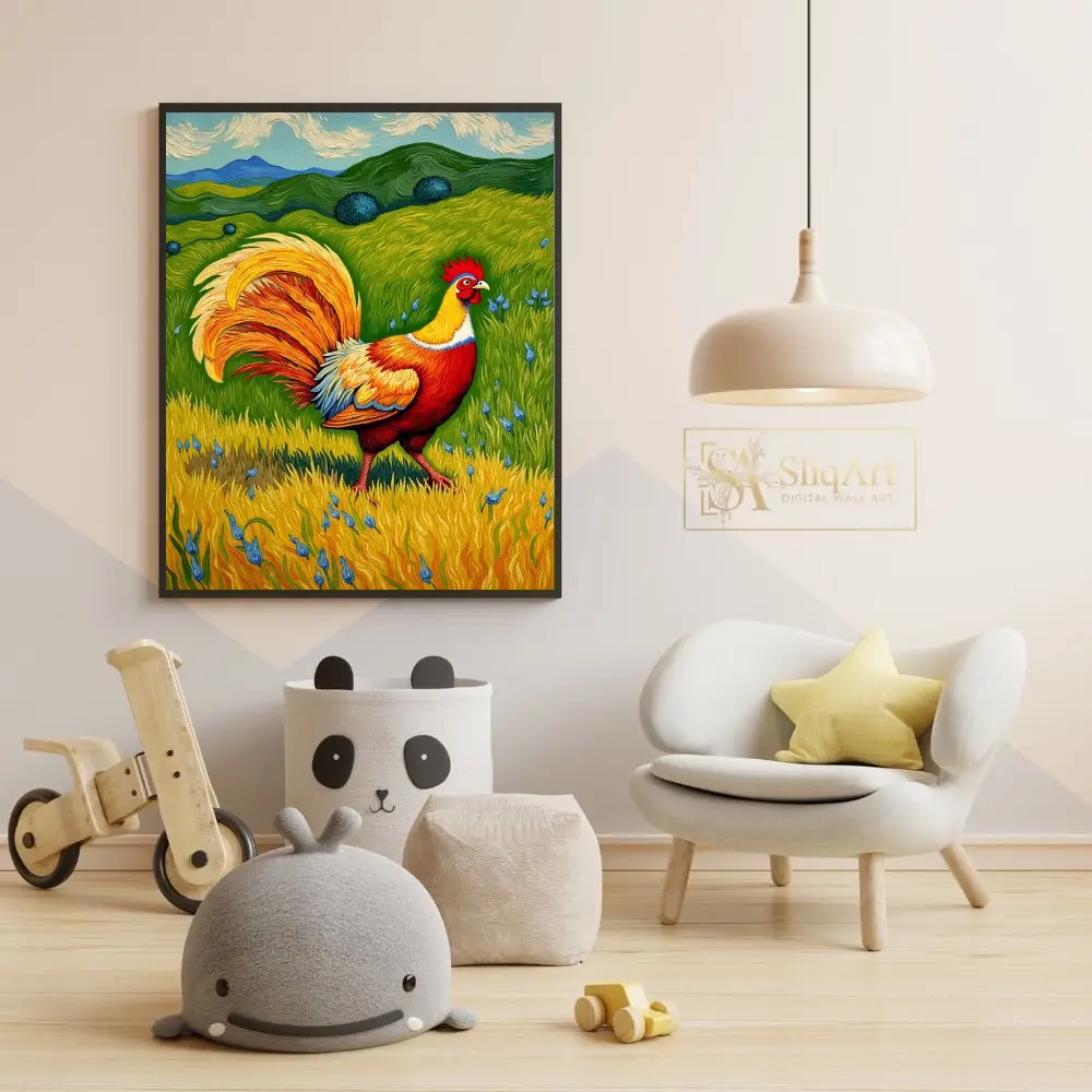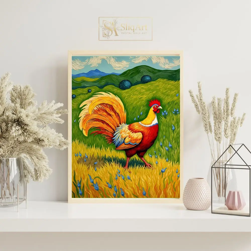 Infuse your space with the bold energy of the countryside with this striking rooster painting. Rendered in a stunning post-impressionist style, the artwork features a majestic rooster with fiery red, orange, and yellow plumage walking through a lush meadow.