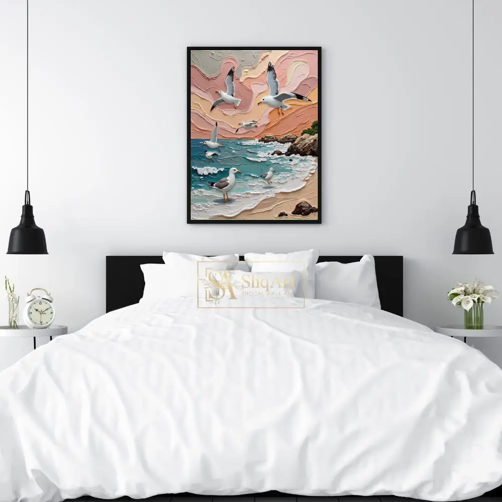 The palette is a sophisticated blend of dusty pinks, apricot oranges, and vibrant turquoise, creating a serene yet dynamic focal point. The tactile nature of the impasto technique adds a layer of modern luxury, making the movement of the birds and the sea feel almost tangible on your wall.