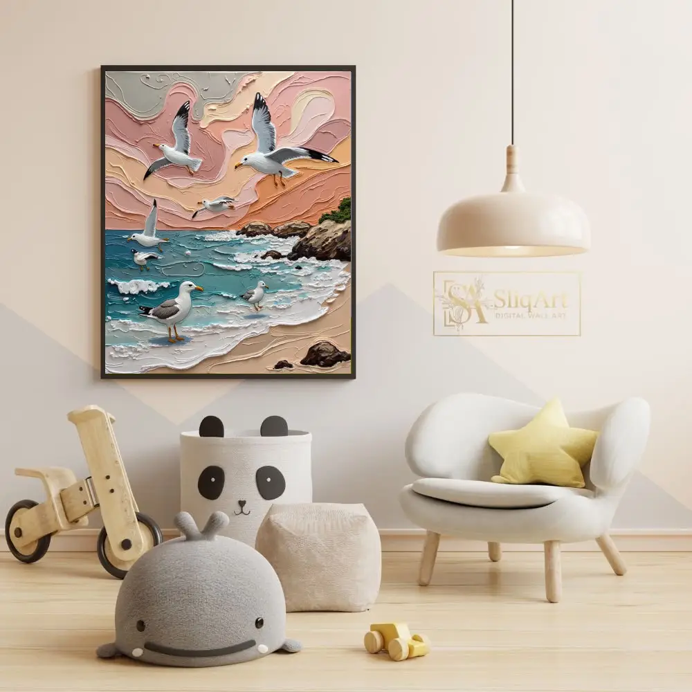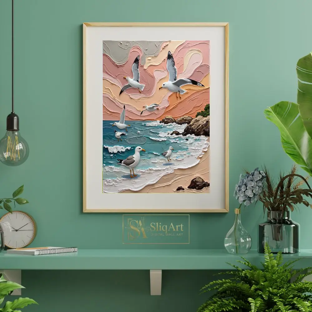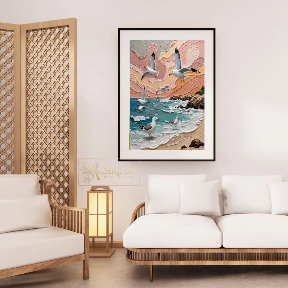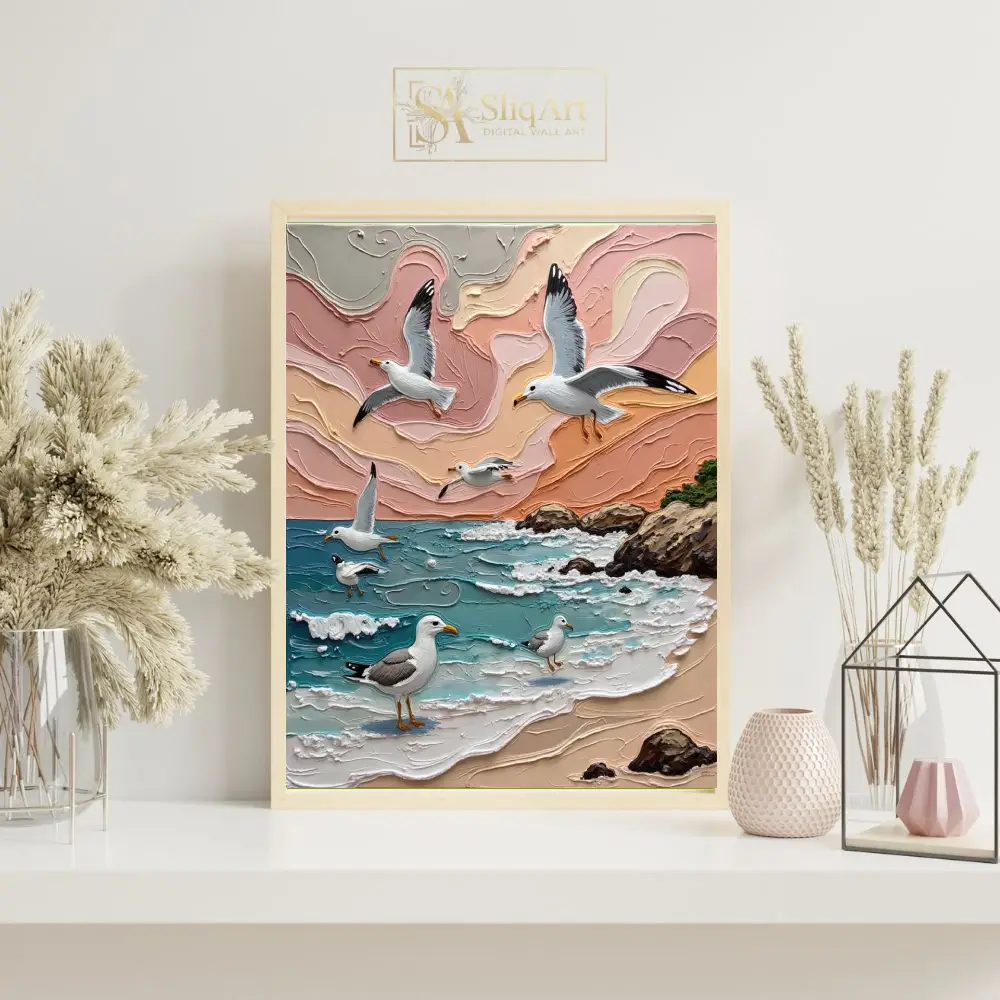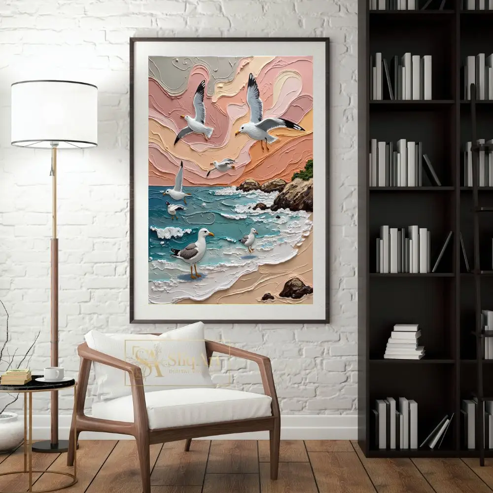 Transform your space into a seaside retreat with this stunning 3D textured impasto painting. Capturing the graceful flight of seagulls over a rhythmic ocean, this piece features heavy, sculptural brushstrokes that bring the crashing waves and swirling sunset clouds to life.