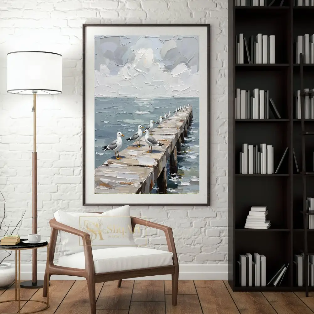 Bring the serene spirit of the shoreline into your home with this stunning impasto-style painting. ‘Coastal Calm’ features a line of seagulls perched peacefully along a weathered wooden pier, extending into a tranquil sea.