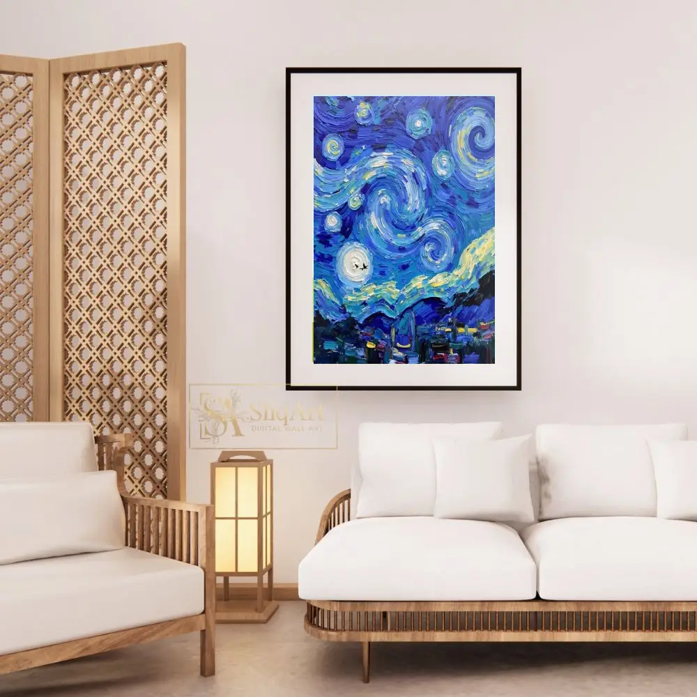 Transform your space with this captivating impasto-style painting that pays homage to the timeless beauty of a starry night. Featuring thick, rhythmic brushstrokes that create a palpable sense of movement, this piece depicts a swirling celestial sky in vibrant shades of blue and cerulean.