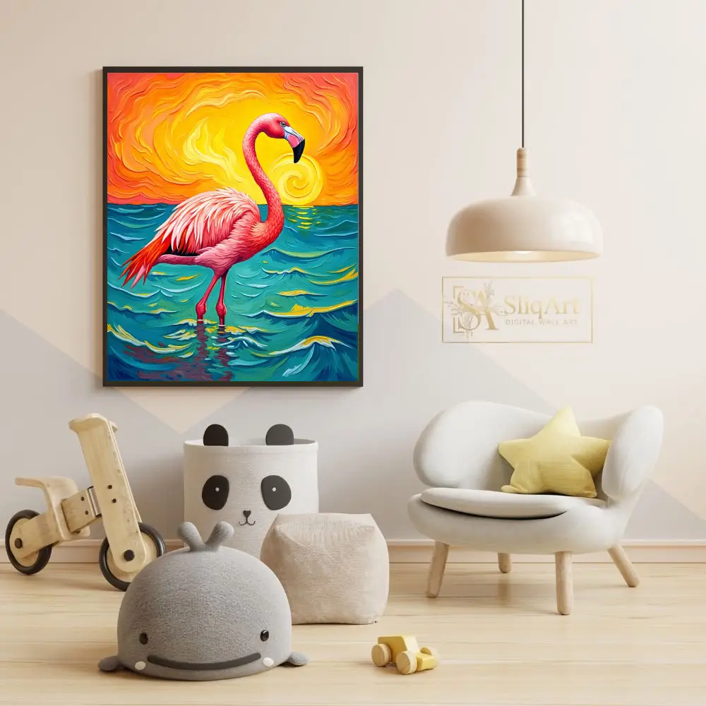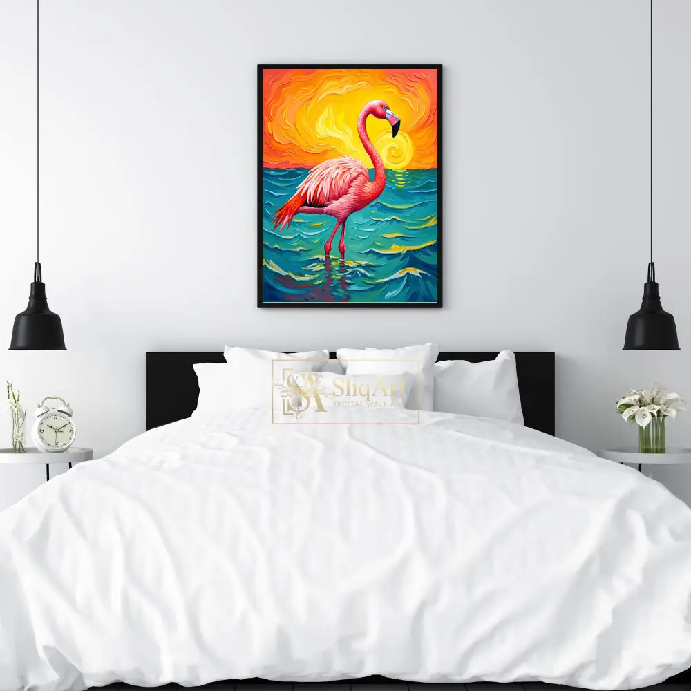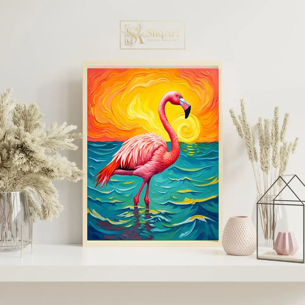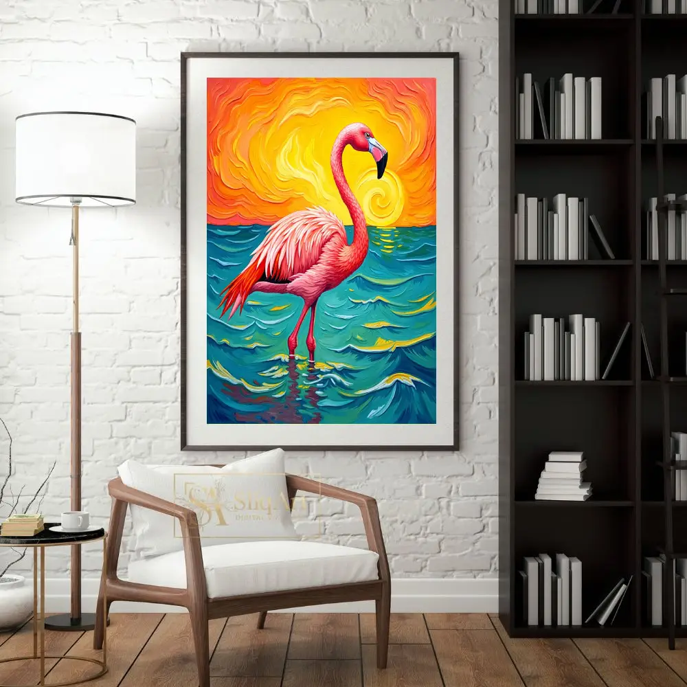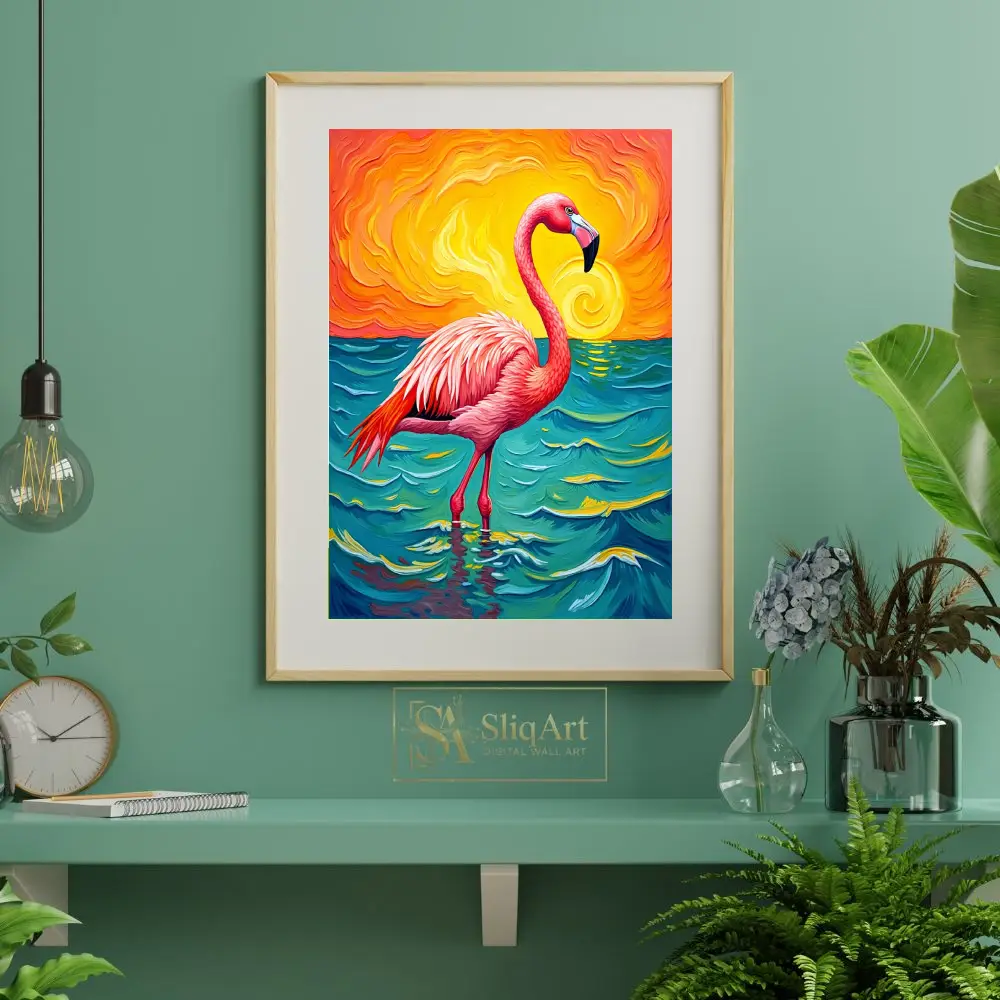 Transform your living space with this striking expressionist painting featuring a majestic pink flamingo. Set against a dramatic, swirling sunset of fiery oranges and yellows, the flamingo stands tall in deep teal and turquoise waters.