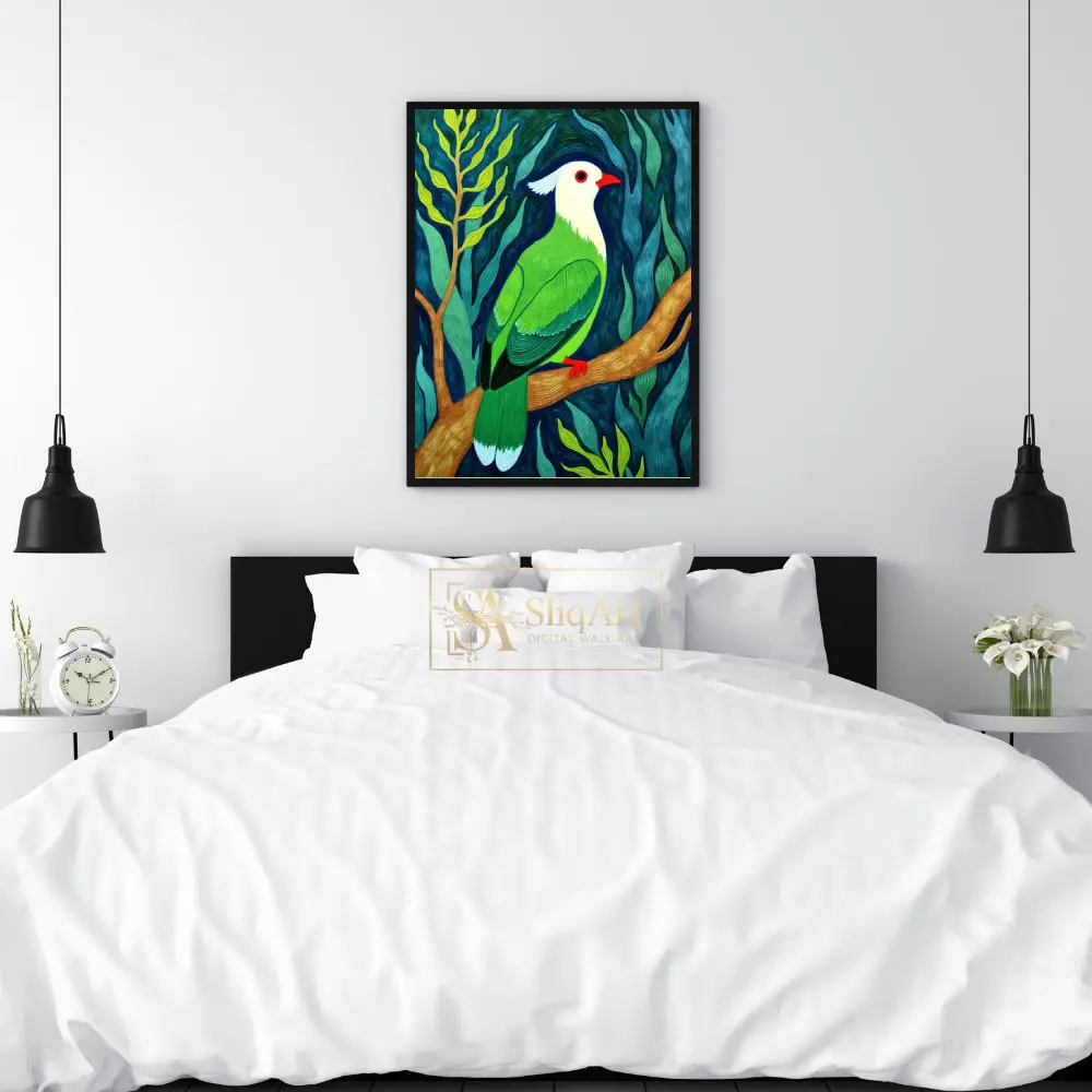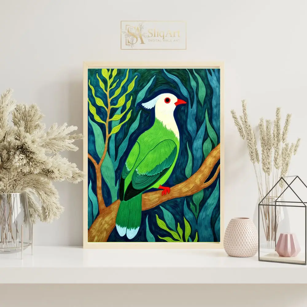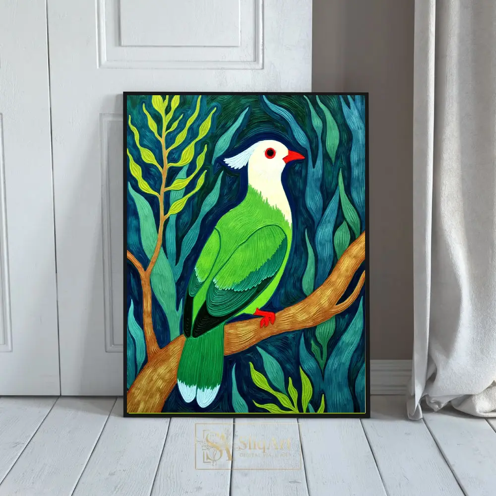 Transform your living space with this striking contemporary impasto painting of an exotic tropical bird. The artwork features a stunning white-headed bird with vivid emerald green plumage, perched gracefully upon a textured golden branch.